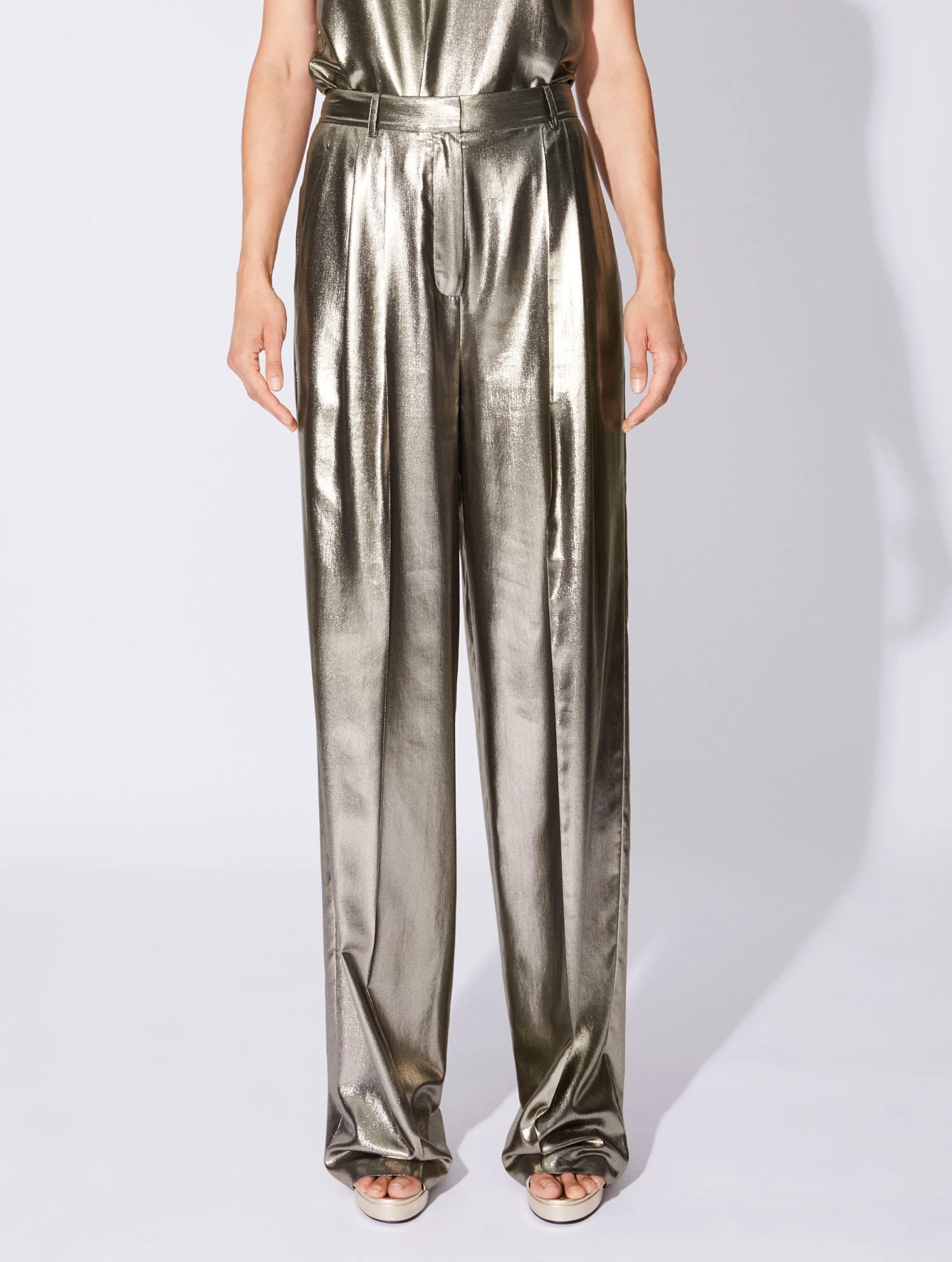 Ce pantalon fluide en lamé gold doublé satin vous séduira pour vos plus belles soirées et cérémonies d’été. Sa jambe large à pli marqué élance l’allure tandis que sa patte de boutonnage cachée permet de faire des jeux de lumière et de volume de ce pantalon le centre de l’attention. Des passants taille vous proposent de porter ce pantalon large ceinturé ou de le laisser se poser sur les hanches. Poches italiennes et poches dos passepoilées promettent un porté seyant pour ce pantalon lamé à associer au caraco doré assorti.
