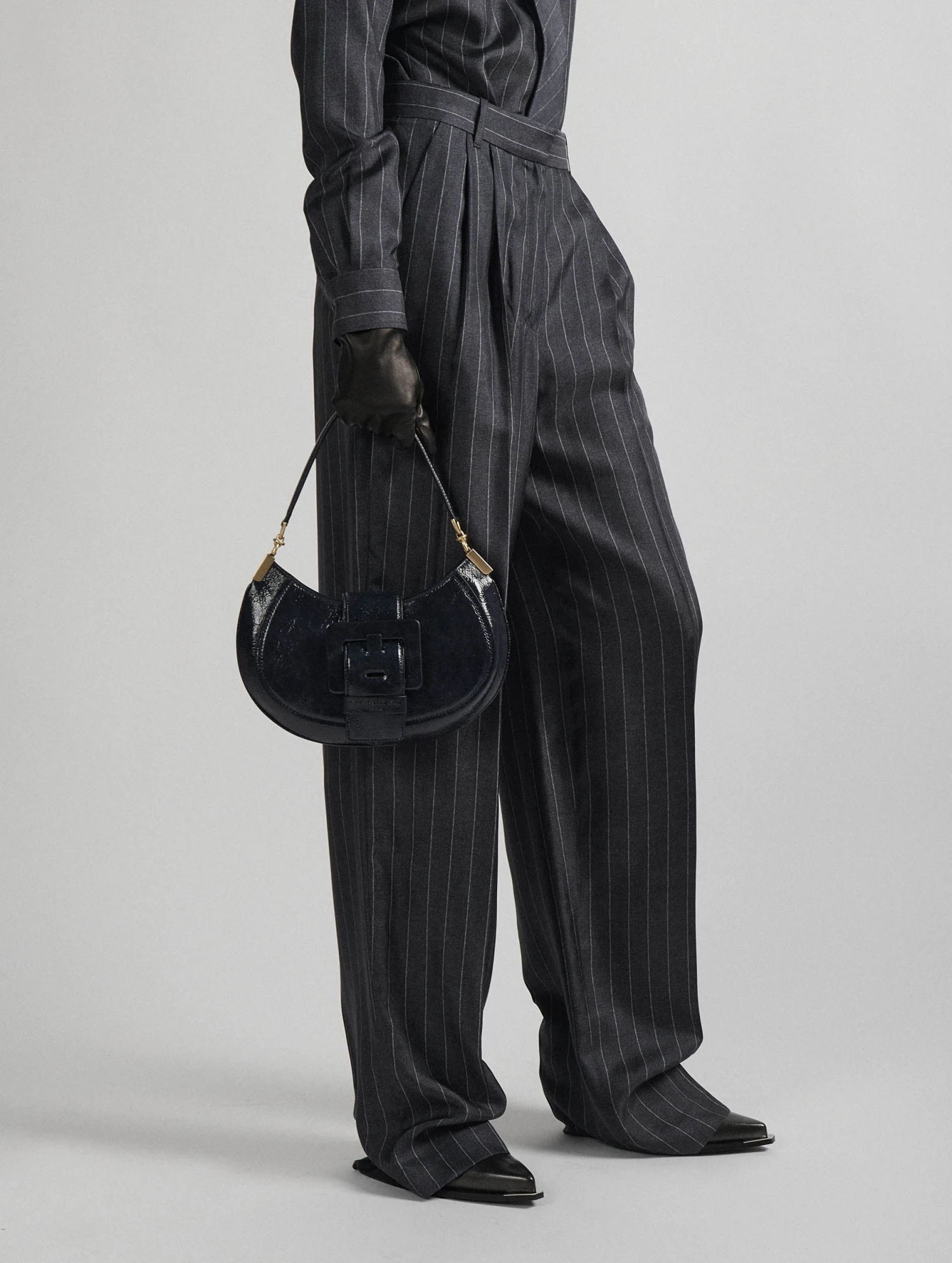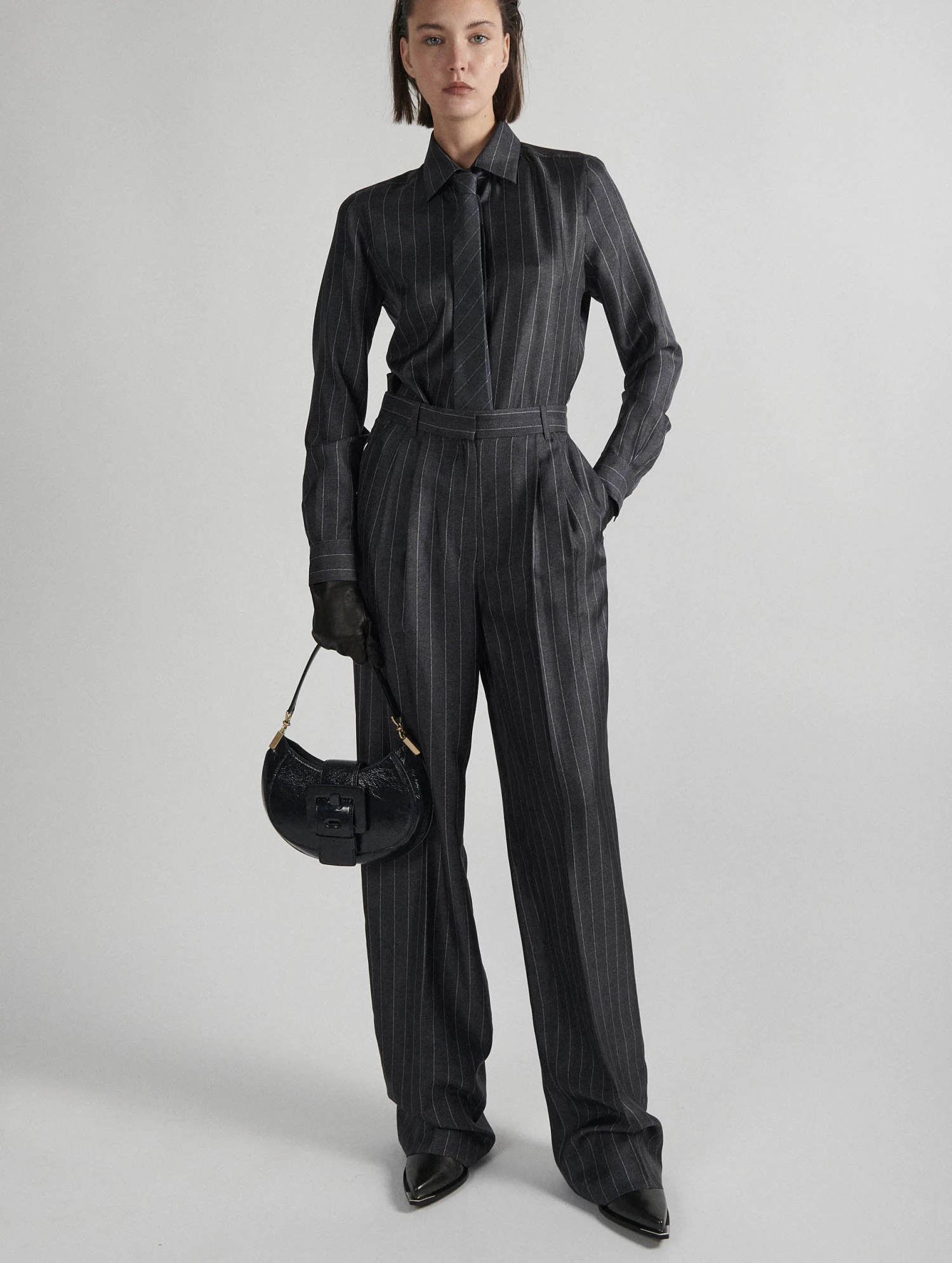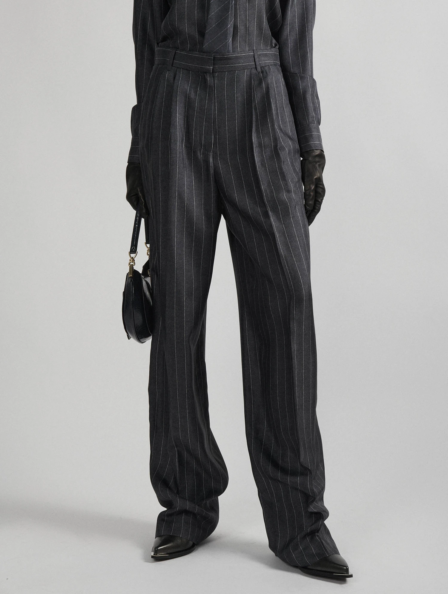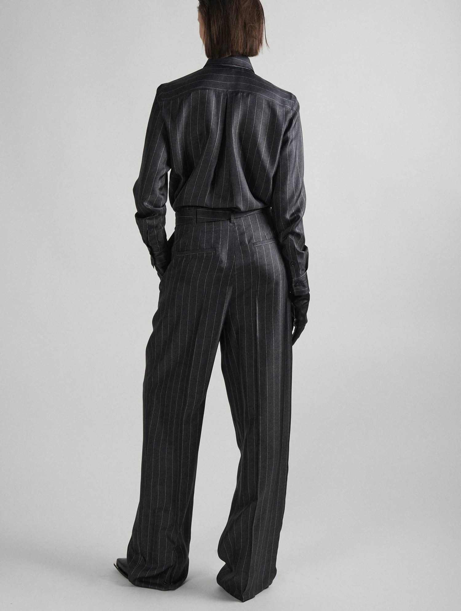 Imprimé à la façon d’une flanelle de laine rayée, ce pantalon gris à fines rayures est réalisé dans une étoffe fluide et soyeuse : un twill de soie véritable. Ses jambes larges soulignées par un pli marqué jouent sur les volumes pour une silhouette boyish retravaillée. Poches italiennes, poches dos passepoilées, passants ceinture et patte de boutonnage cachée soulignent l’art du tailoring propre à Barbara Bui. Pour une allure boyish féminisée, Barbara Bui associe ce pantalon à la chemise assortie portée avec une cravate ton sur ton : allure working girl assurée !