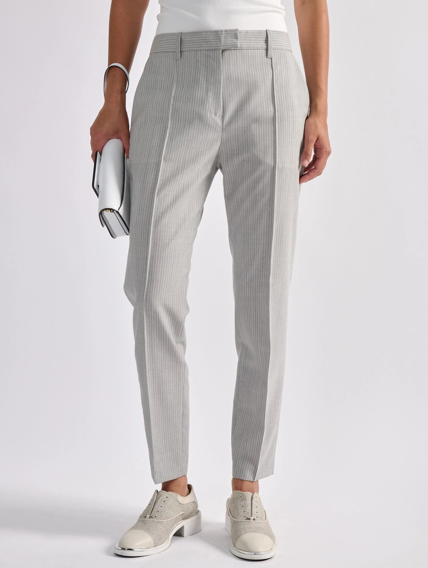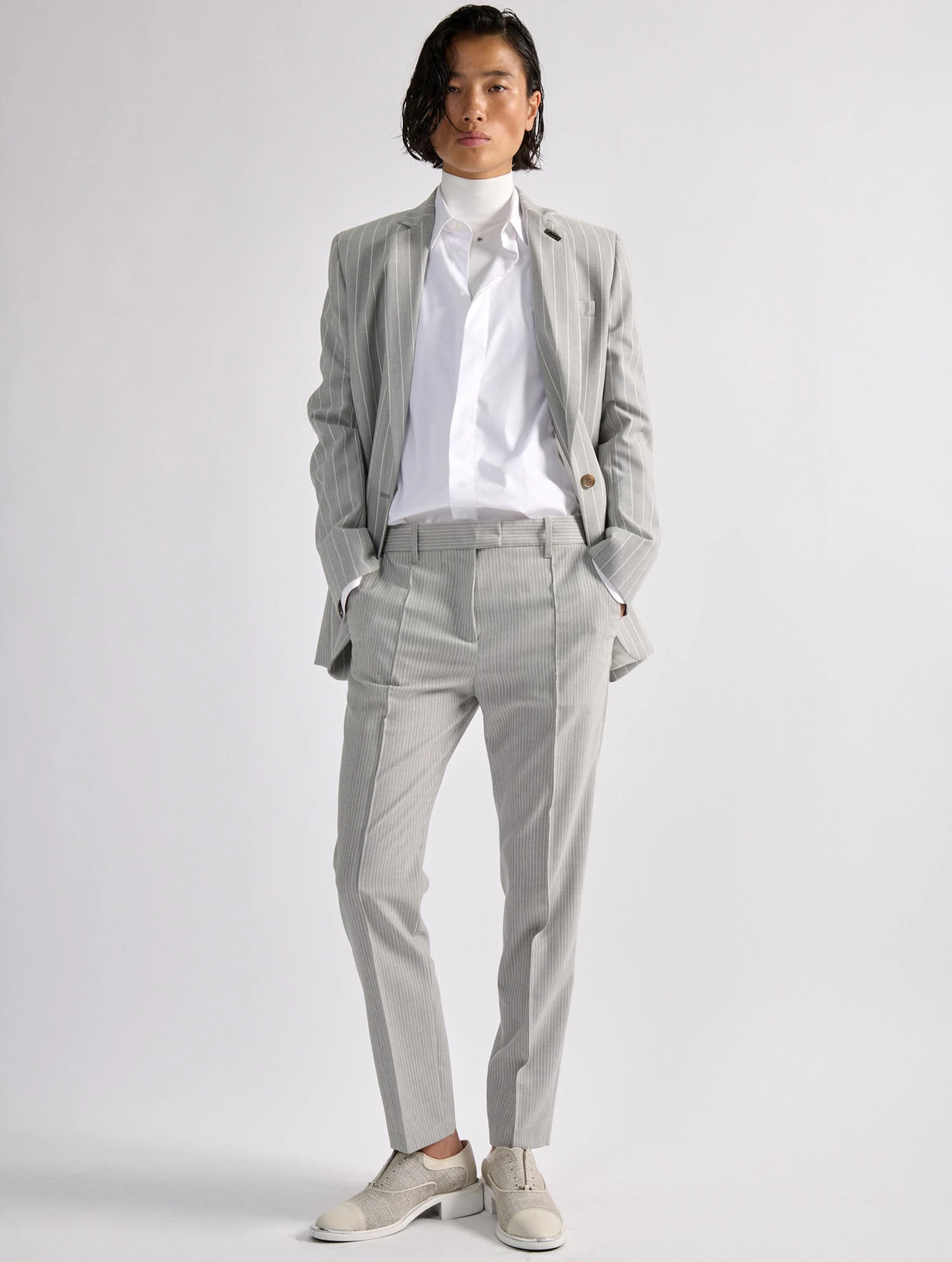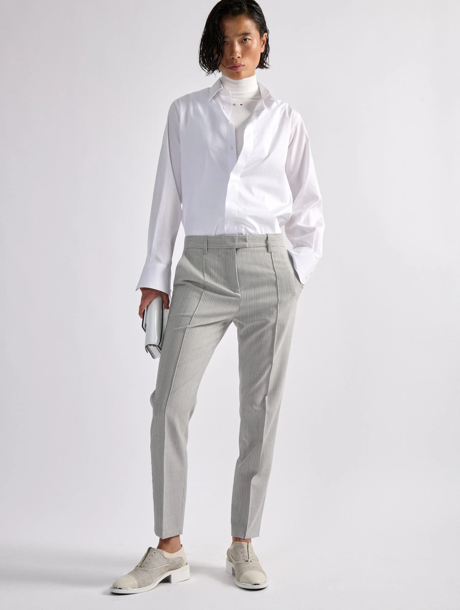 L’inimitable pantalon de costume Roxy s’accorde aux propositions tailoring imaginées par Barbara Bui pour le printemps-été. Toujours doté d’élégants plis marqués, ce pantalon coupe droite à fines rayures tennis affine la silhouette grâce à sa longueur 7/8. Pour un total look en costume-trois-pièces, associez ce modèle au gilet de costume et à la veste assortis ou osez l’esprit boyish féminisé à l’aide d’une chemise en popeline et d’une paire de derbies.