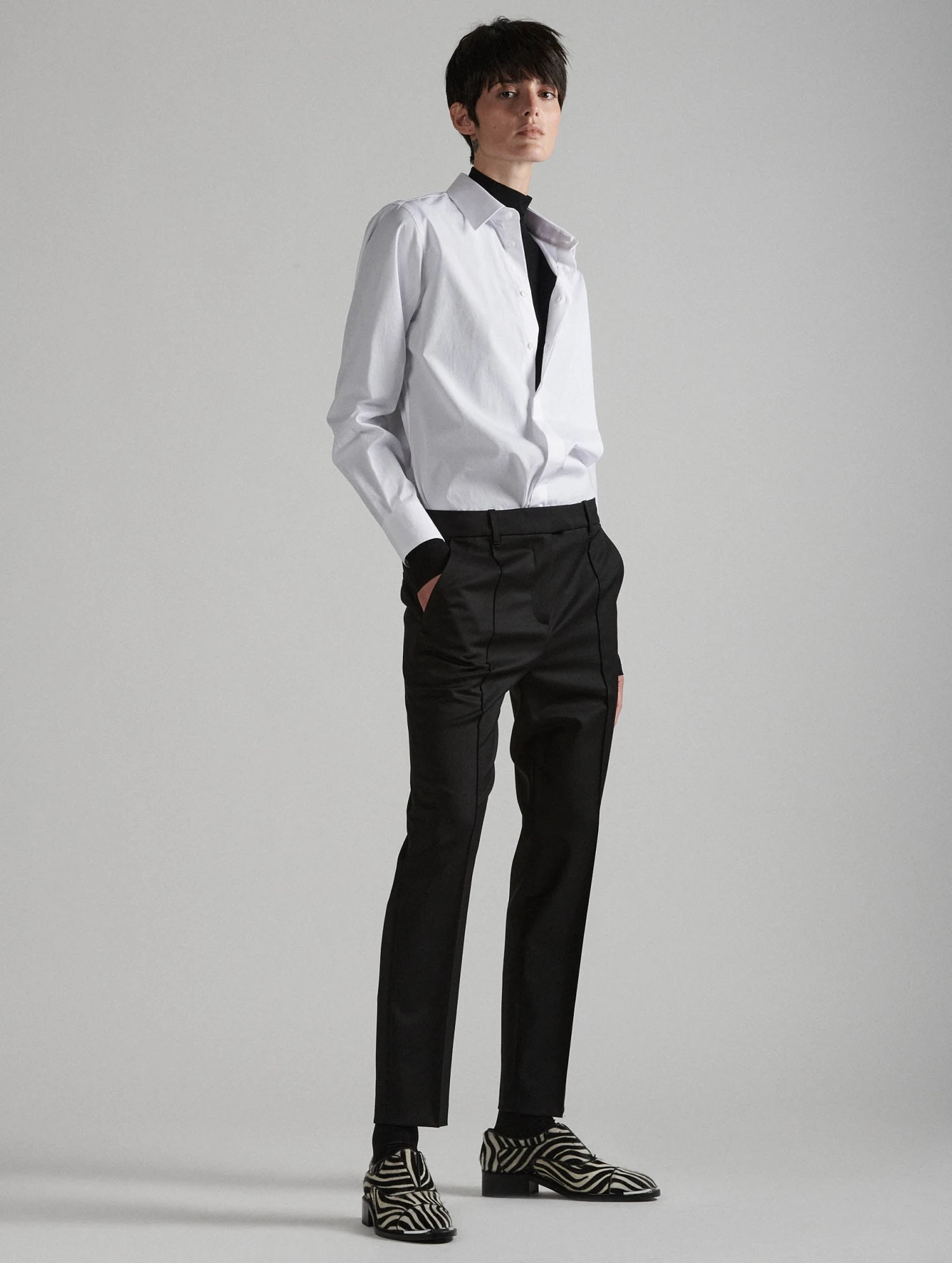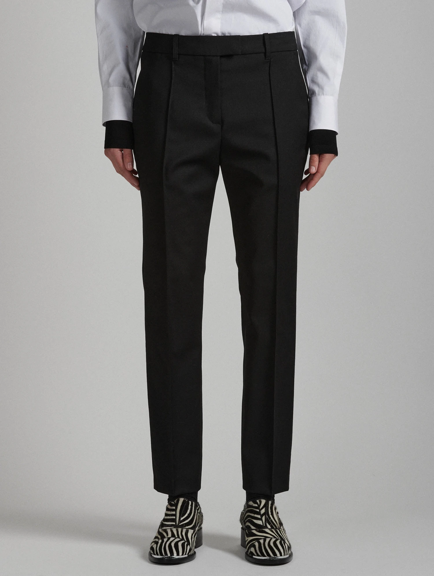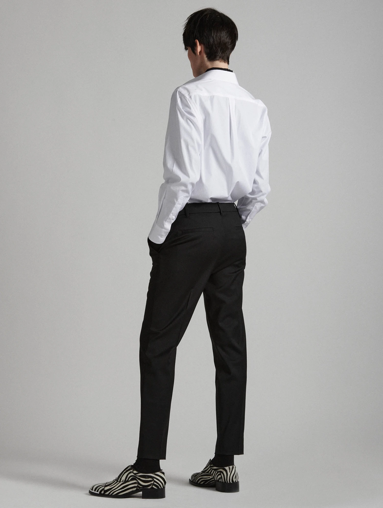 Plébiscité par nos clientes saison après saison, notre pantalon de costume Roxy est décliné dans une gabardine de laine stretch confortable au tombé irréprochable dans un noir intemporel ou un élégant coloris bleu. Porté avec la veste de costume et le gilet sans manches assortis en costume-trois-pièce féminisé ou associé à une chemise en popeline en layering sur nos pièces en maille fine, ce pantalon assure une silhouette aux proportions maitrisées. Poches passepoilées, poches italiennes et patte de boutonnage cachée assurent un tombé seyant à ce pantalon féminin.