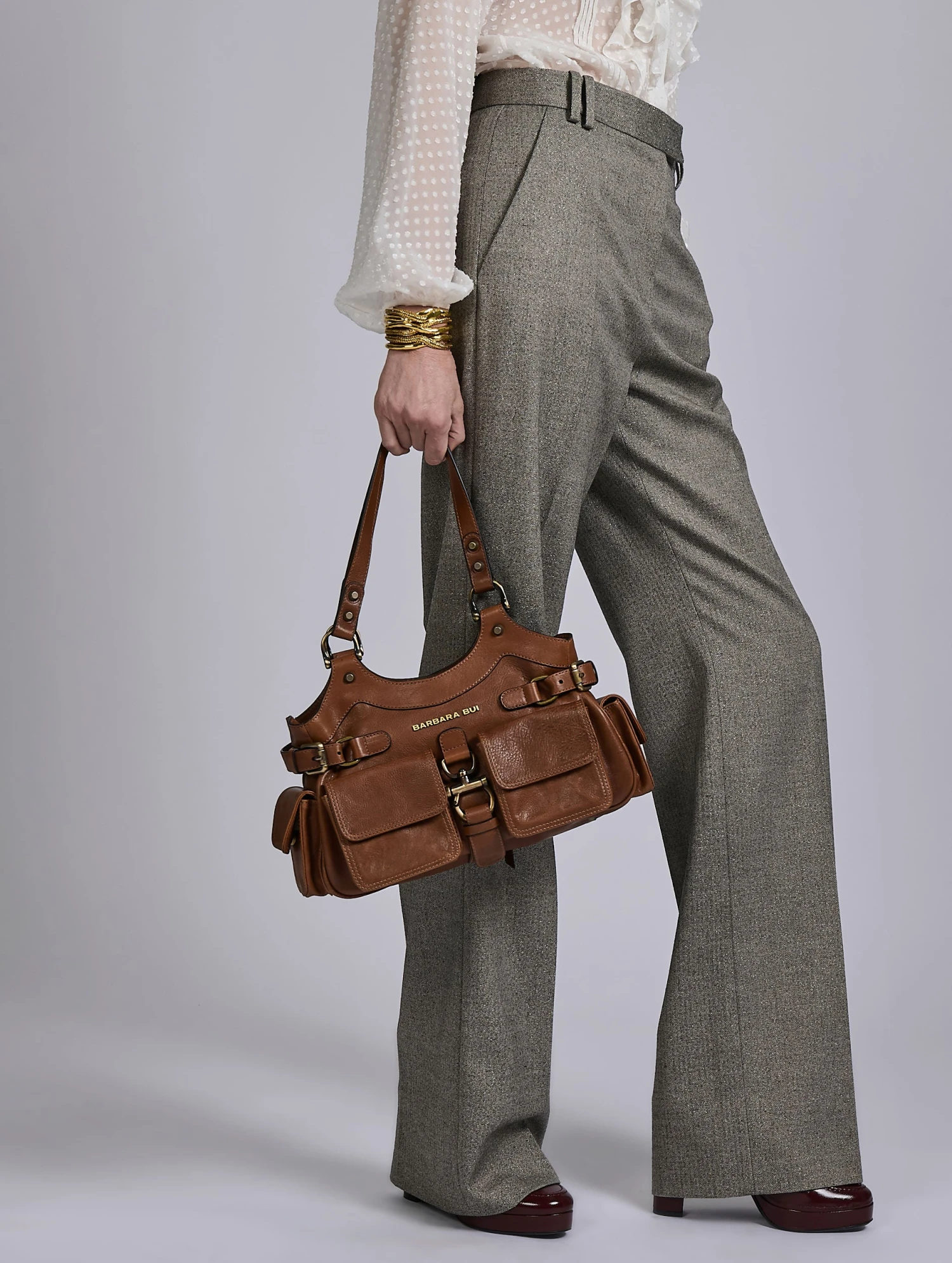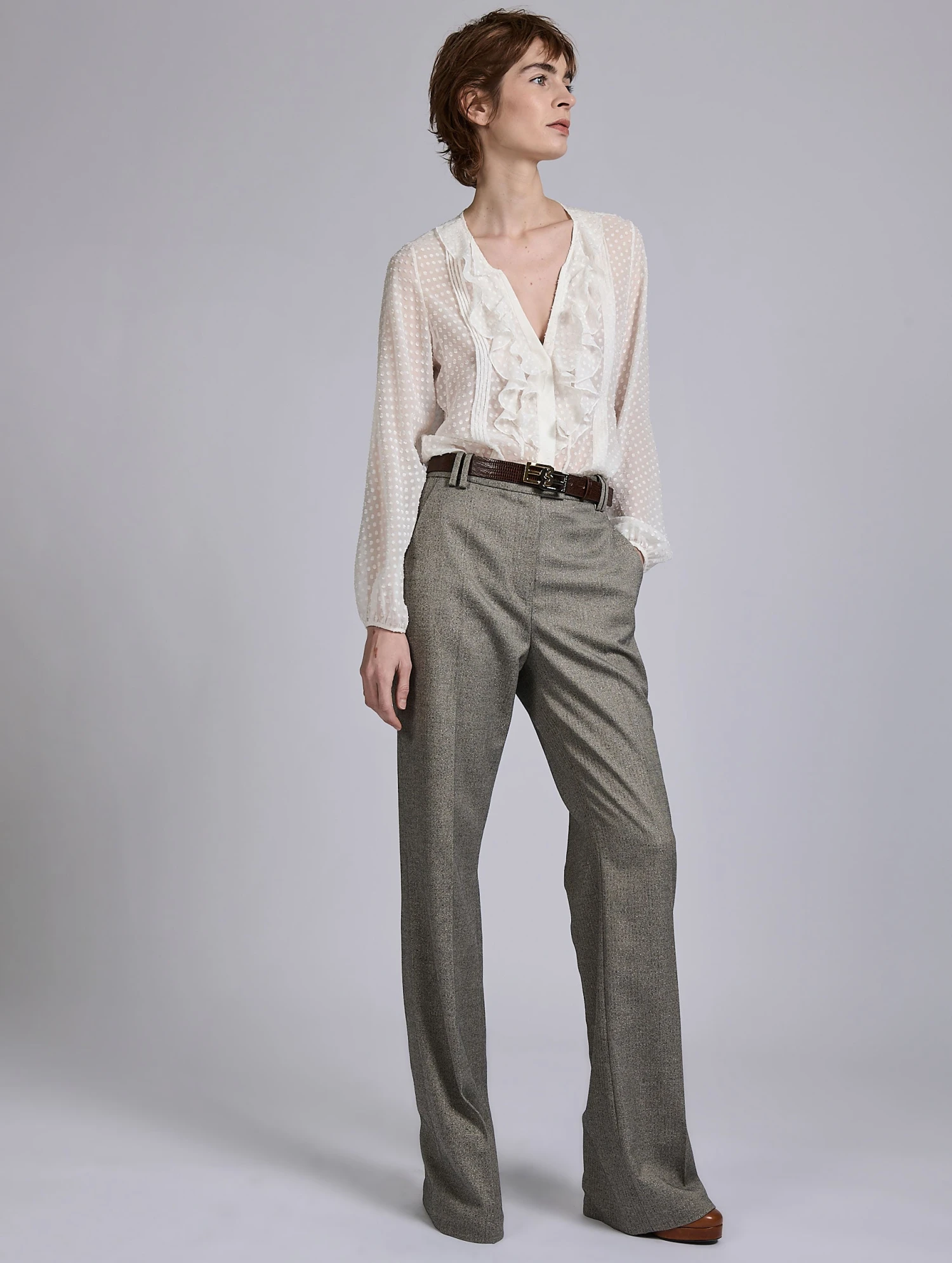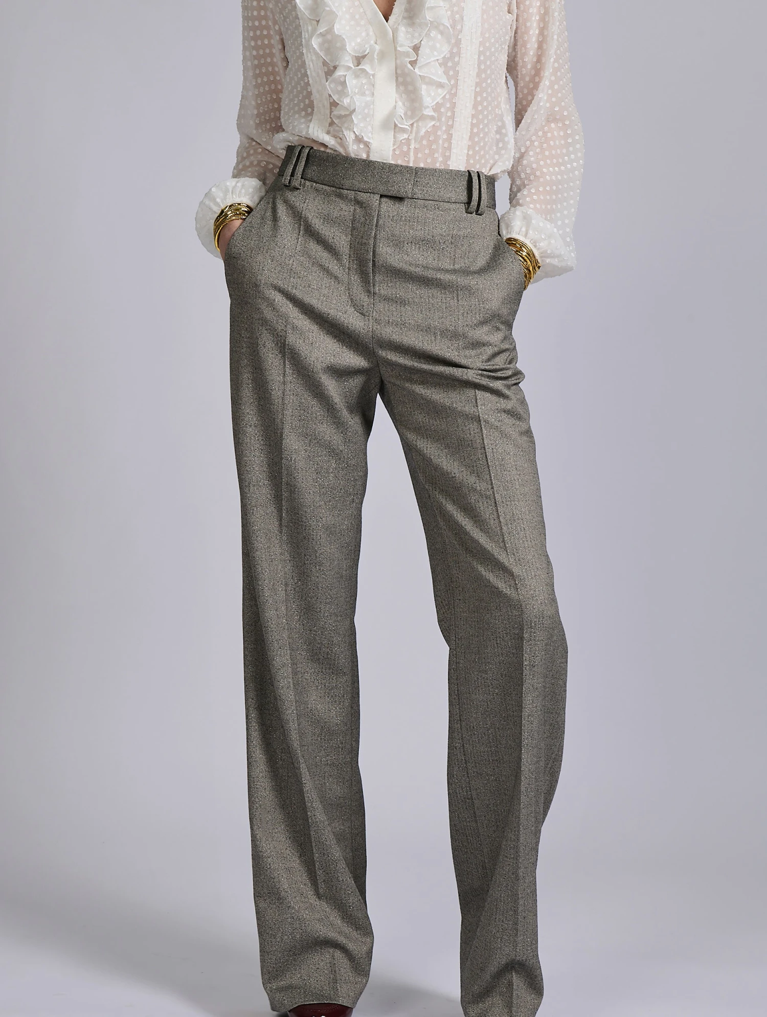 Pour une attitude décontractée en toute élégance, Barbara Bui a associé une étoffe grise à micro-motifs chevrons lurex à une coupe taille haute à jambes larges. Porté en costume-trois-pièces féminisé avec le gilet de costume et la veste coordonnés, ou simplement avec une blouse féminine, ce pantalon femme se prête à toutes les occasions. Un pli marqué le long de la jambe ajoute à la structure de ce modèle aux finitions soignées, comme son double jeu de passants permettant d’y glisser la ceinture de votre choix.