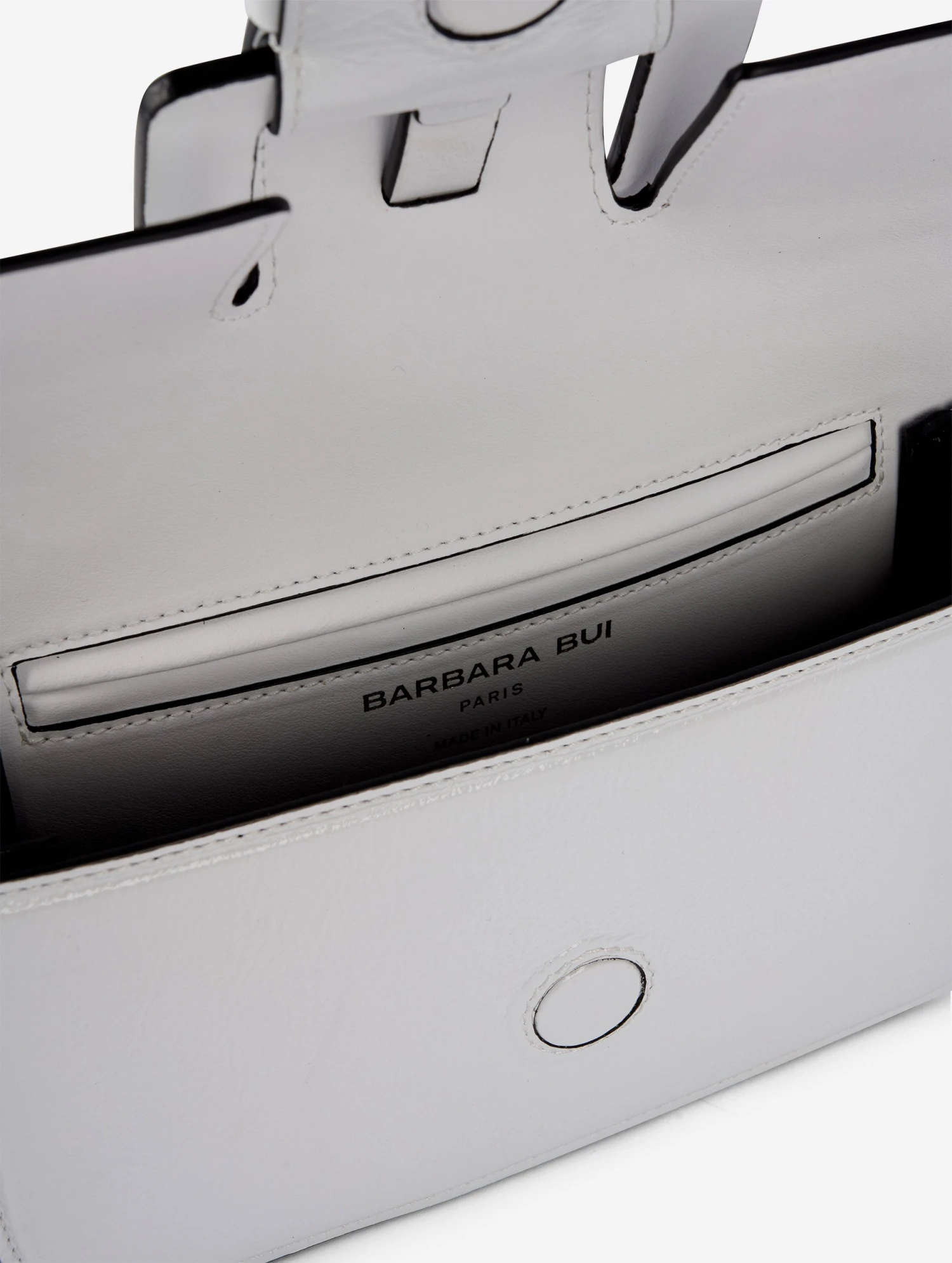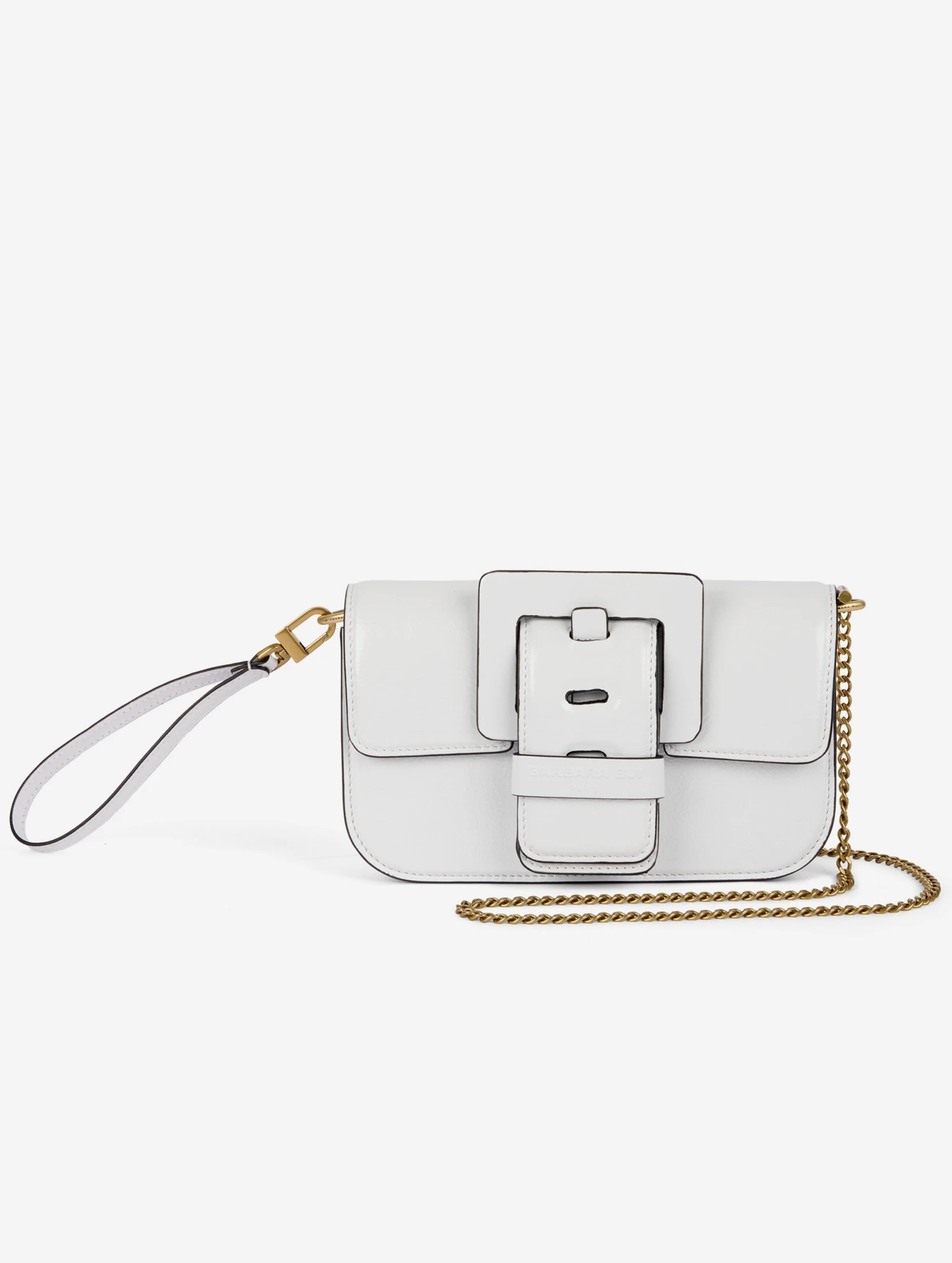 Sac « LIKE ME » en cuir verni naplak blanc effet froissé. La bandoulière en chaîne gourmette de 100 cm et la dragone cuir sont amovibles pour changer les modes de porté. Maxi boucle décorative en cuir renforcé sur le rabat à fermoir magnétique. Poche dos idéale pour garder son smartphone sous la main et poche intérieure. Hauteur: 12,5cm – Largeur: 21cm – Profondeur: 4,5cm.