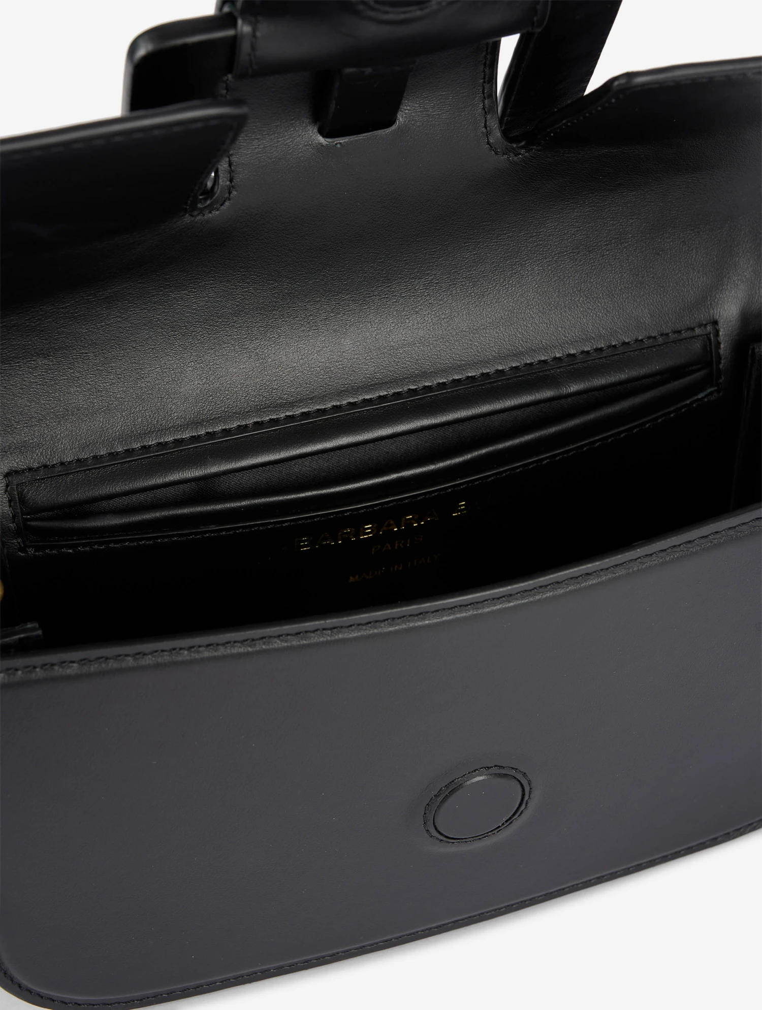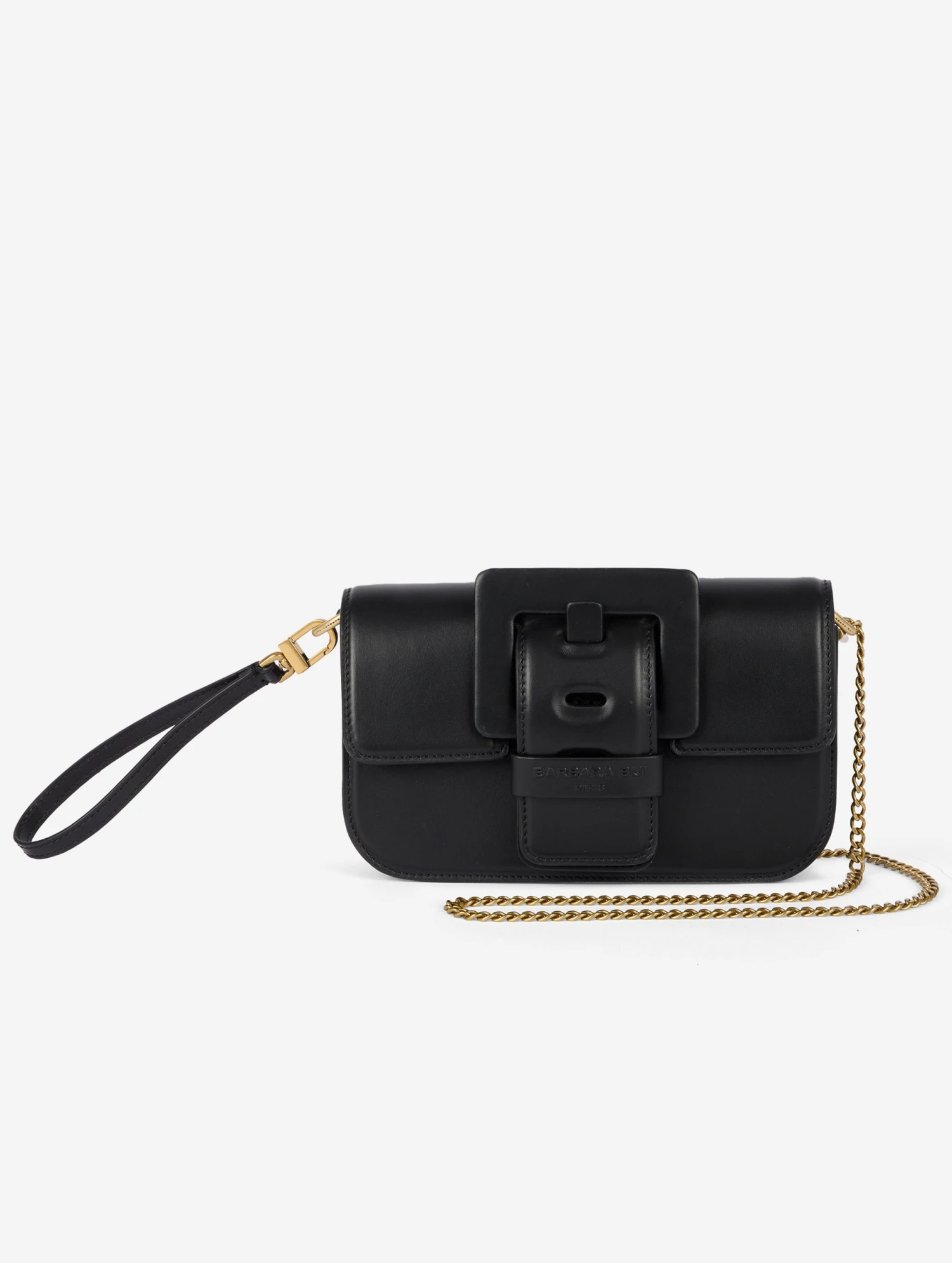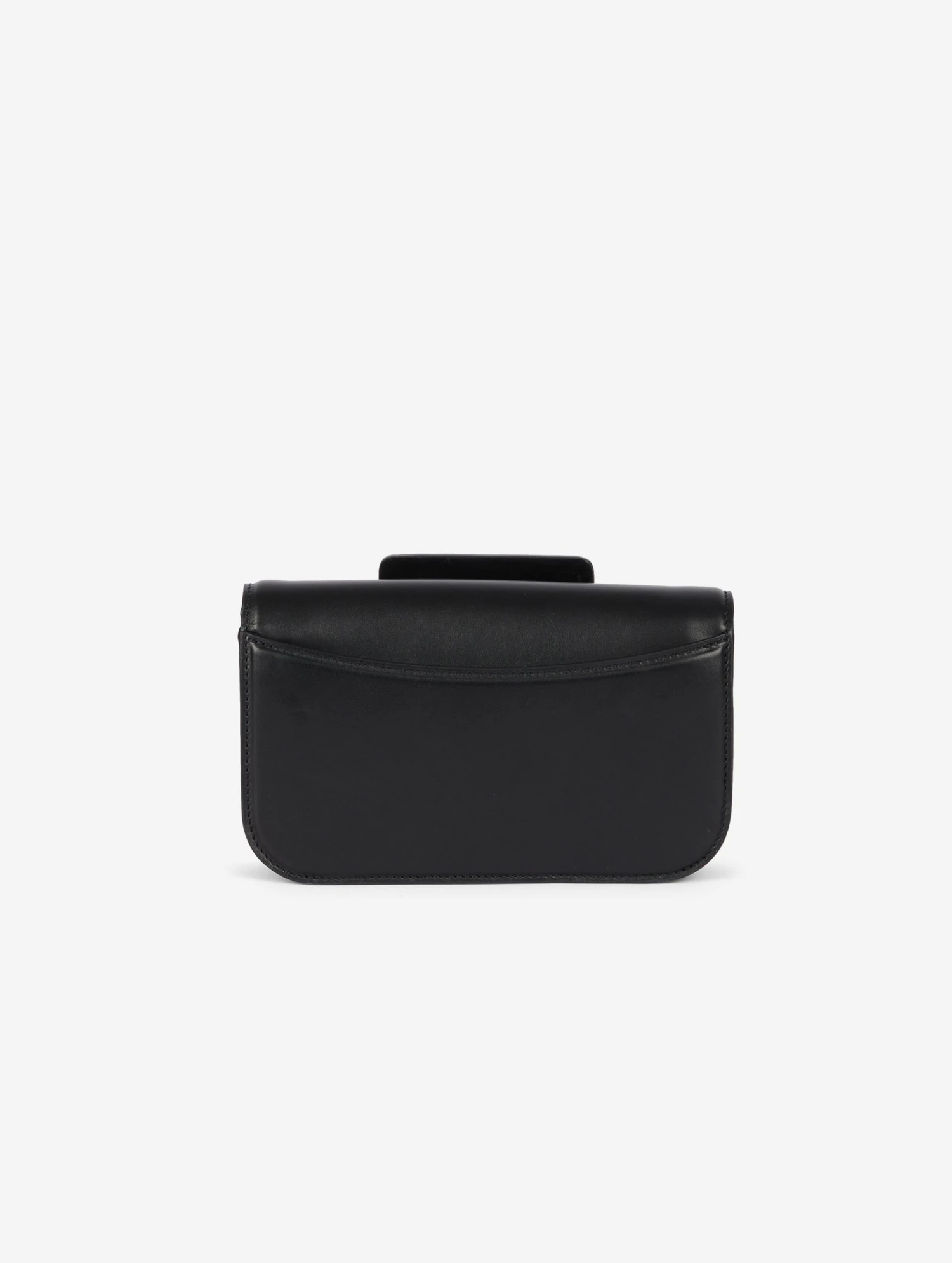Sac « LIKE ME » en veau satiné noir. La bandoulière en chaîne gourmette de 100 cm et la dragonne cuir sont amovibles pour changer les modes de porté. Maxi boucle décorative en cuir renforcé sur le rabat à fermoir magnétique. Poche dos idéale pour garder son smartphone sous la main et poche intérieure passepoilée. Hauteur: 12,5cm – Largeur: 21cm – Profondeur: 4,5cm.