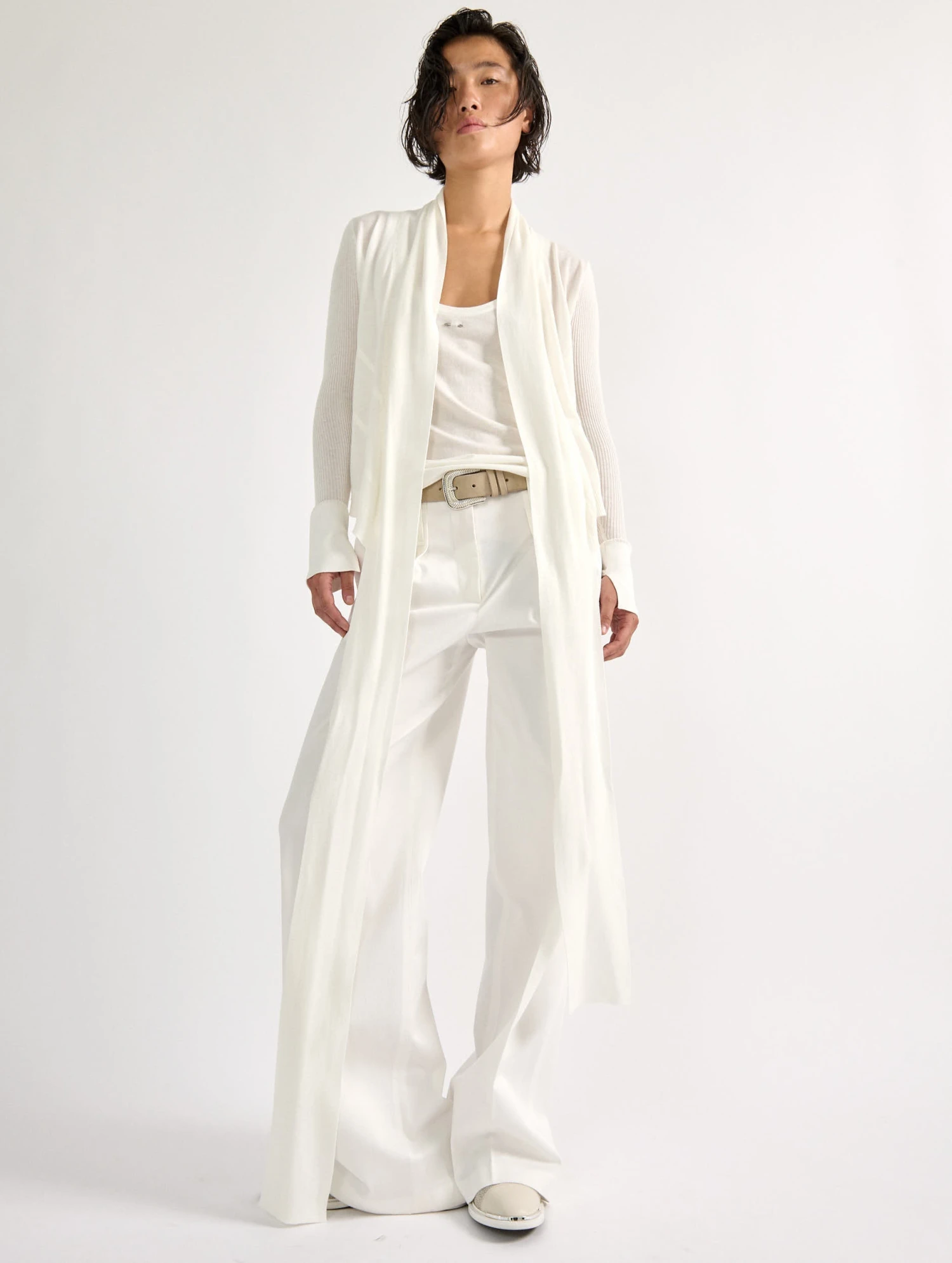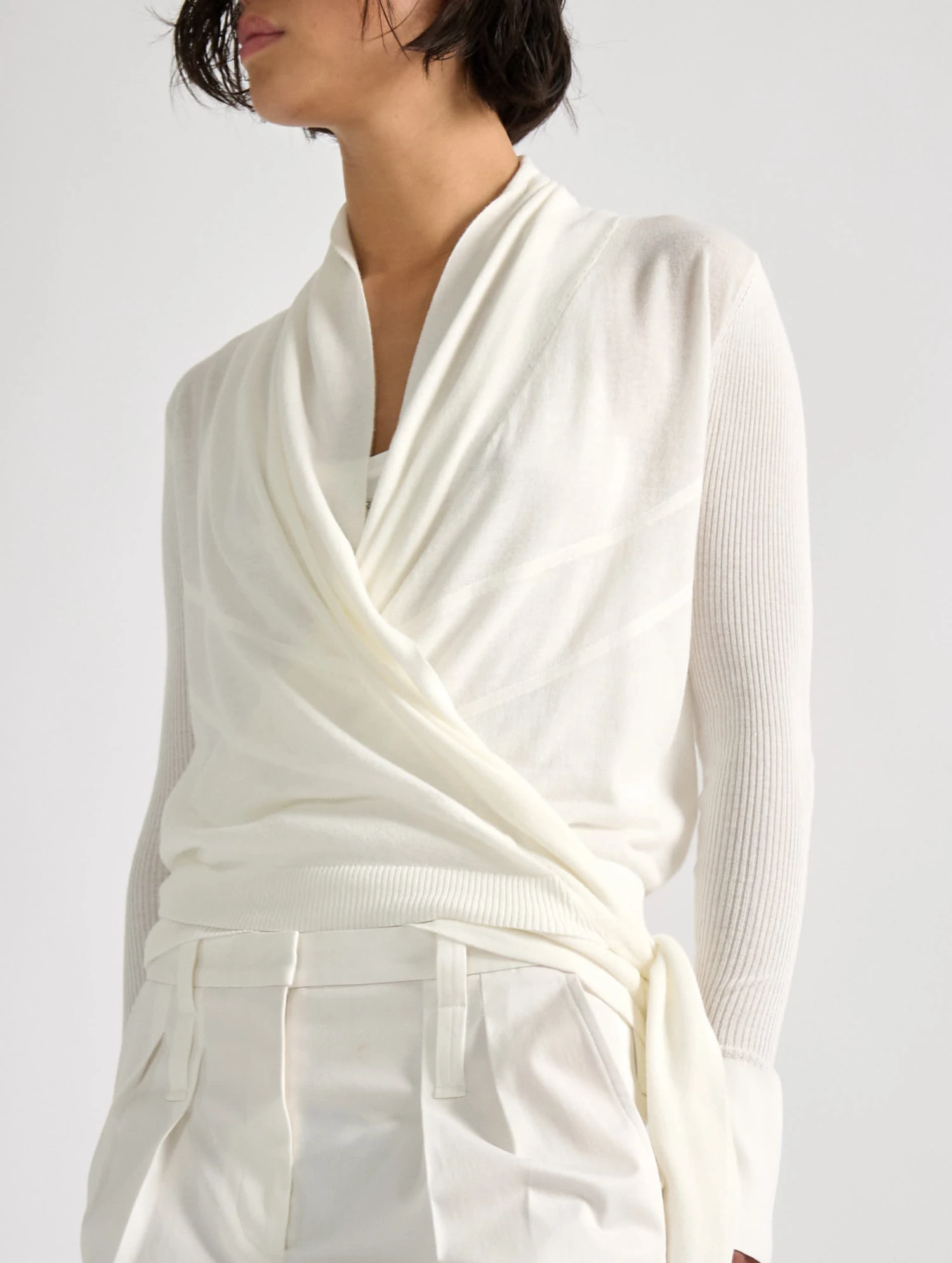 Inspiré des pulls de danseuses à encolure cache-cœur, ce modèle en propose une version rock et contemporaine jouant sur les longueurs. Sa ceinture intégrée volontairement allongée permet de porter ce pull femme près du corps, sa ceinture savamment nouée ou laissée délibérément plus lâche sur le côté. Porté complètement ouvert à la manière d’un cardigan sur le marcel assorti, ce modèle proposé dans 3 coloris propose une attitude cool et moderne emblématique de l’esprit de nos collections.