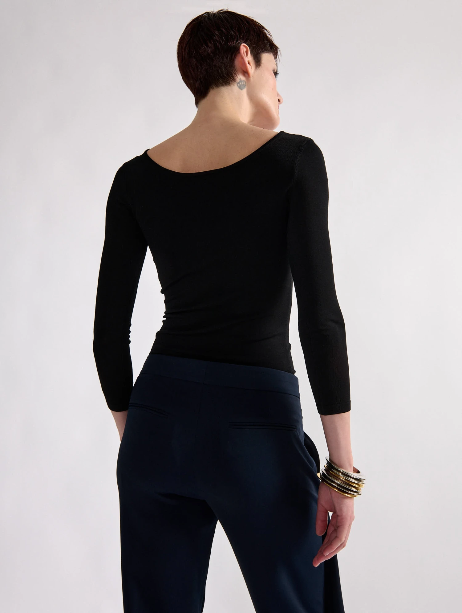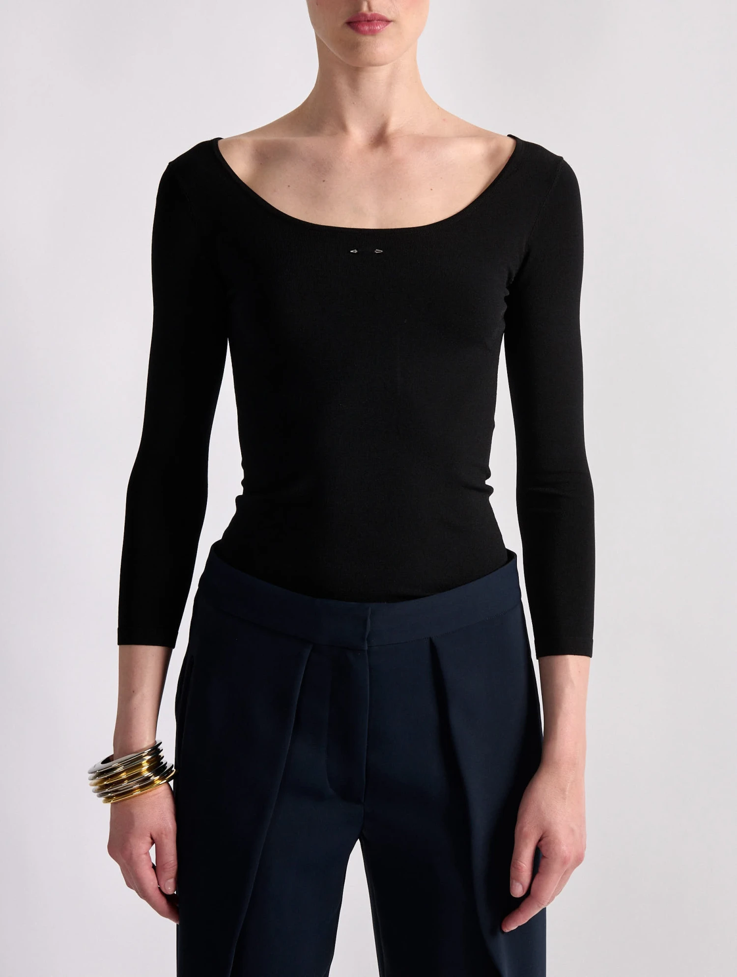 Réalisé dans une maille seconde peau pour un porter doux et seyant, ce pull à col danseuse se décline en noir ou en kaki, couleur idéale pour l’entrée de saison. Accessoirisé de notre emblématique bijou piercing, ce pull fin raffiné et intemporel s’accorde à toutes vos envies mode de la saison.