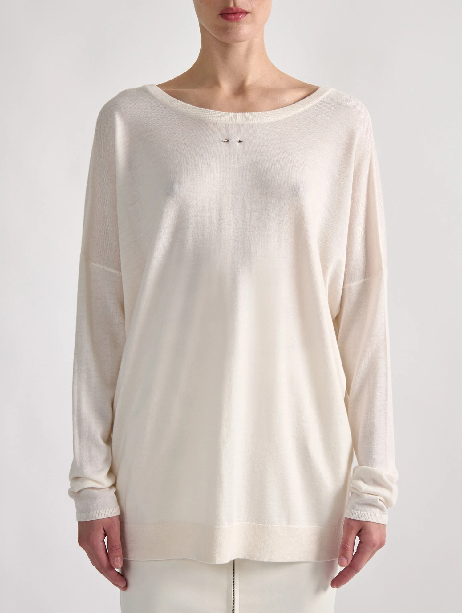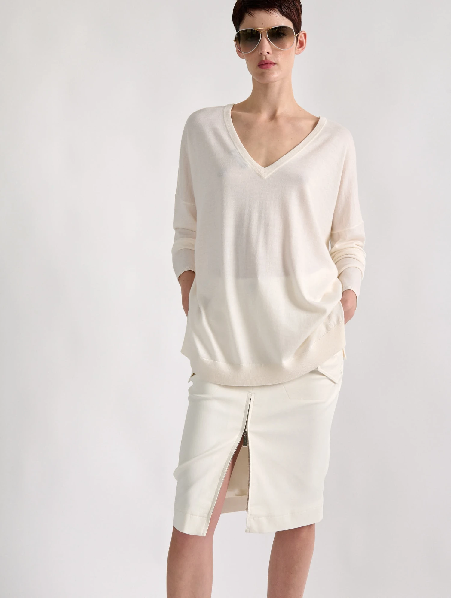 D’apparence classique, ce pull féminin en maille légère en laine et soie s’avère une pièce versatile et ludique pouvant être portée de multiples manières. Son encolure ronde offre un porter classique ou légèrement asymétrique, dévoilant alors dans le dos un élégant décolleté en V, à moins que vous ne préfériez le porter de manière inversée. Avec sa coupe légèrement oversized, son emmanchure basse et ses fentes de chaque côté, ce pull en maille ivoire ne vous quittera plus.