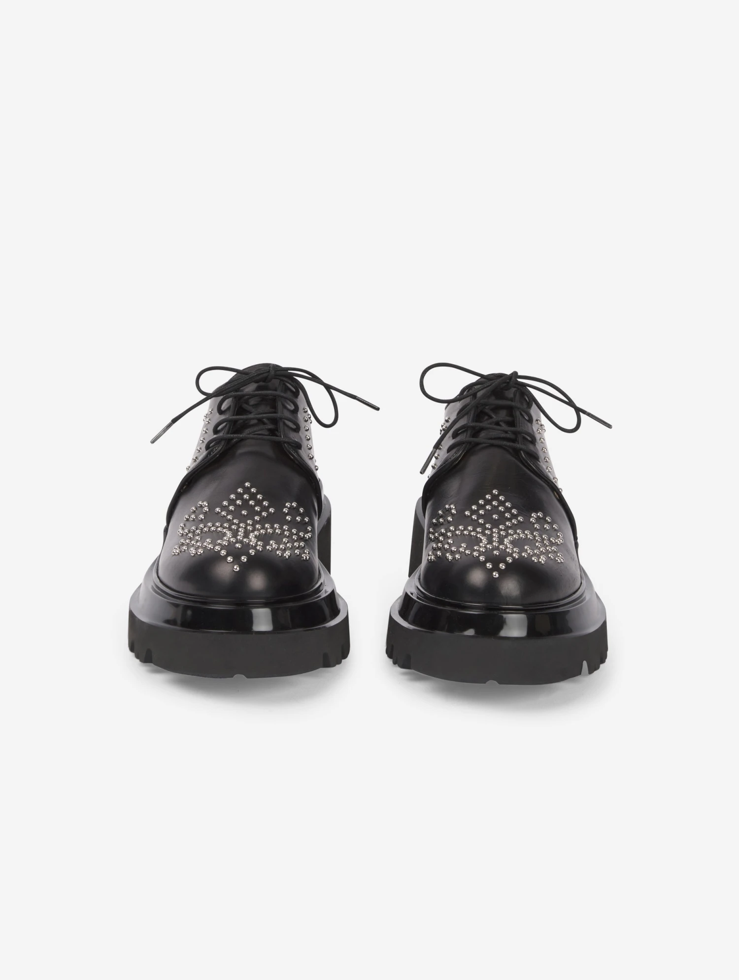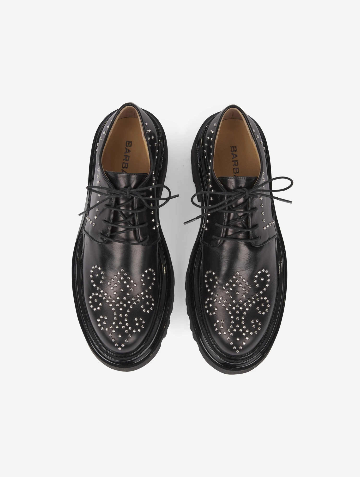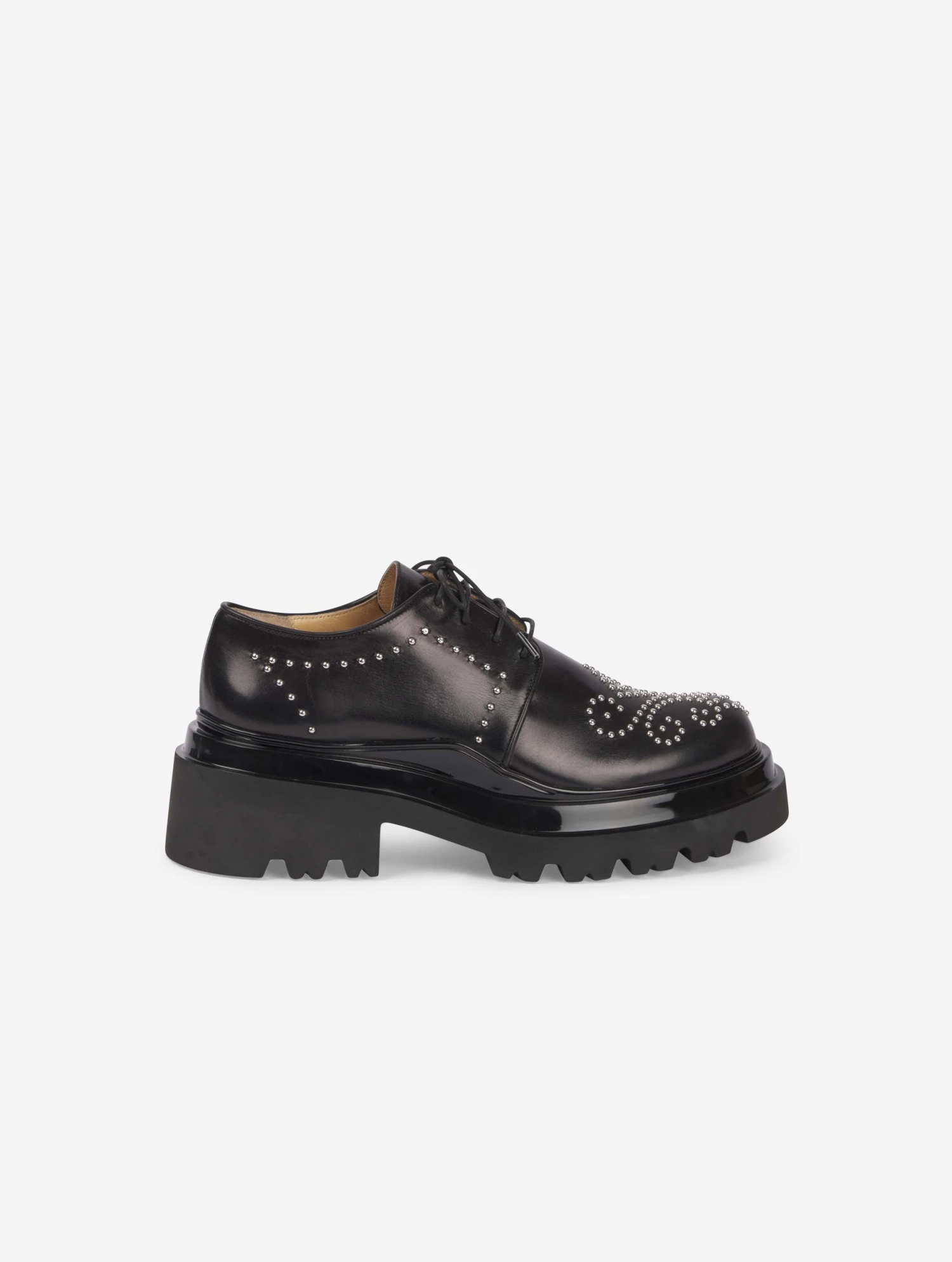 Richelieus en cuir noir clouté. Imposante double semelle en gomme crantée extra légère, laquée noir en partie supérieure. Talon de 6 cm.