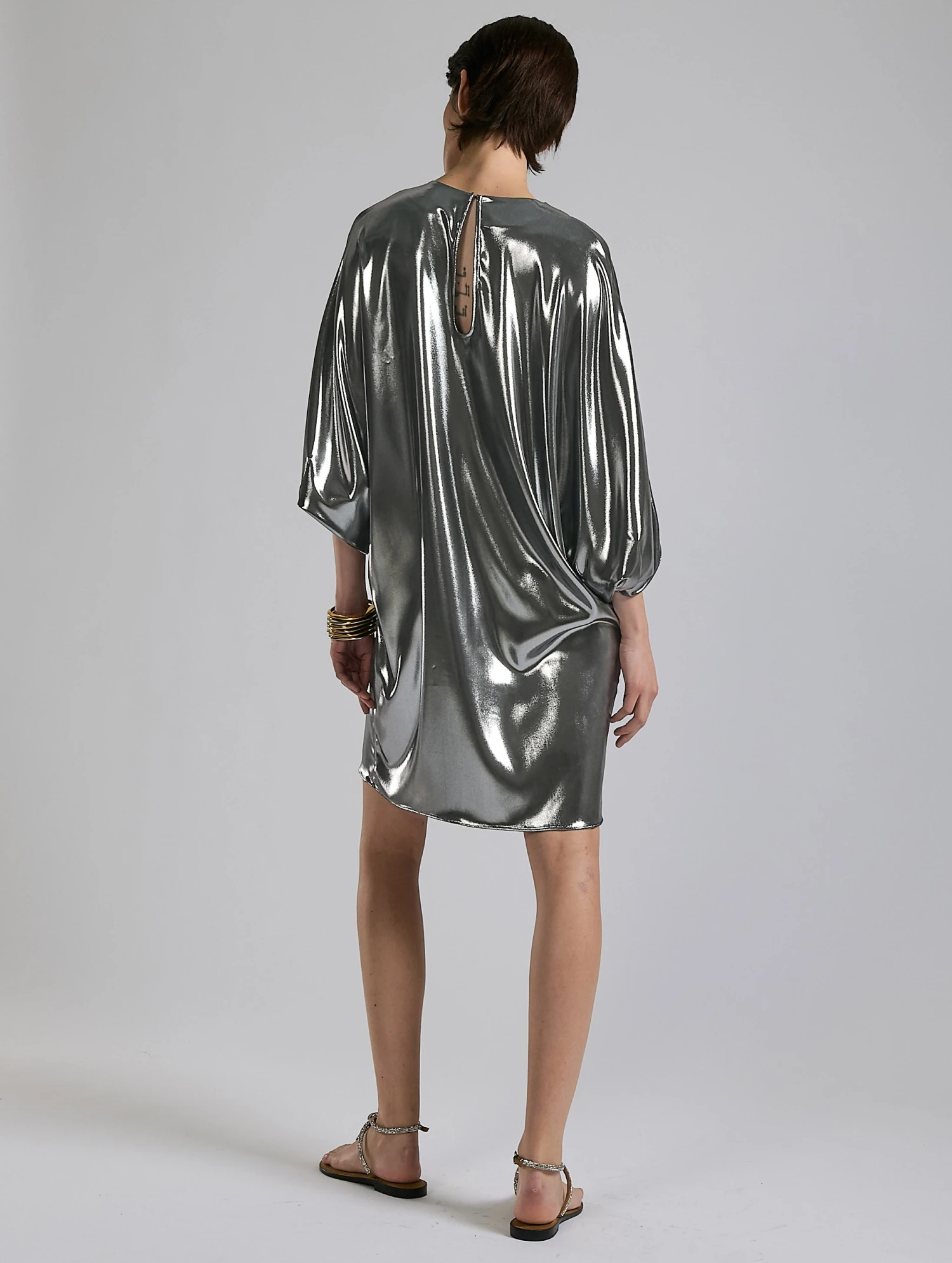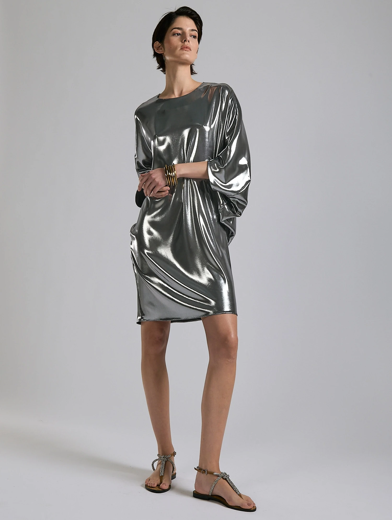 Réalisée dans un satin lamé argent à l’effet « liquide » , cette robe du soir à la coupe minimaliste absorbe la lumière.
