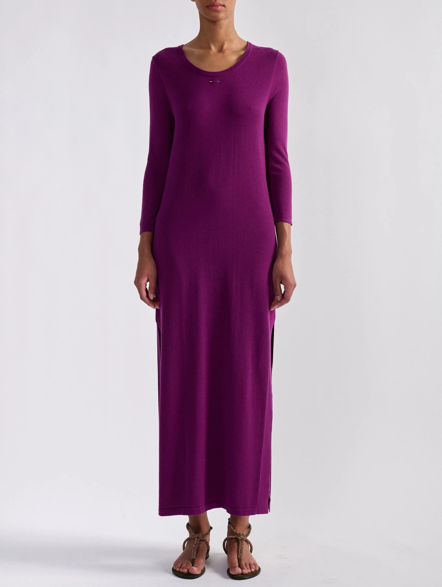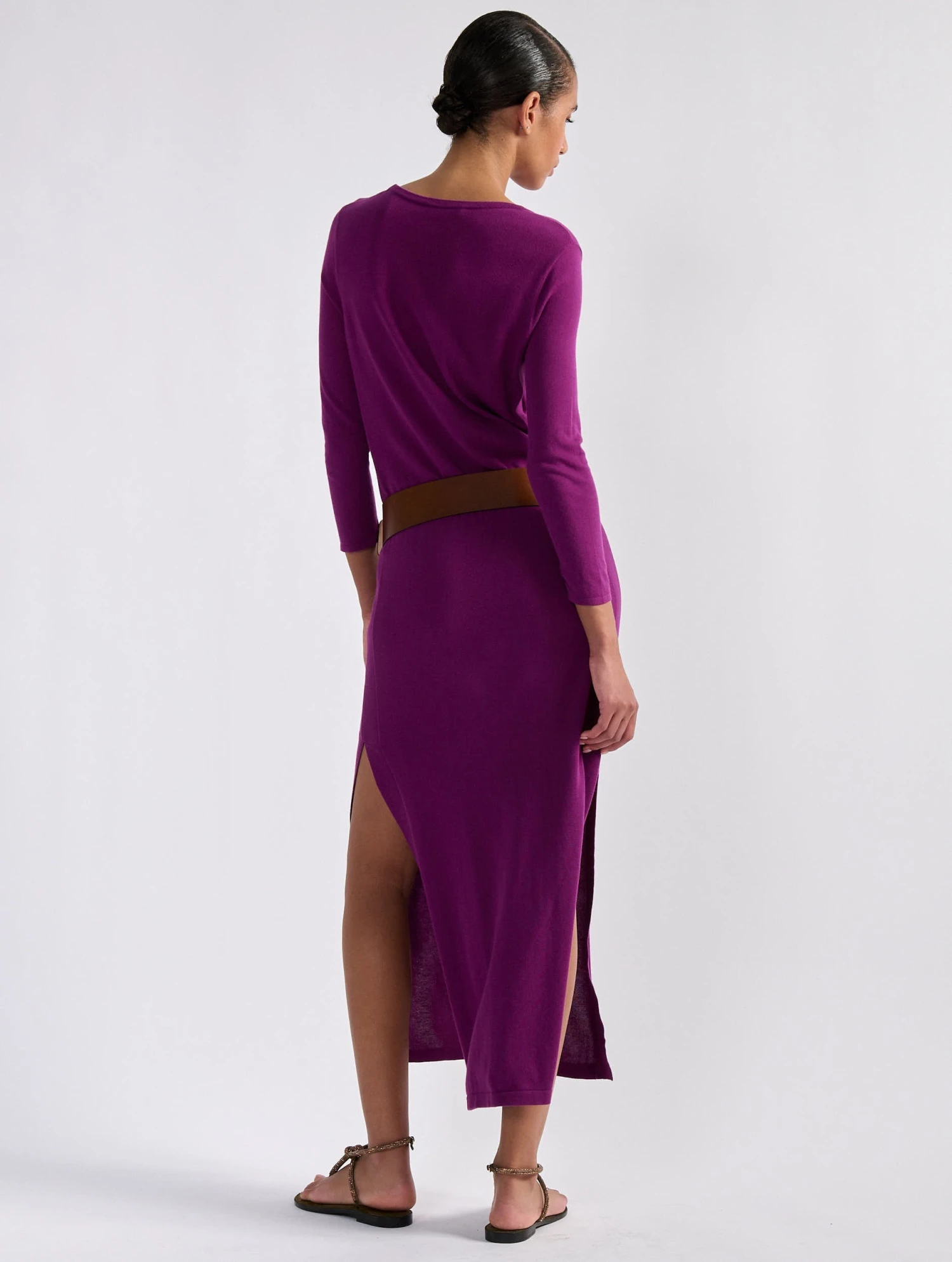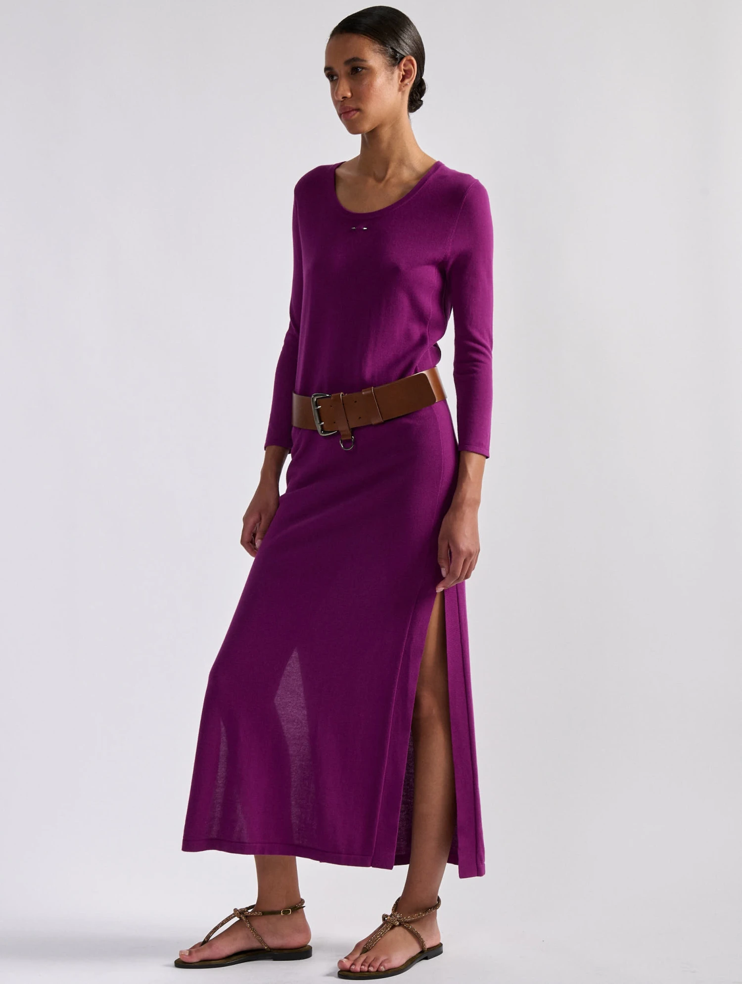 Parfaite pour célébrer l’arrivée du printemps ou à l’occasion d’un soir d’été, cette robe manches longues est réalisée dans une maille fine au porter flatteur et confortable. De chaque côté, une fente dévoile la longueur de jambes pour une silhouette féminine et une complète liberté de mouvement. Portée ceinturée avec une paire de sandales plates, cette robe à encolure ronde se fera aisément une place dans vos looks printemps-été. Ce modèle intemporel est proposé en coloris marine, vert olive ou dans un violet bougainvillier vibrant.
