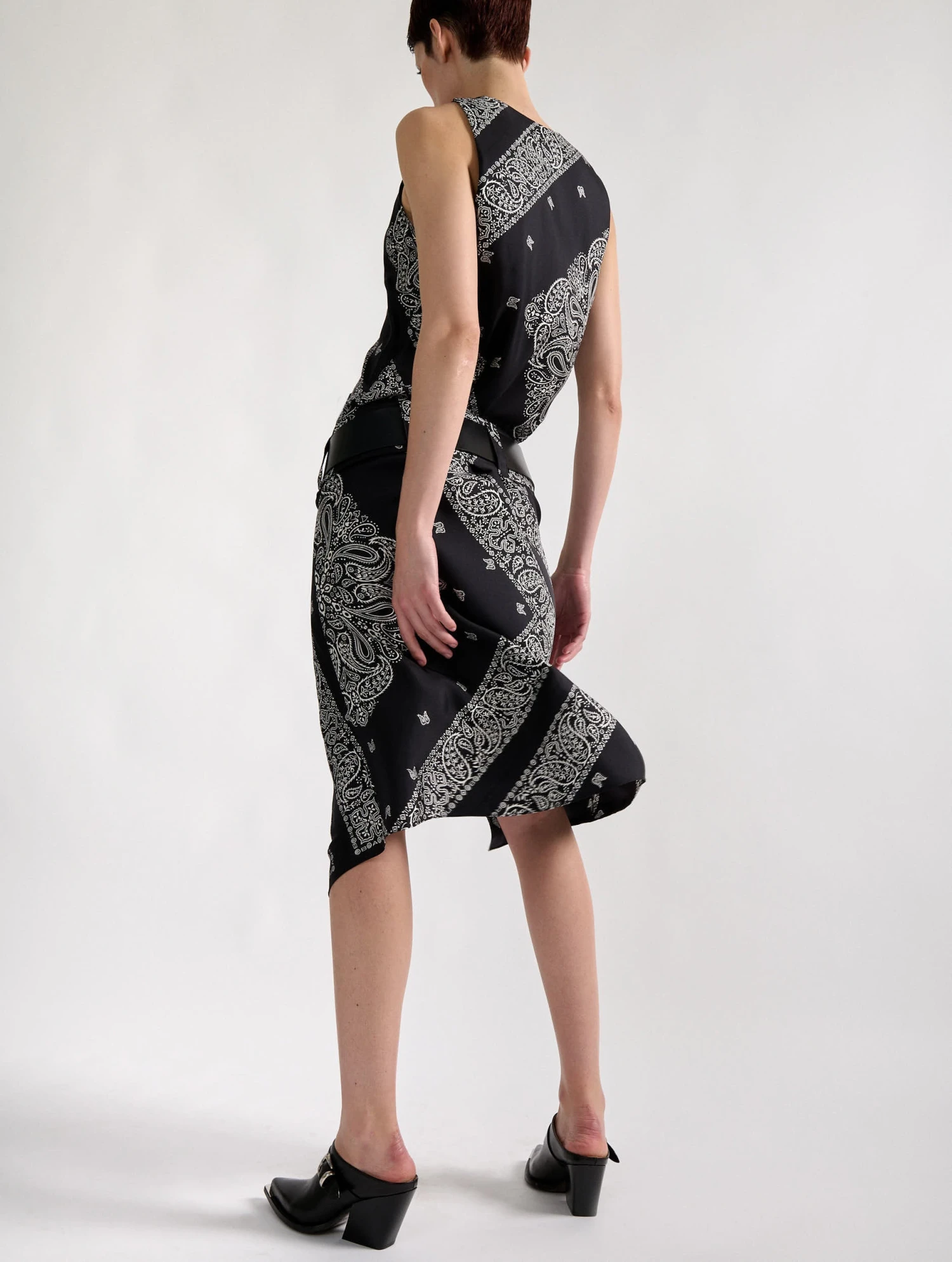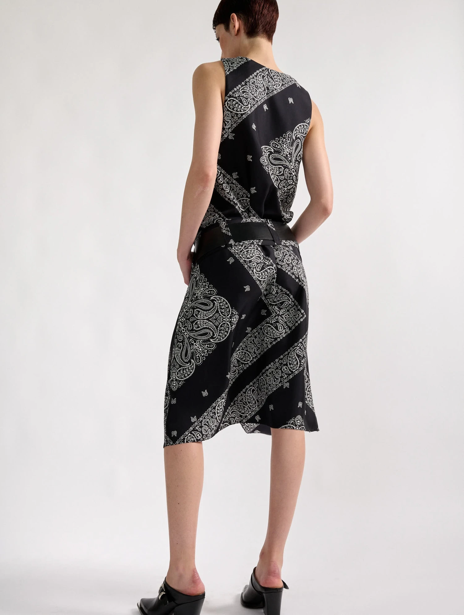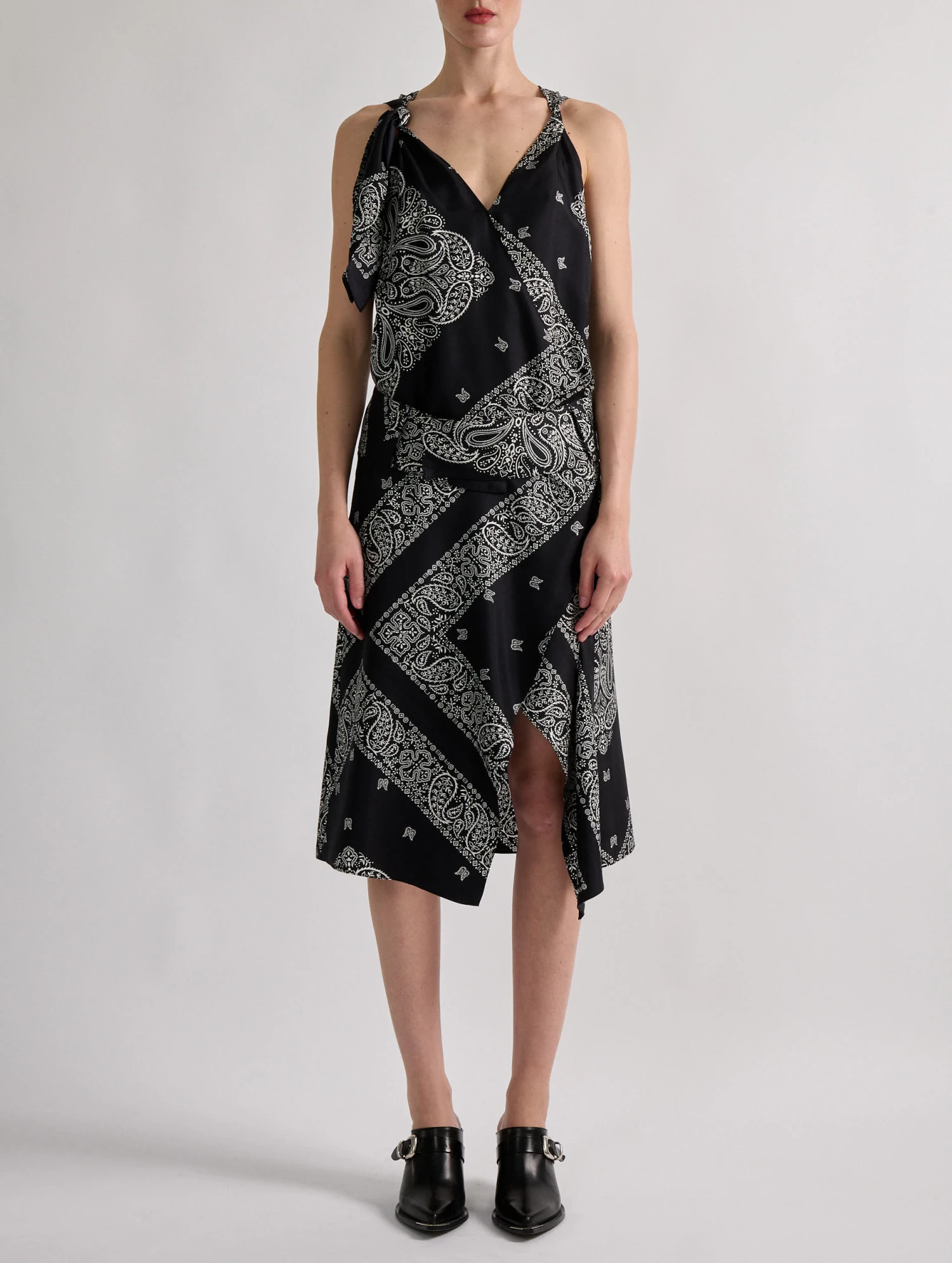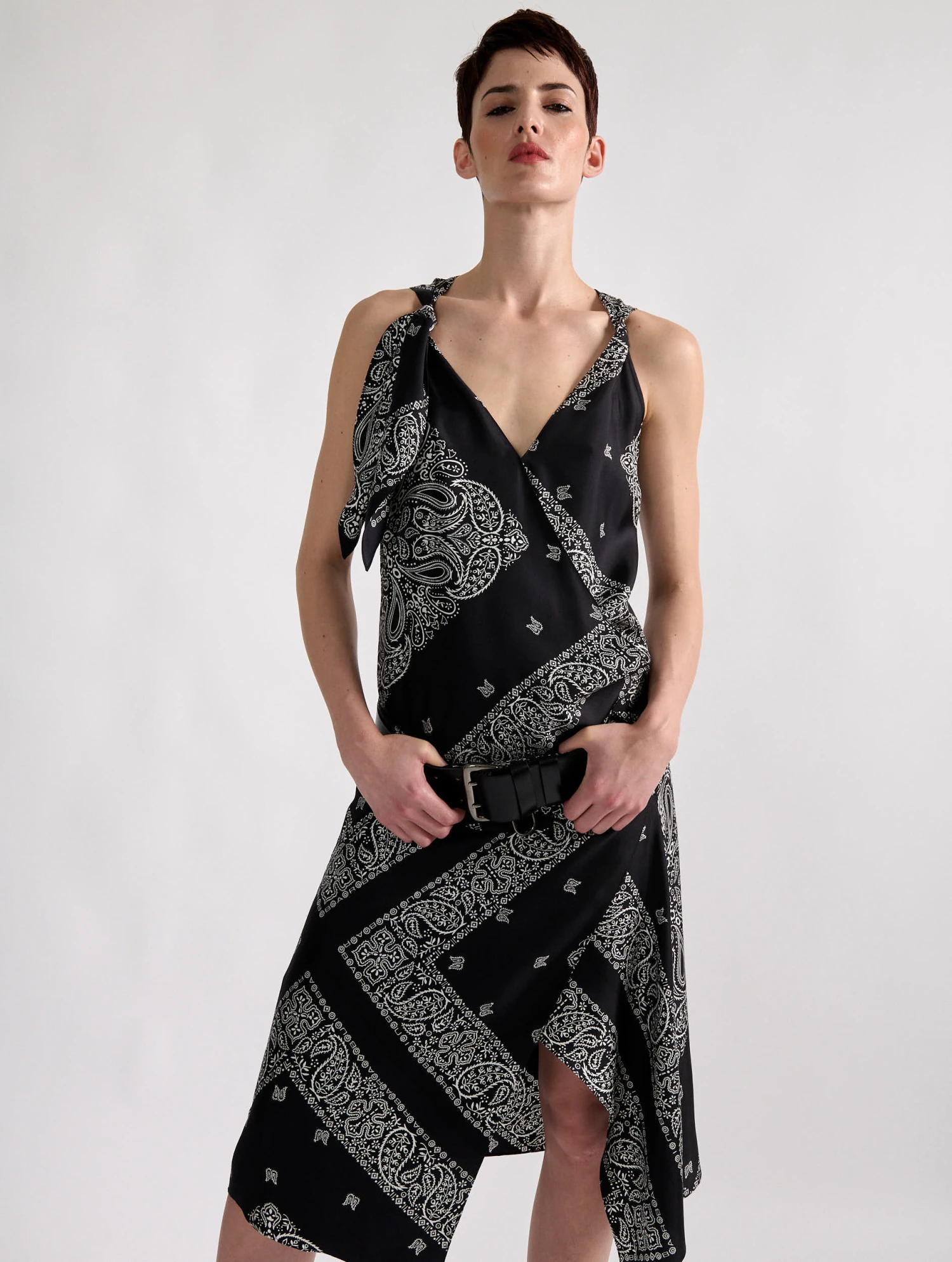 Cette saison, le foulard devient vêtement. Cette robe à l’imprimé bandana met la silhouette en valeur grâce à ses découpes asymétriques et son encolure croisée. Un foulard assorti est délicatement noué à l’épaule. Associez à cette robe légère une ceinture de cuir grâce à ses passants intégrés et une paire de mules en cuir noir pour une allure rock et féminine au cœur de l’été.