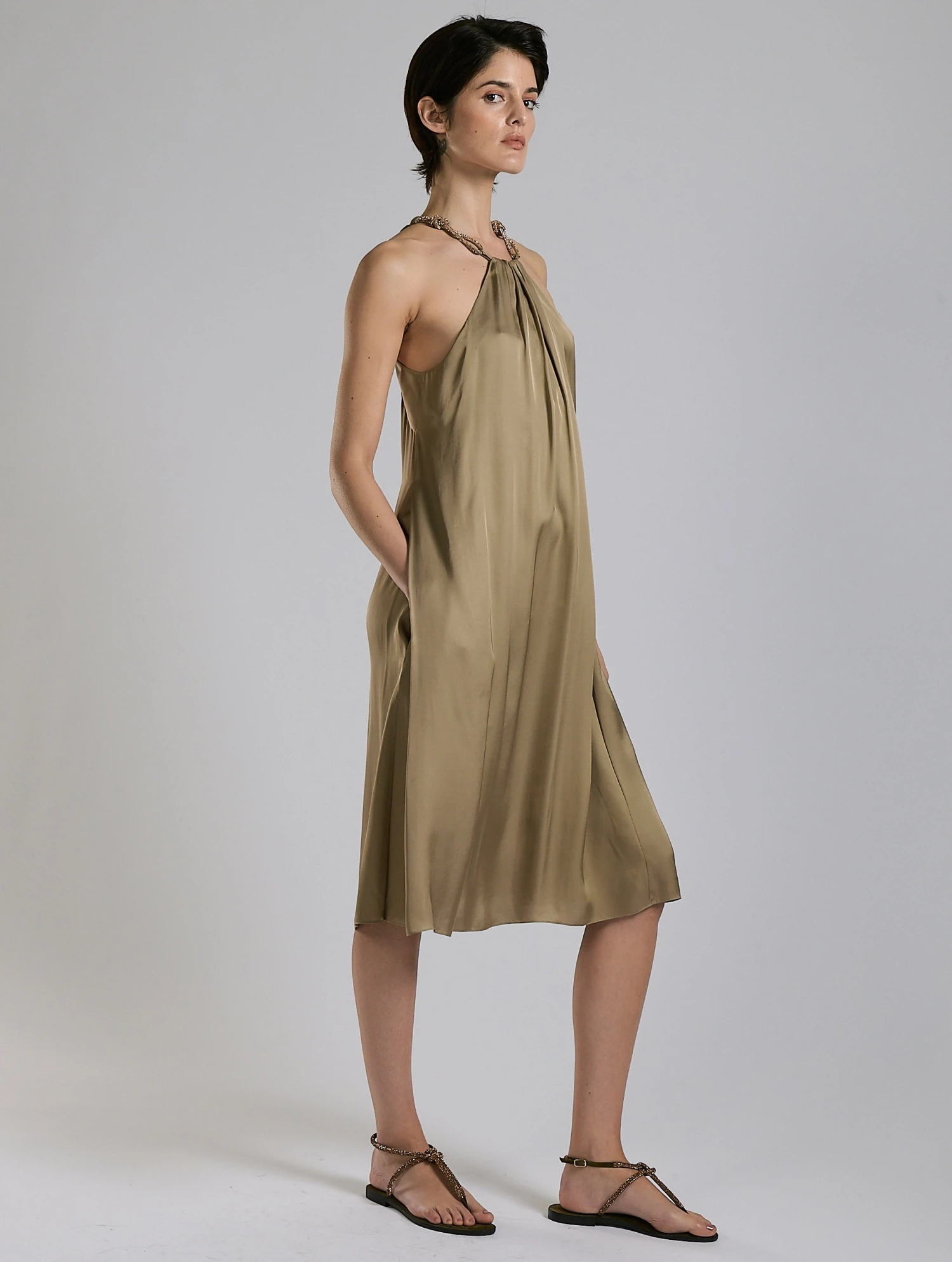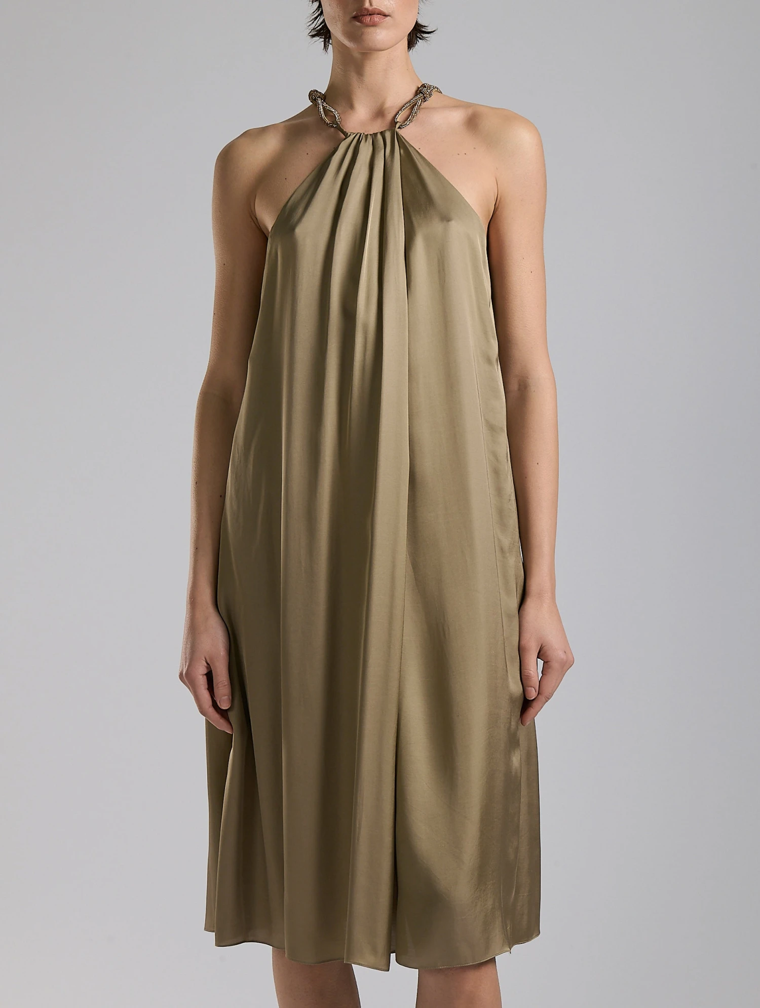 Véritable vêtement bijou, cette robe se distingue par son encolure féminine et ornementée. Celle-ci est constituée de deux attaches pavées de strass dans une teinte dorée chaude qui sied parfaitement au satin de viscose léger dans ses tonalités noires comme sable. La coupe trapèze de cette robe du soir pourra être mise en valeur portée de manière minimaliste ou ceinturée pour appuyer la taille. Talons ou sandales bijoux l’accessoiriseront quelle que soit l’occasion.