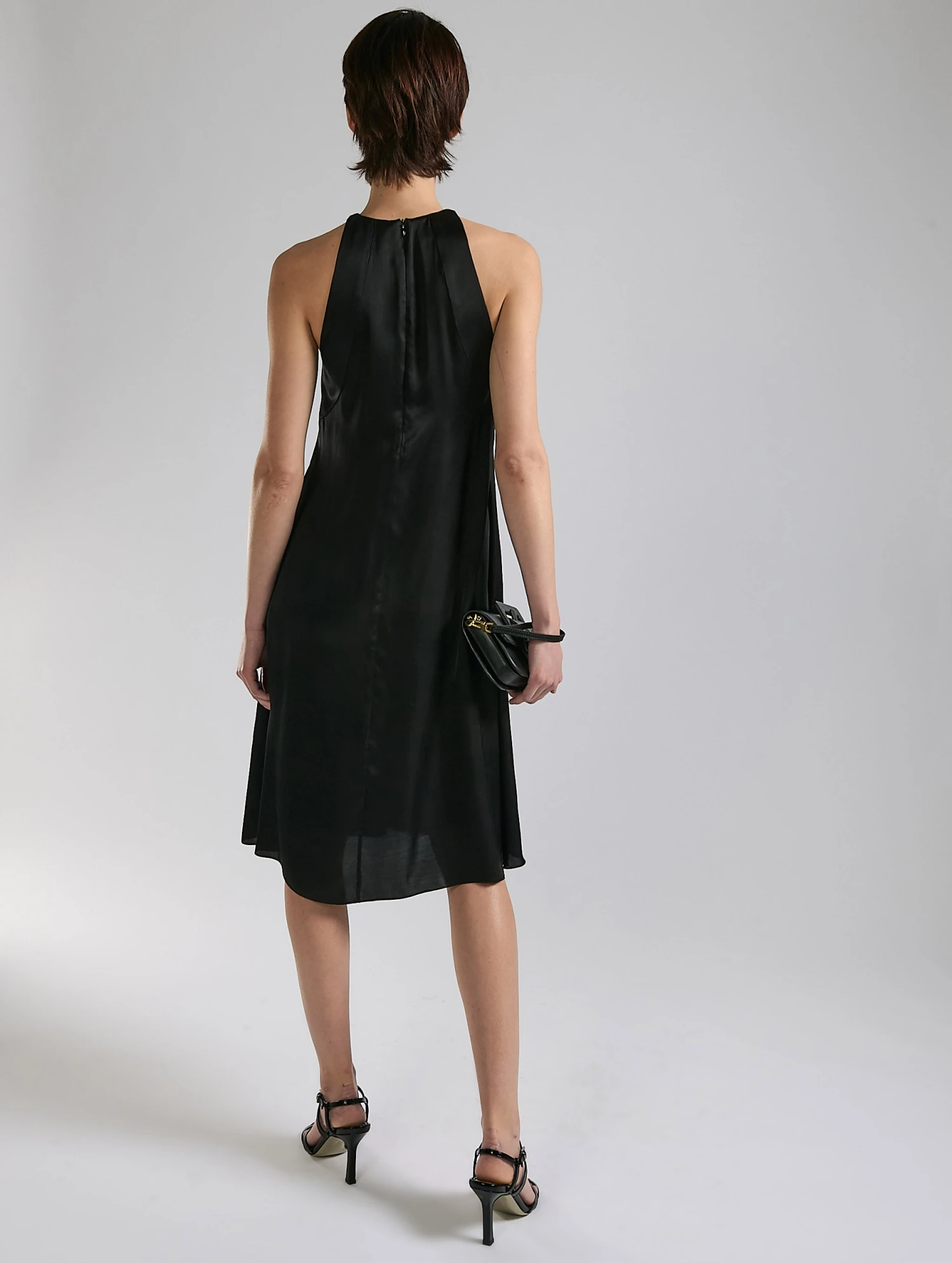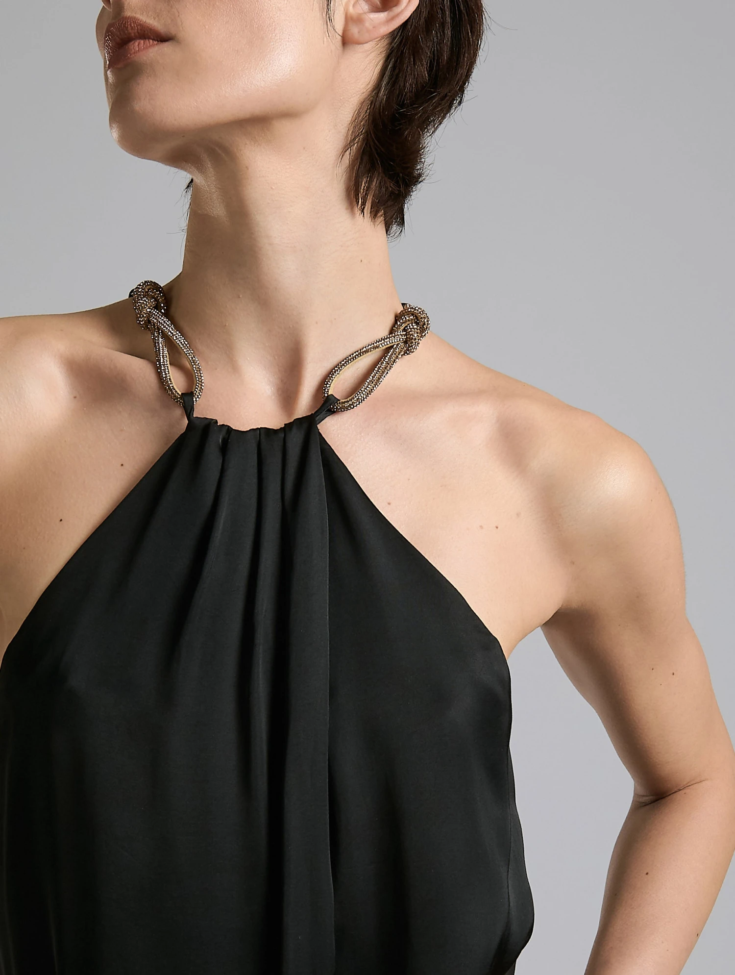 Véritable vêtement bijou, cette robe se distingue par son encolure féminine et ornementée. Celle-ci est constituée de deux attaches pavées de strass dans une teinte dorée chaude qui sied parfaitement au satin de viscose léger dans ses tonalités noires comme sable. La coupe trapèze de cette robe du soir pourra être mise en valeur portée de manière minimaliste ou ceinturée pour appuyer la taille. Talons ou sandales bijoux l’accessoiriseront quelle que soit l’occasion.