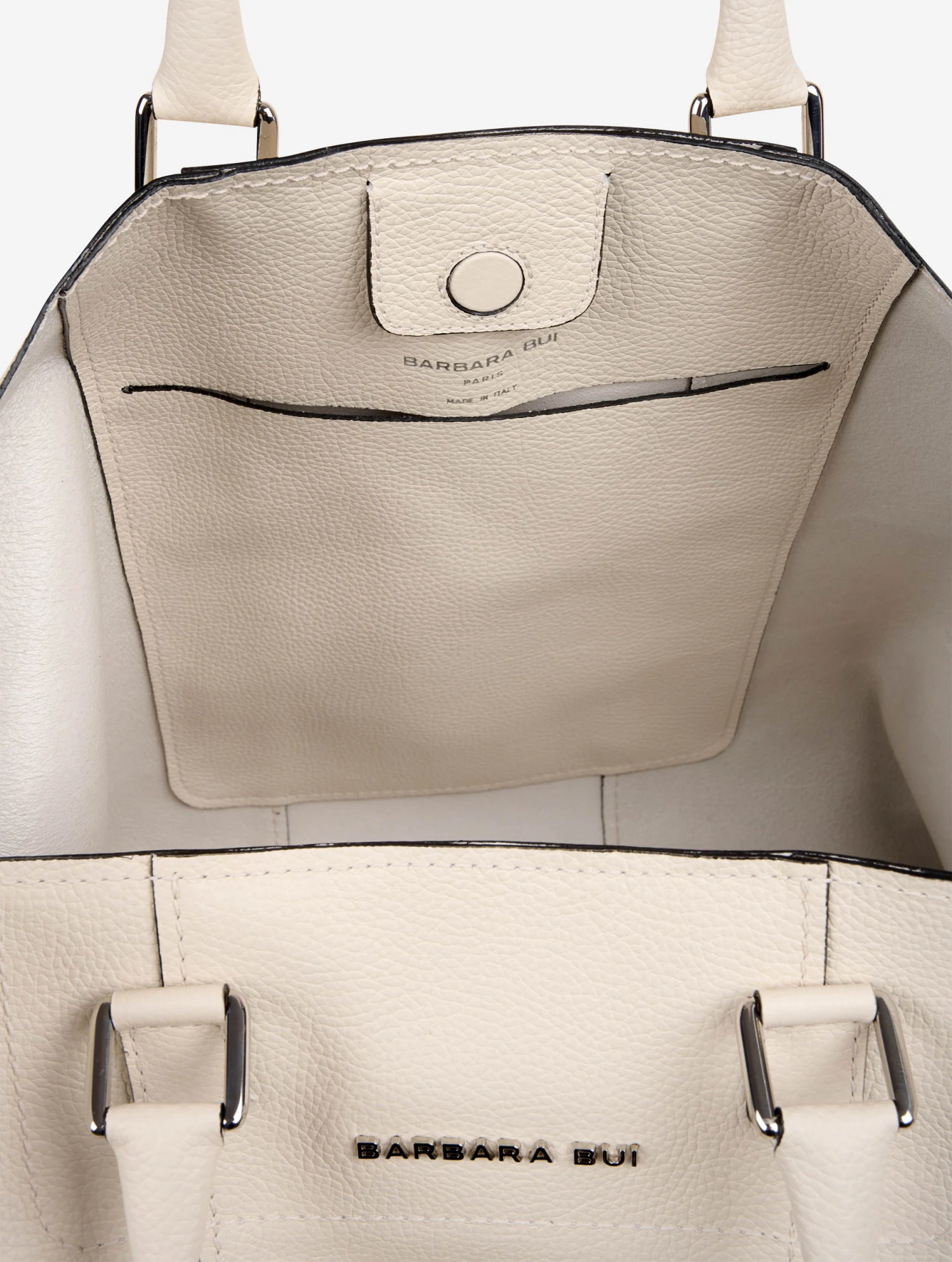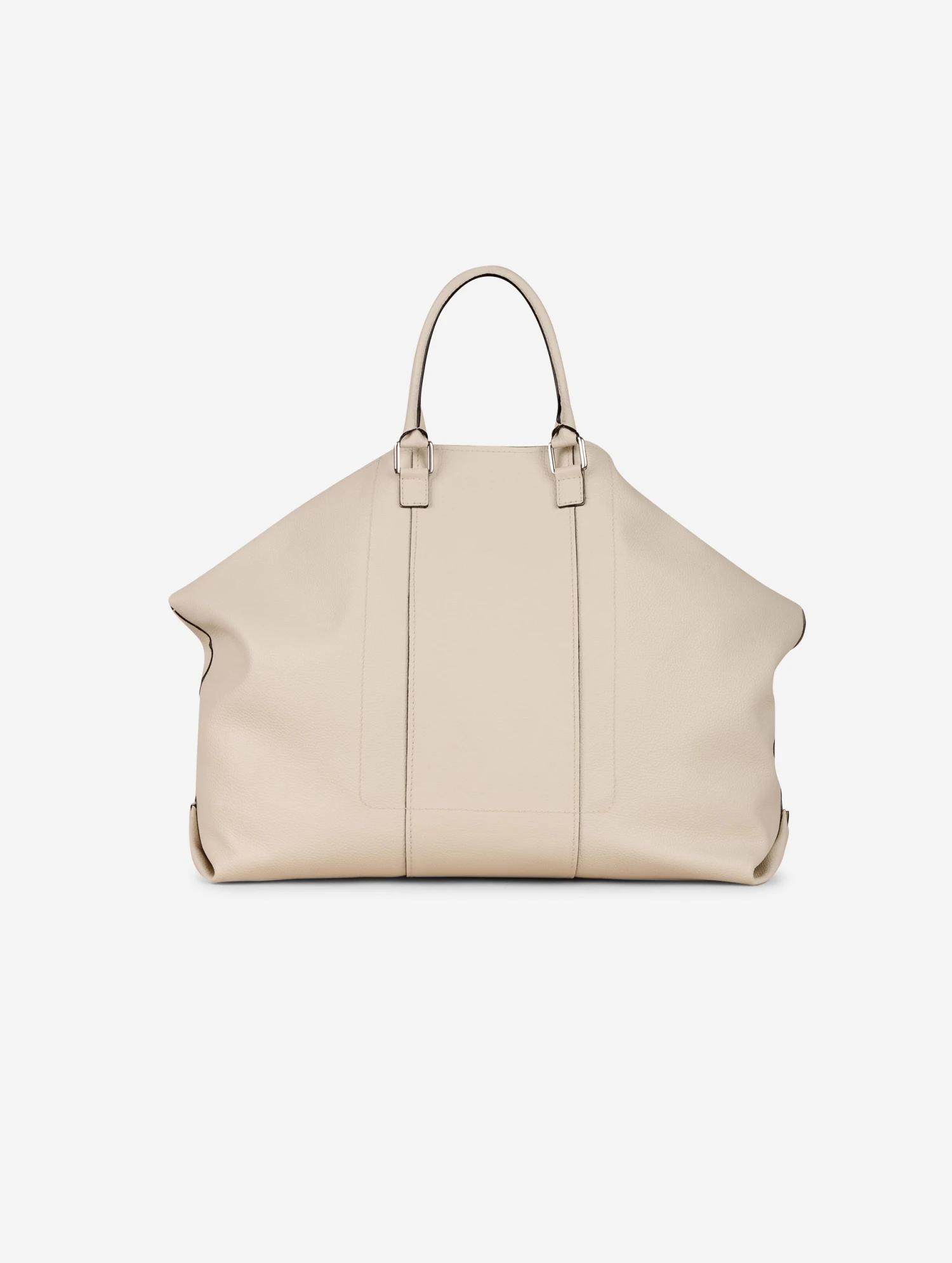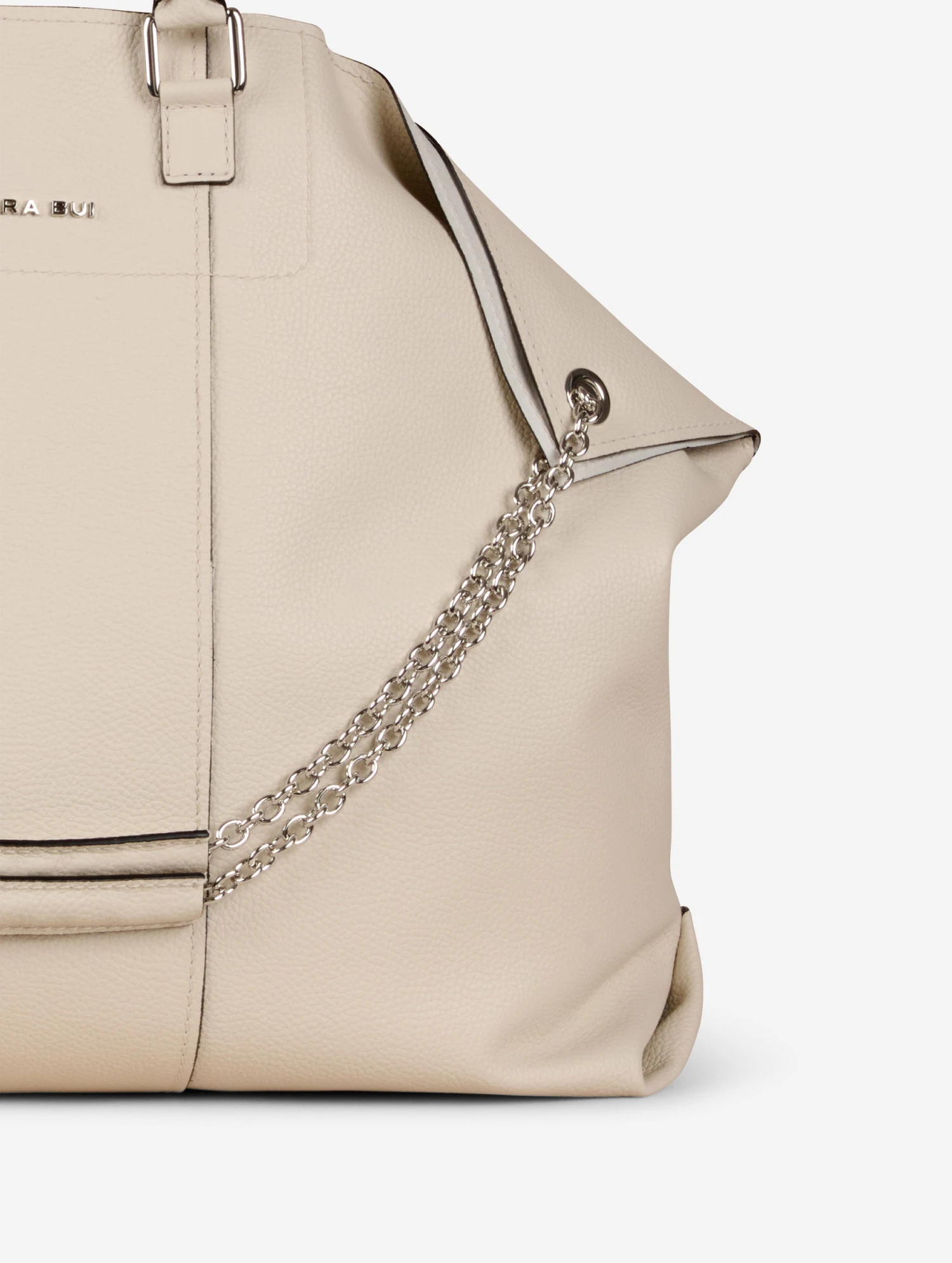 Grand sac cabas « BIG CHAMALLOW » en veau grainé ivoire contrecollé sur sa doublure effet réversible. Poignées porté main articulées et bandoulière chaîne coulissante permettant le porté épaule, court chaîne en double, soit long chaîne simple. Poche intérieure plaquée et fermeture centrale magnétique. Hauteur: 41cm – Largeur: 64cm – Profondeur: 18cm.