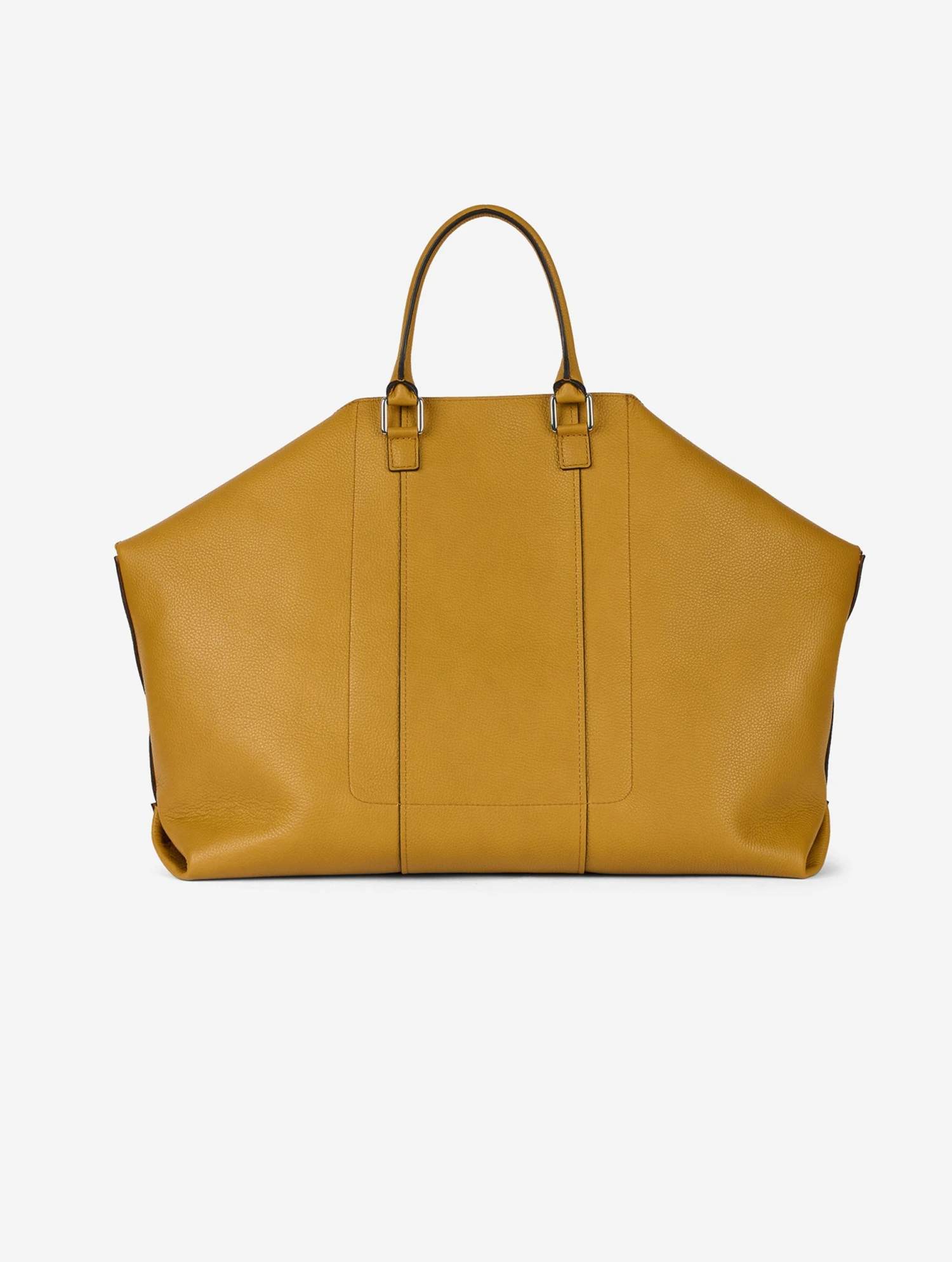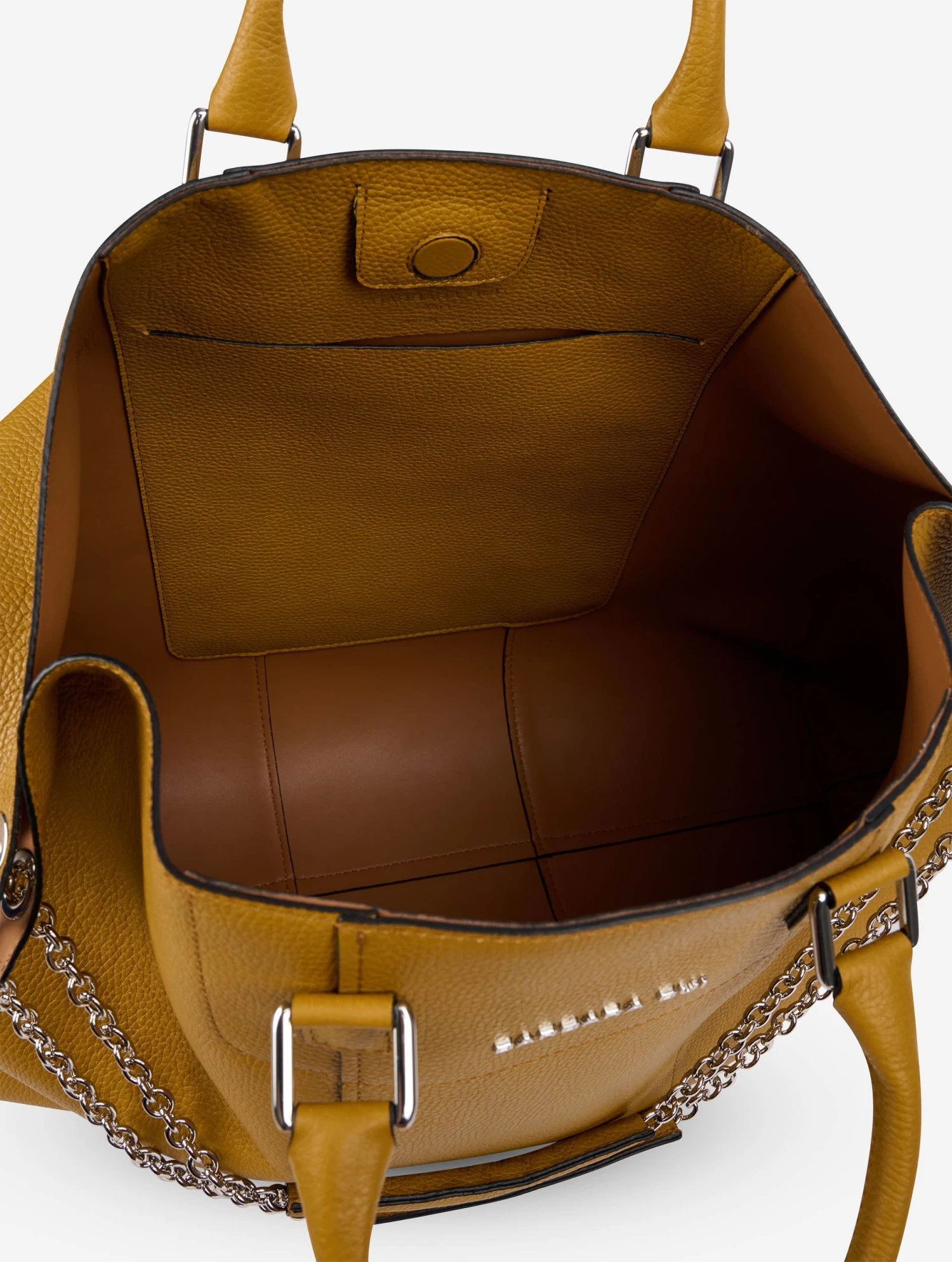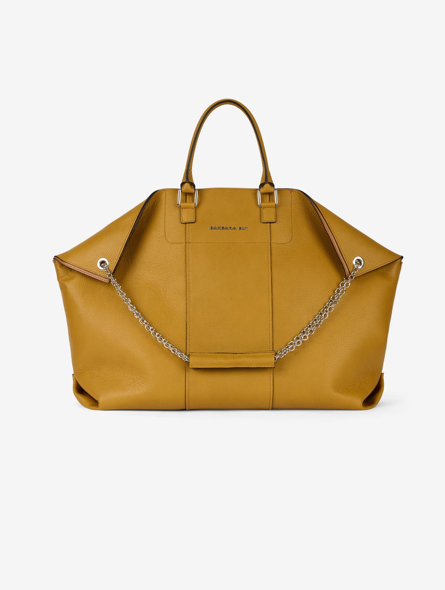 Grand sac cabas « BIG CHAMALLOW » en veau grainé moutarde contrecollé sur sa doublure effet réversible. Poignées porté main articulées et bandoulière chaîne coulissante permettant le porté épaule, court chaîne en double, soit long chaîne simple. Poche intérieure plaquée et fermeture centrale magnétique. Hauteur: 41cm – Largeur: 64cm – Profondeur: 18cm.