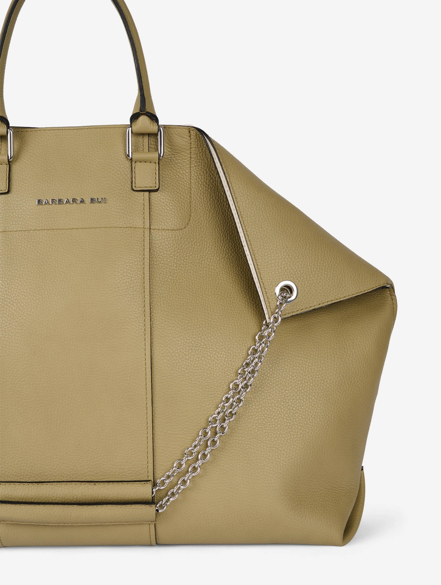 Grand sac cabas « BIG CHAMALLOW » en veau grainé tilleul contrecollé sur sa doublure effet réversible. Poignées porté main articulées et bandoulière chaîne coulissante permettant le porté épaule, court chaîne en double, soit long chaîne simple. Poche intérieure plaquée et fermeture centrale magnétique. Hauteur: 41cm – Largeur: 64cm – Profondeur: 18cm.