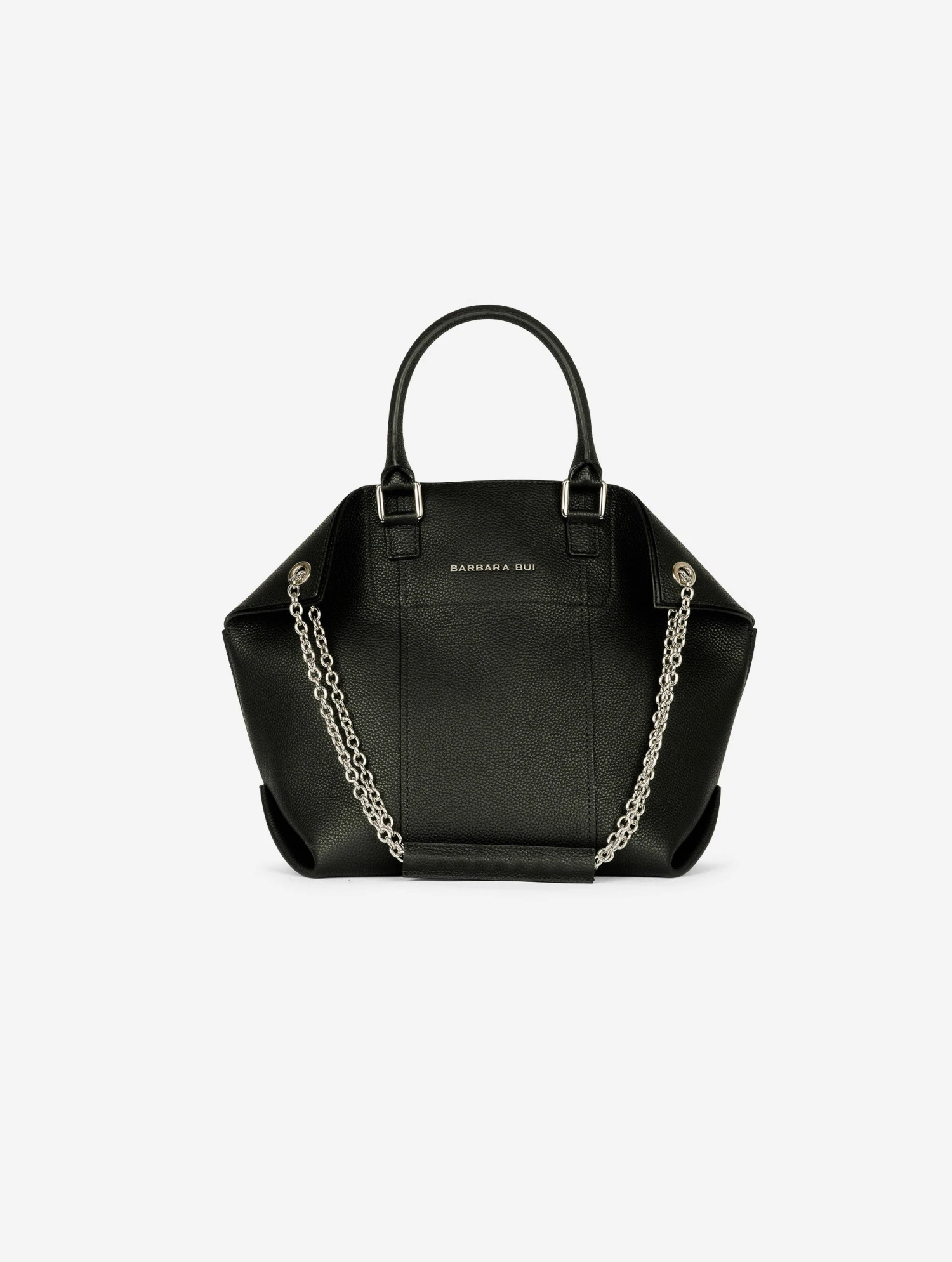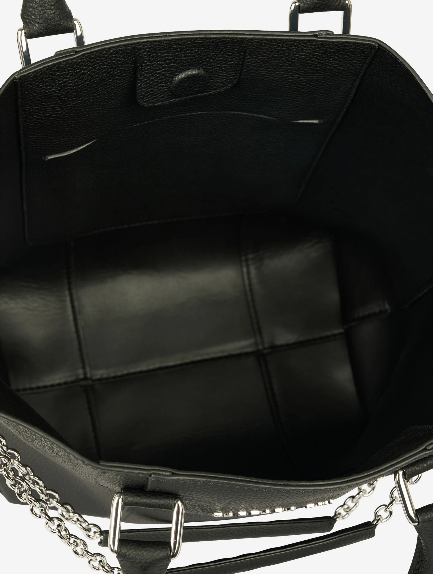 Sac cabas « CHAMALLOW » en veau grainé noir contrecollé sur sa doublure effet réversible. Poignées porté main articulées et bandoulière chaîne coulissante permettant le porté épaule, court chaîne en double, soit long chaîne simple. Poche intérieure plaquée et fermeture centrale magnétique. Hauteur: 33cm – Largeur: 44cm – Profondeur: 16cm.