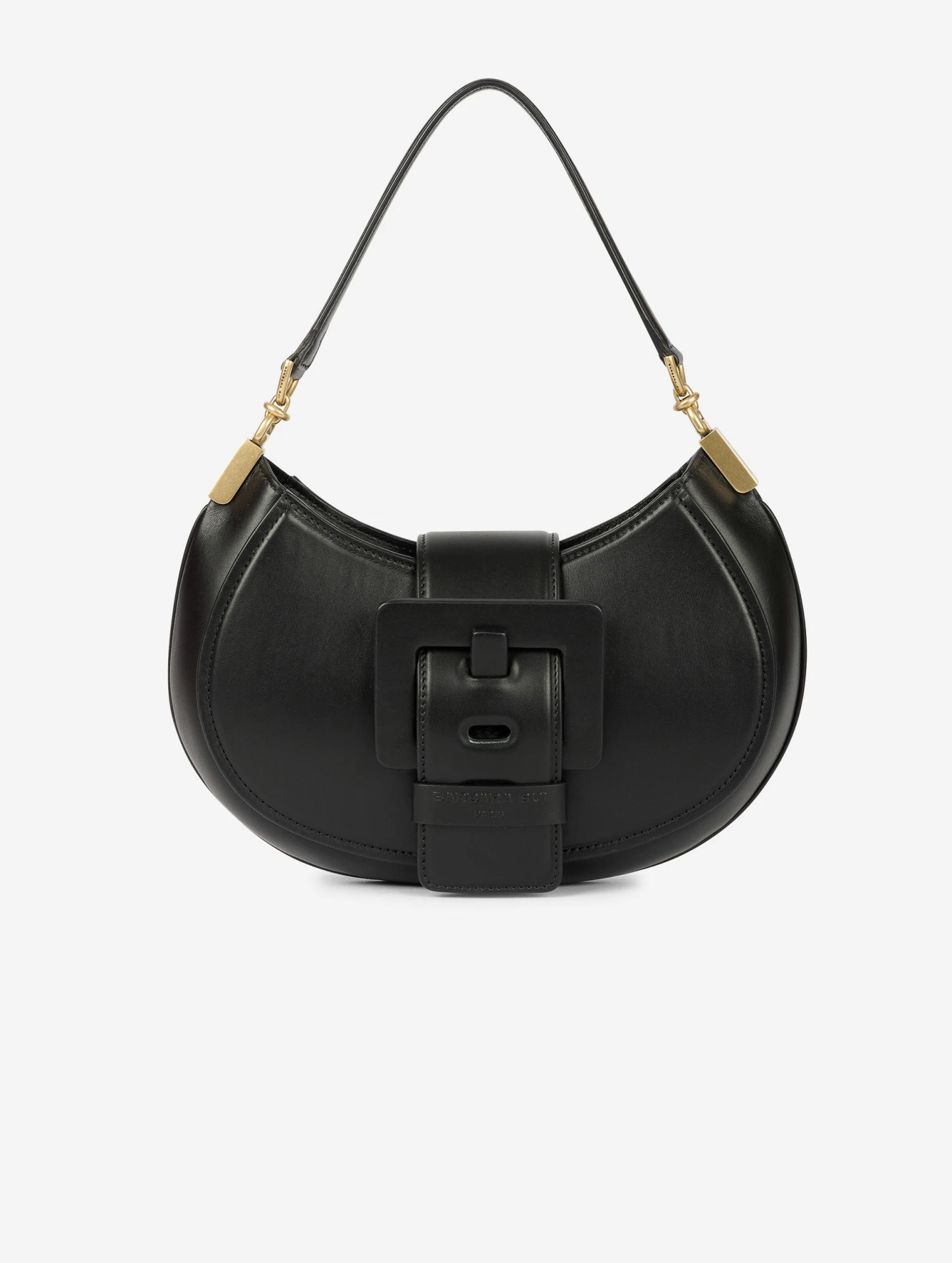 Sac « KISS ME » en veau satiné noir. Zippé sur le dessus, la ceinture à fermeture magnétique forme un rabat. Il est habillé de la maxi boucle en cuir renforcé, signature de notre ligne de sacs « ME ». Poignée-bandoulière pour un porter main ou petite épaule. Intérieur avec poche plaquée. Hauteur : 20 cm / Longueur : 28 cm / Profondeur : 8 cm.