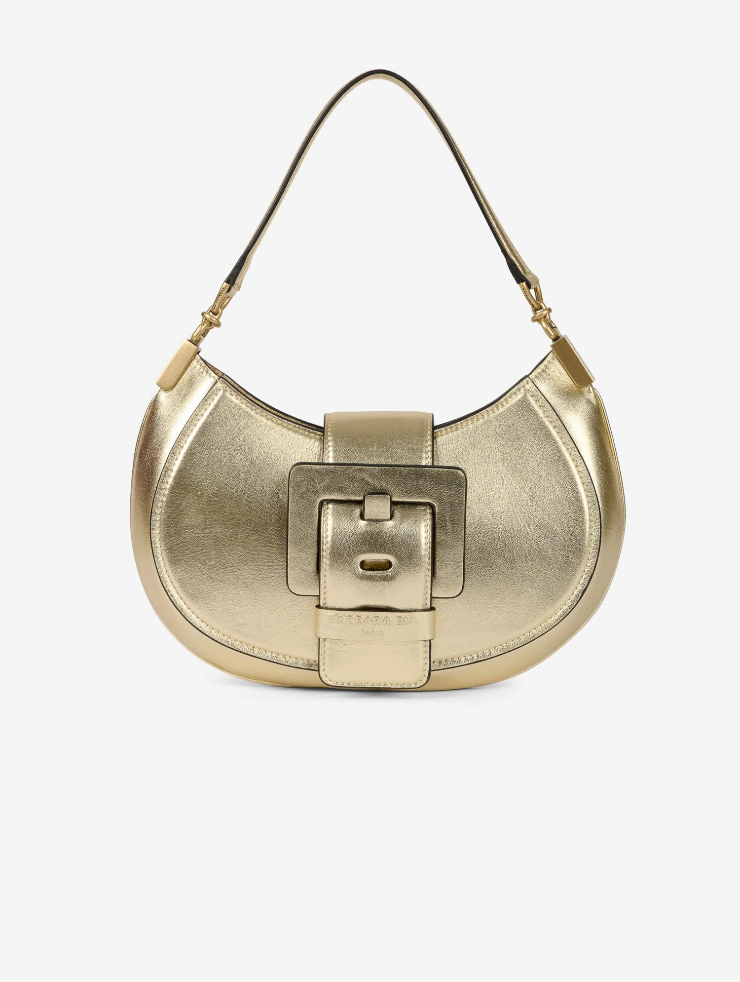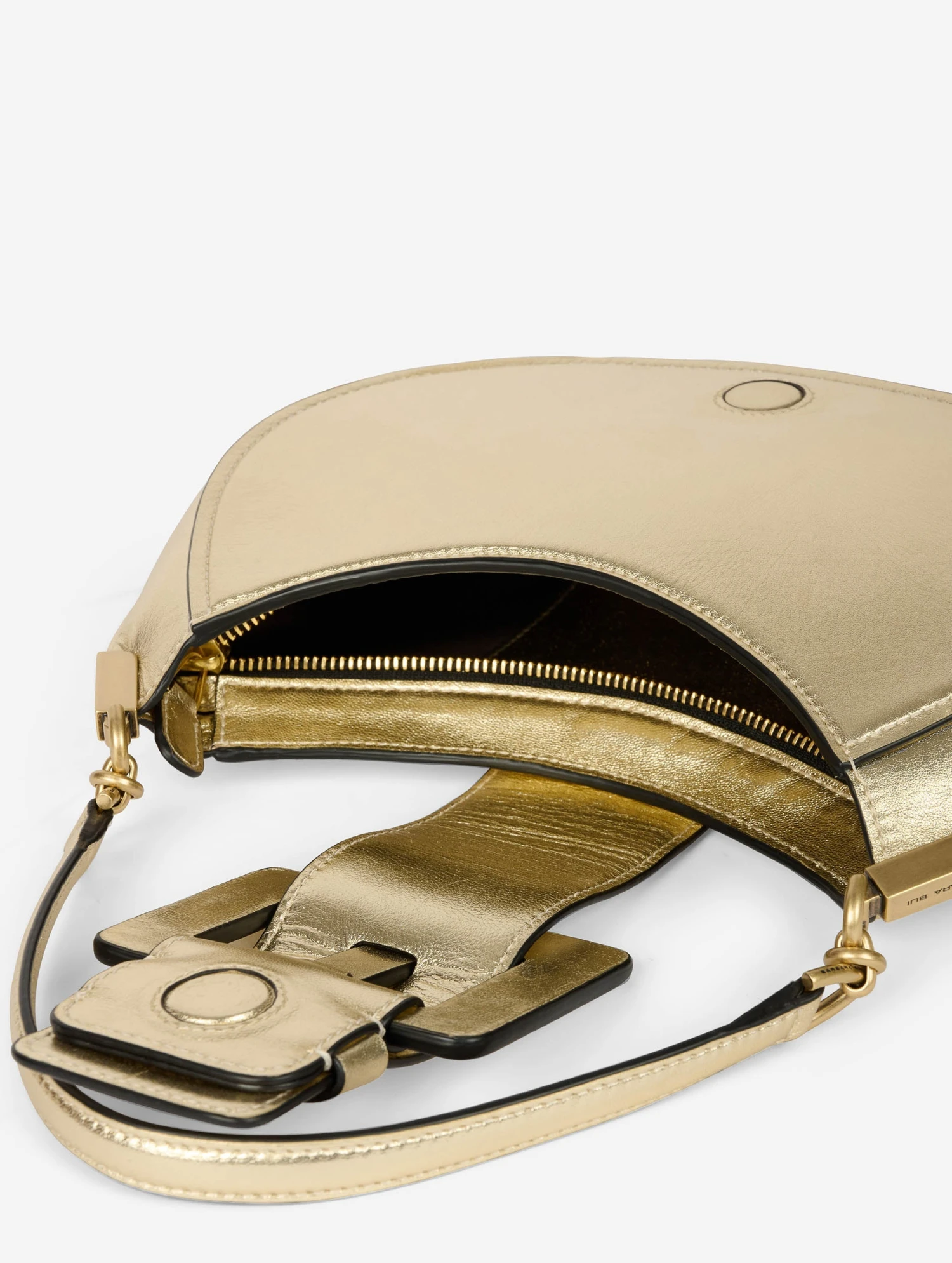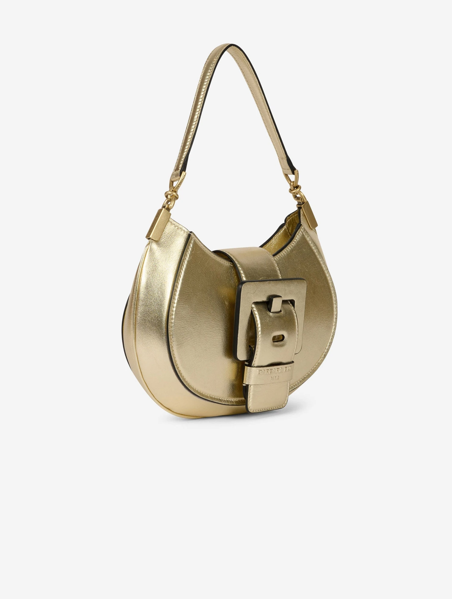 Sac « KISS ME » en veau grainé métallisé doré clair. Zippé sur le dessus, la ceinture à fermeture magnétique forme un rabat. Il est habillé de la maxi boucle en cuir renforcé, signature de notre ligne de sacs « ME ». Poignée-bandoulière pour un porter main ou petite épaule. Intérieur avec poche plaquée. Hauteur : 20 cm / Longueur : 28 cm / Profondeur : 8 cm.