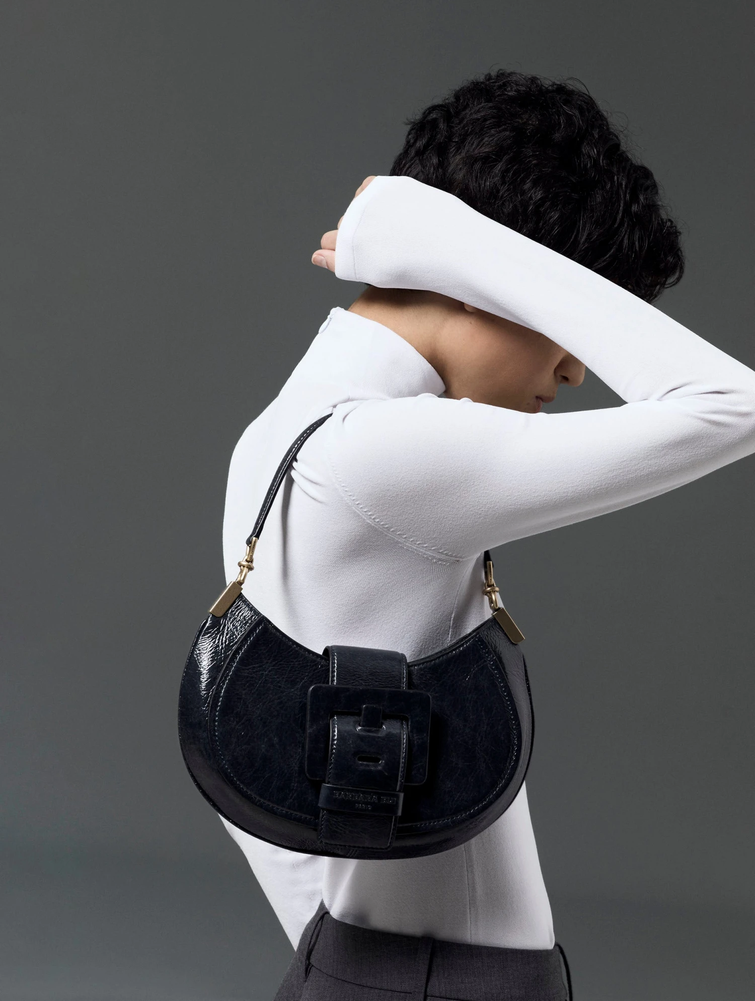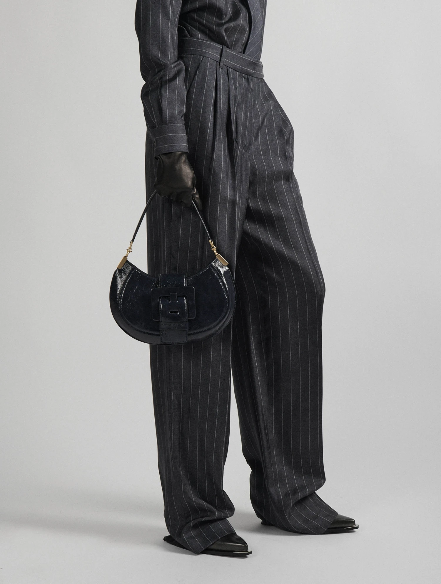Sac « KISS ME » en cuir verni naplak bleu nuit. Zippé sur le dessus, la ceinture à fermeture magnétique forme un rabat. Il est habillé de la maxi boucle en cuir renforcé, signature de notre ligne de sacs « ME ». Poignée-bandoulière pour un porter main ou petite épaule. Intérieur avec poche plaquée. Hauteur : 20 cm / Longueur : 28 cm / Profondeur : 8 cm.
