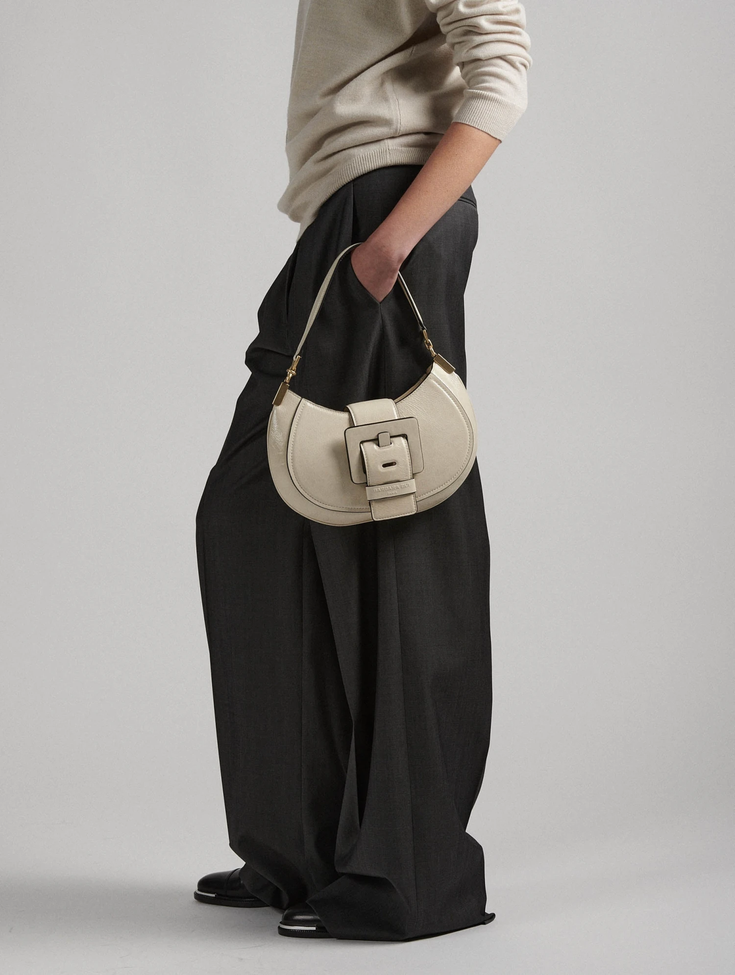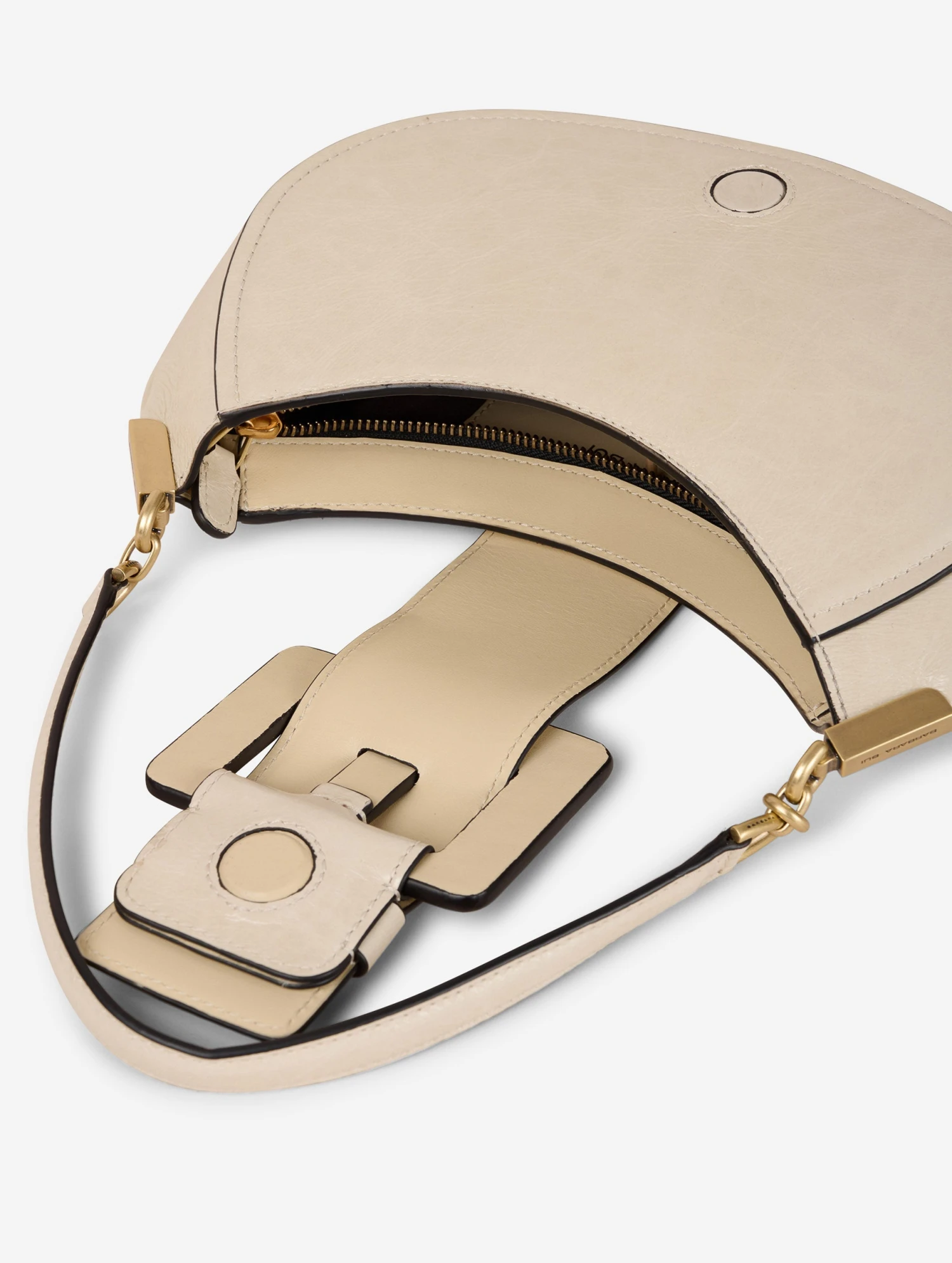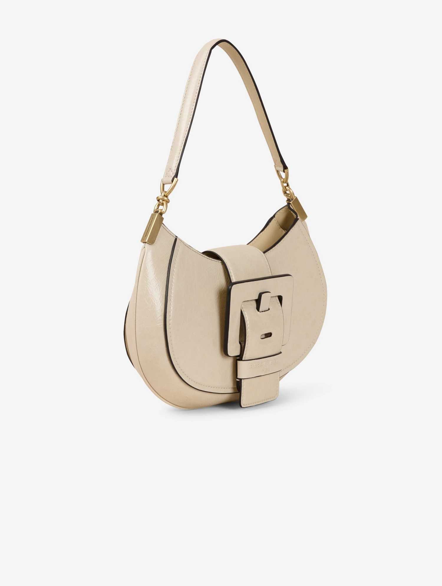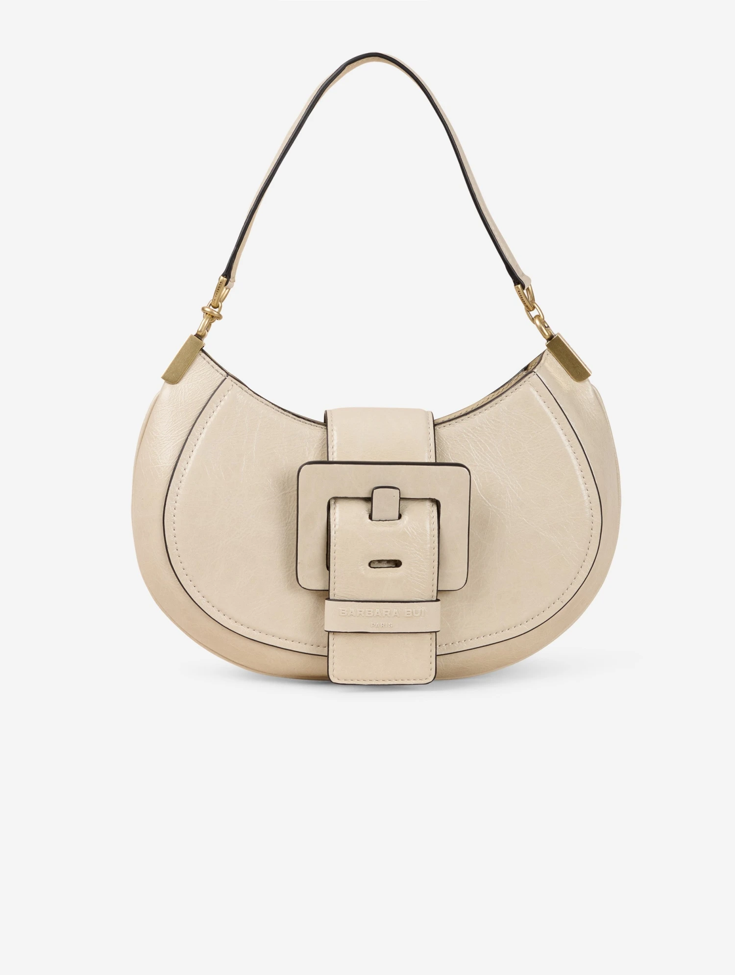 Sac « KISS ME » en cuir verni naplak ivoire. Zippé sur le dessus, la ceinture à fermeture magnétique forme un rabat. Il est habillé de la maxi boucle en cuir renforcé, signature de notre ligne de sacs « ME ». Poignée-bandoulière pour un porter main ou petite épaule. Intérieur avec poche plaquée. Hauteur : 20 cm / Longueur : 28 cm / Profondeur : 8 cm.