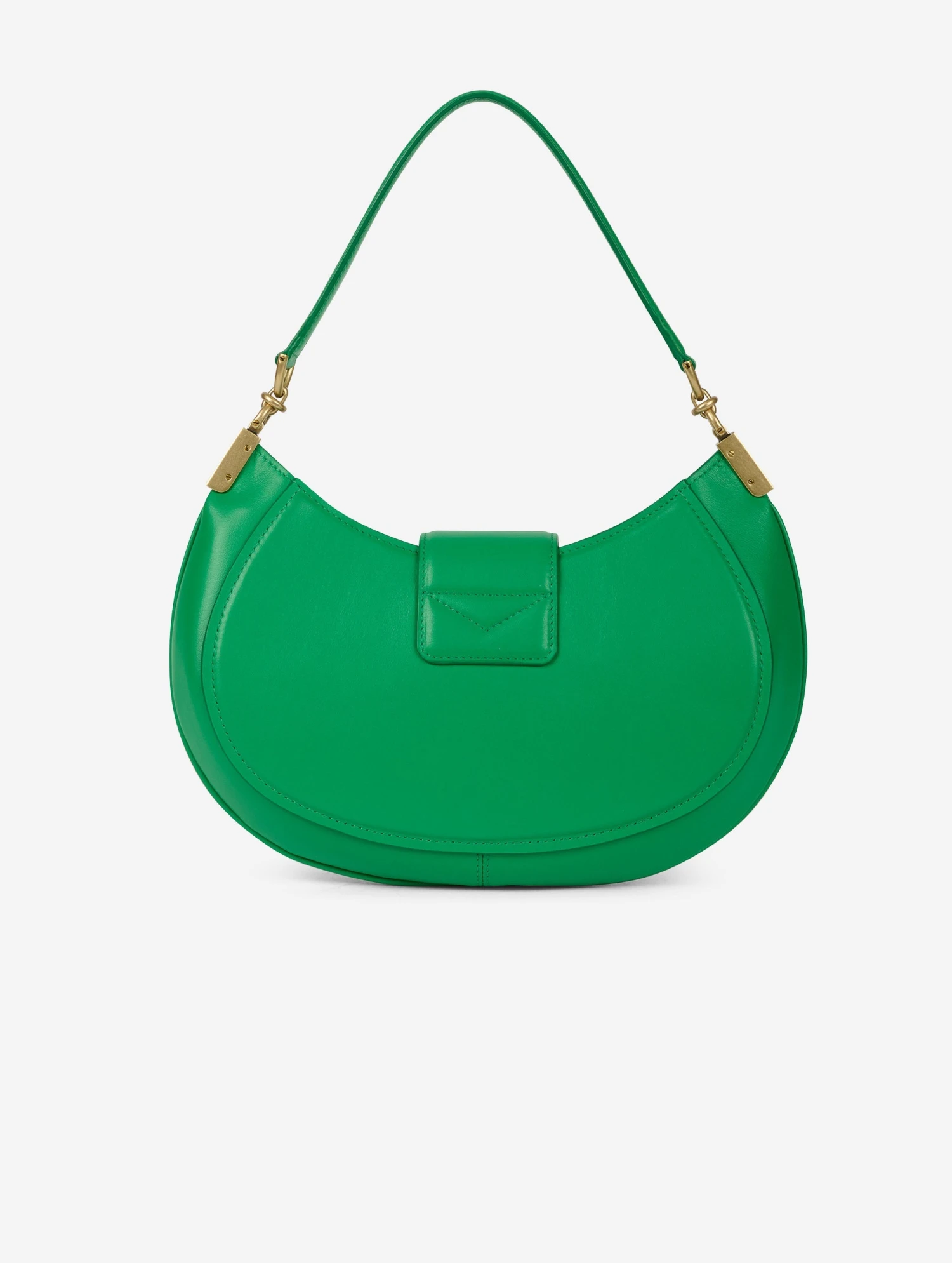 Sac « KISS ME » en veau satiné vert prairie. Zippé sur le dessus, la ceinture à fermeture magnétique forme un rabat. Il est habillé de la maxi boucle en cuir renforcé, signature de notre ligne de sacs « ME ». Poignée-bandoulière pour un porter main ou petite épaule. Intérieur avec poche plaquée. Hauteur : 20 cm / Longueur : 28 cm / Profondeur : 8 cm.