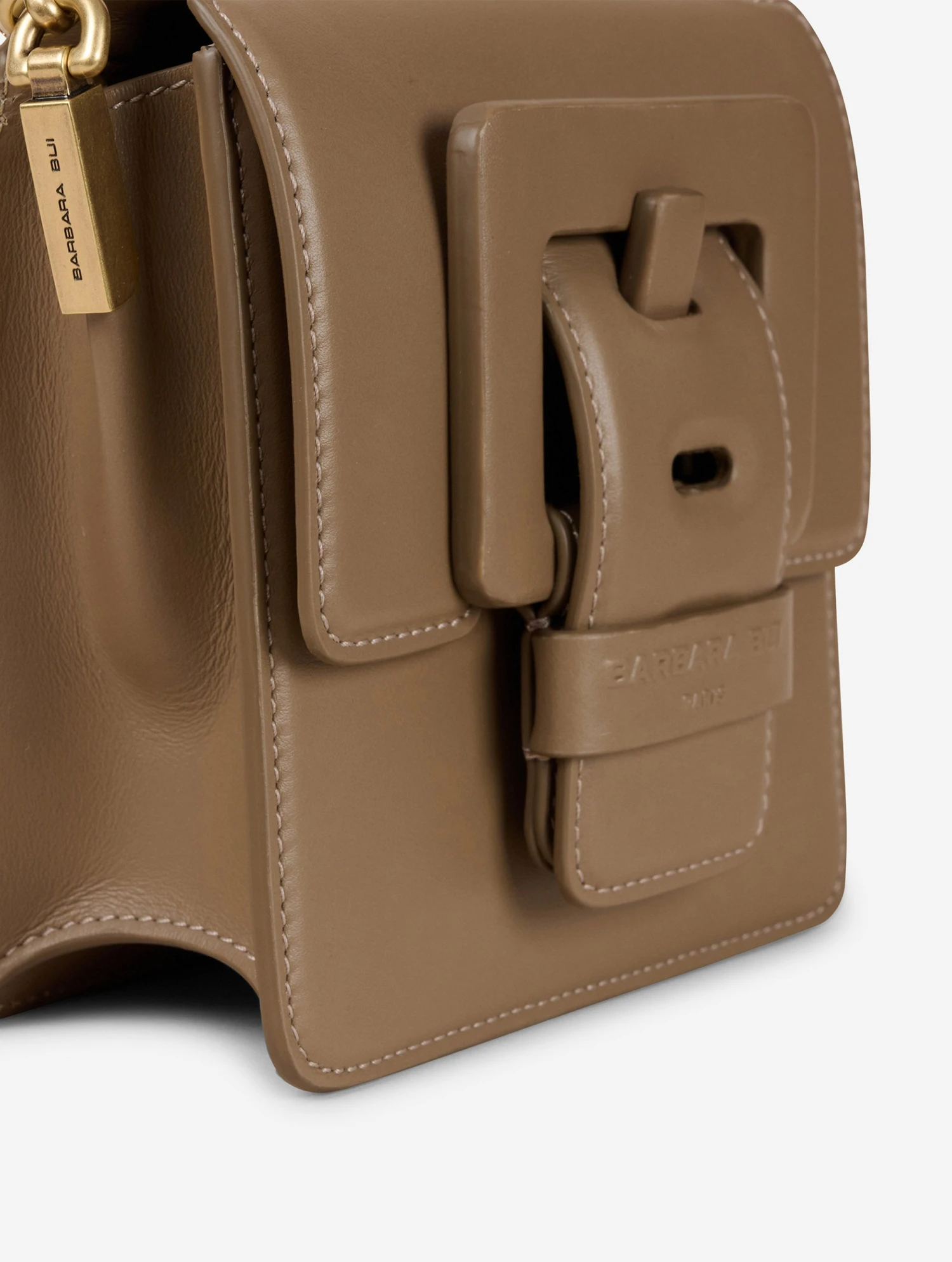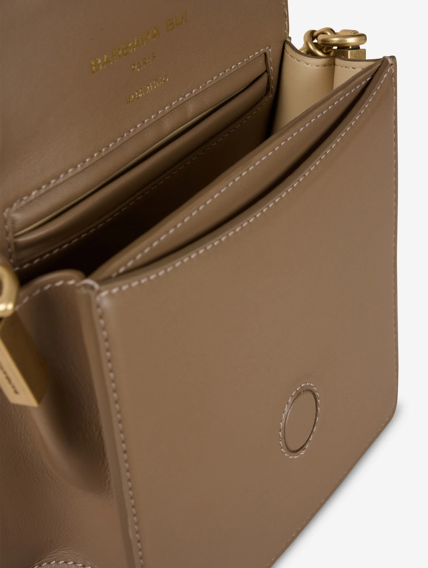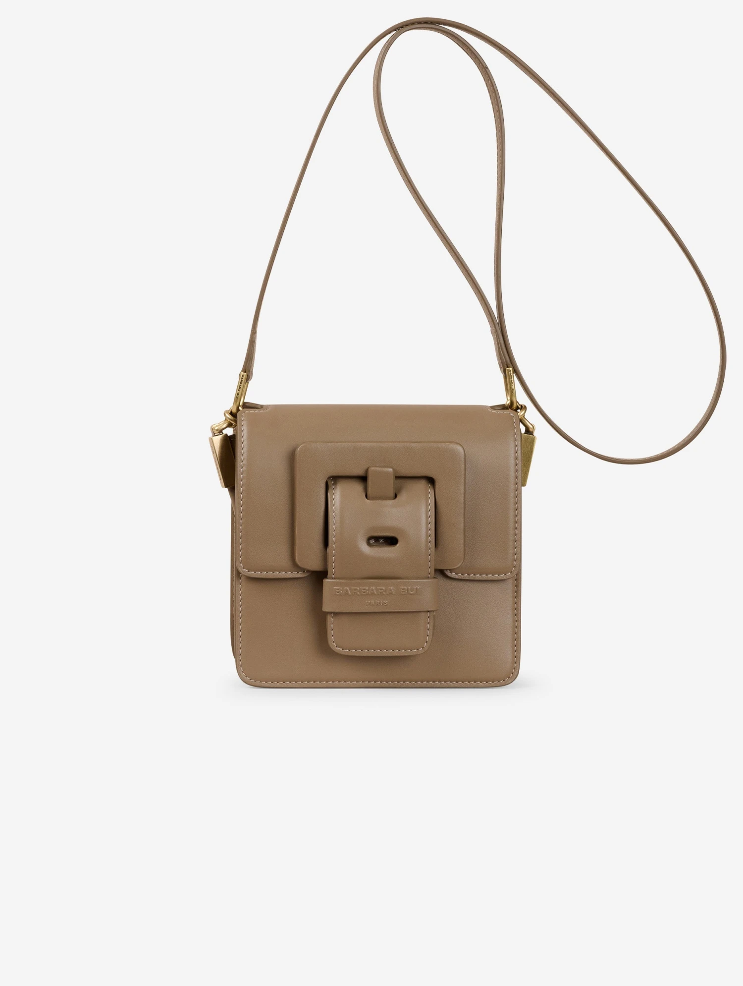 Sac « LOVE ME » en cuir satiné mastic. Fine et longue bandoulière de 120 cm pour le porter croisé. Maxi boucle décorative en cuir renforcé sur le rabat à fermoir magnétique. Poche avant, poche dos idéale pour garder son smartphone sous la main, et poche intérieure passepoilée. Hauteur 16 cm / Longueur : 16 cm / Profondeur 6,5 cm.