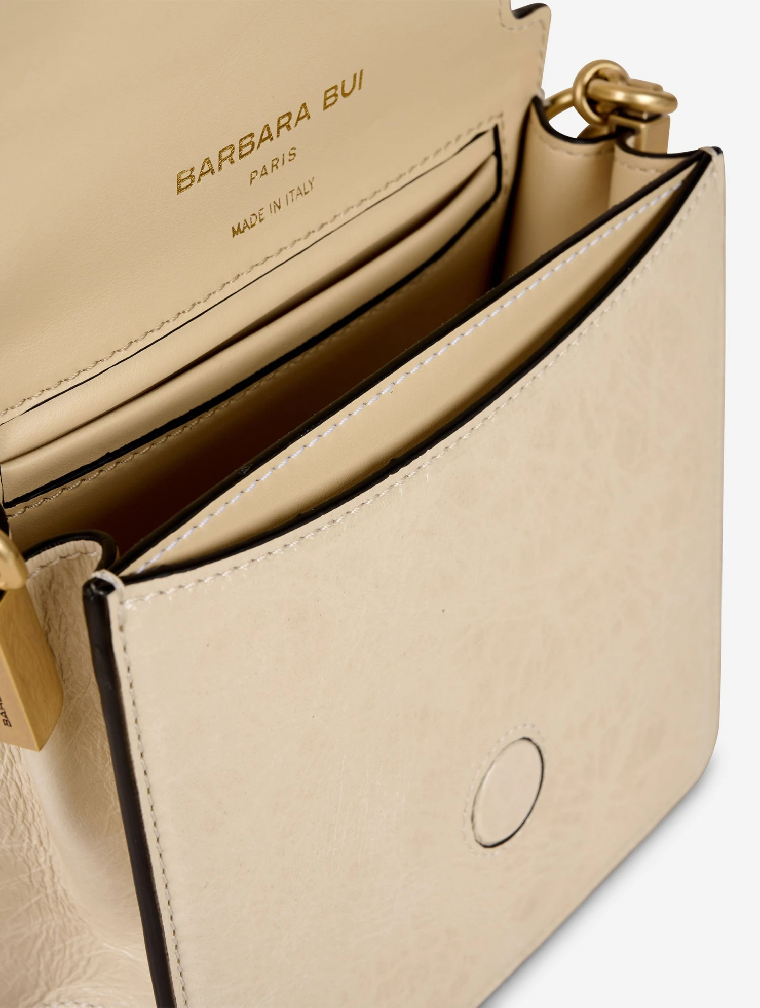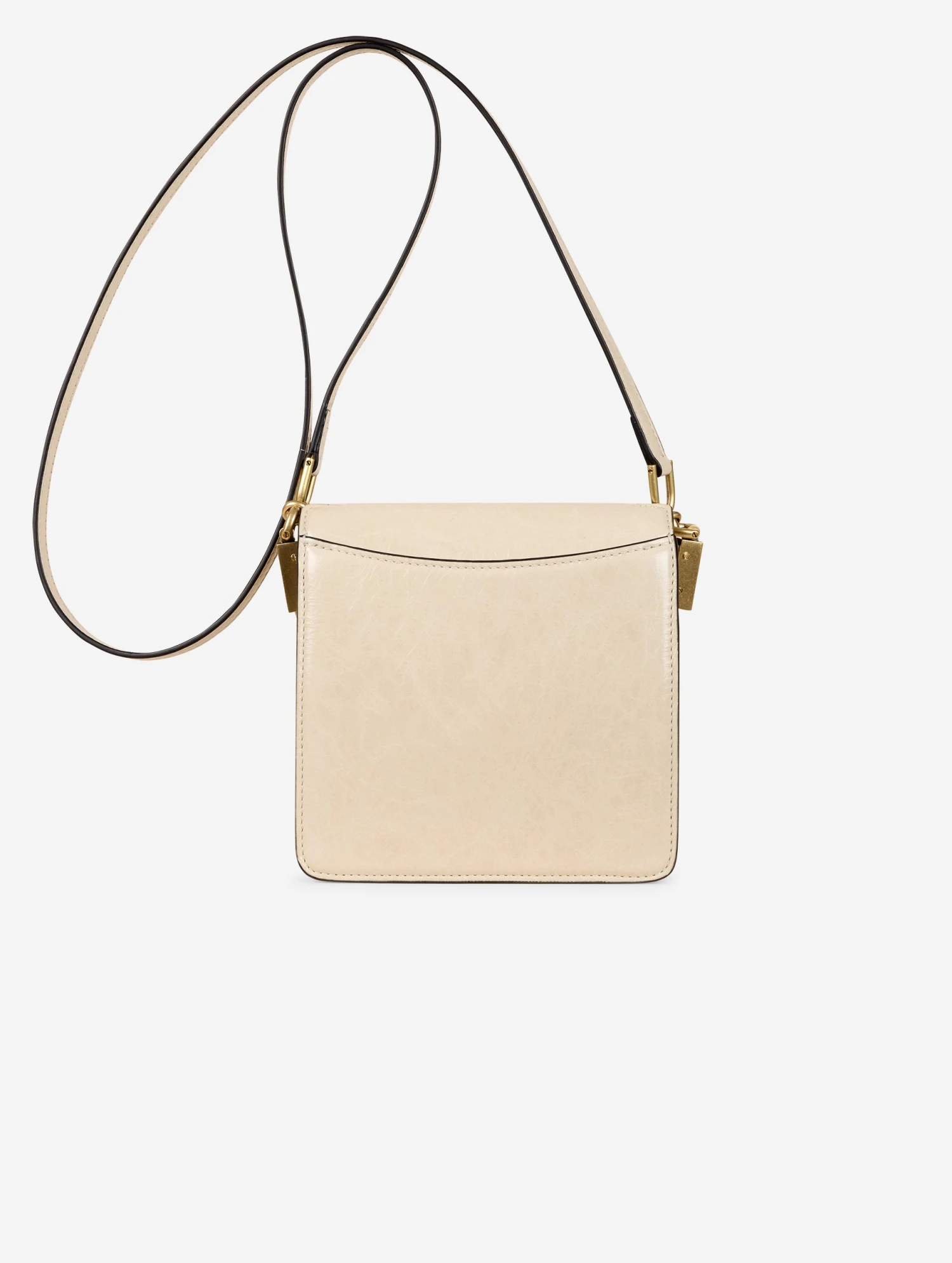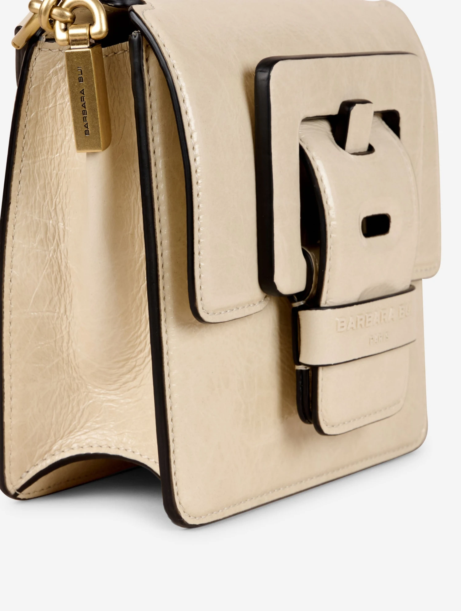 Sac « LOVE ME » en cuir verni naplak ivoire. Fine et longue bandoulière de 120 cm pour le porter croisé. Maxi boucle décorative en cuir renforcé sur le rabat à fermoir magnétique. Poche avant, poche dos idéale pour garder son smartphone sous la main, et poche intérieure passepoilée. Hauteur 16 cm / Longueur : 16 cm / Profondeur 6,5 cm.