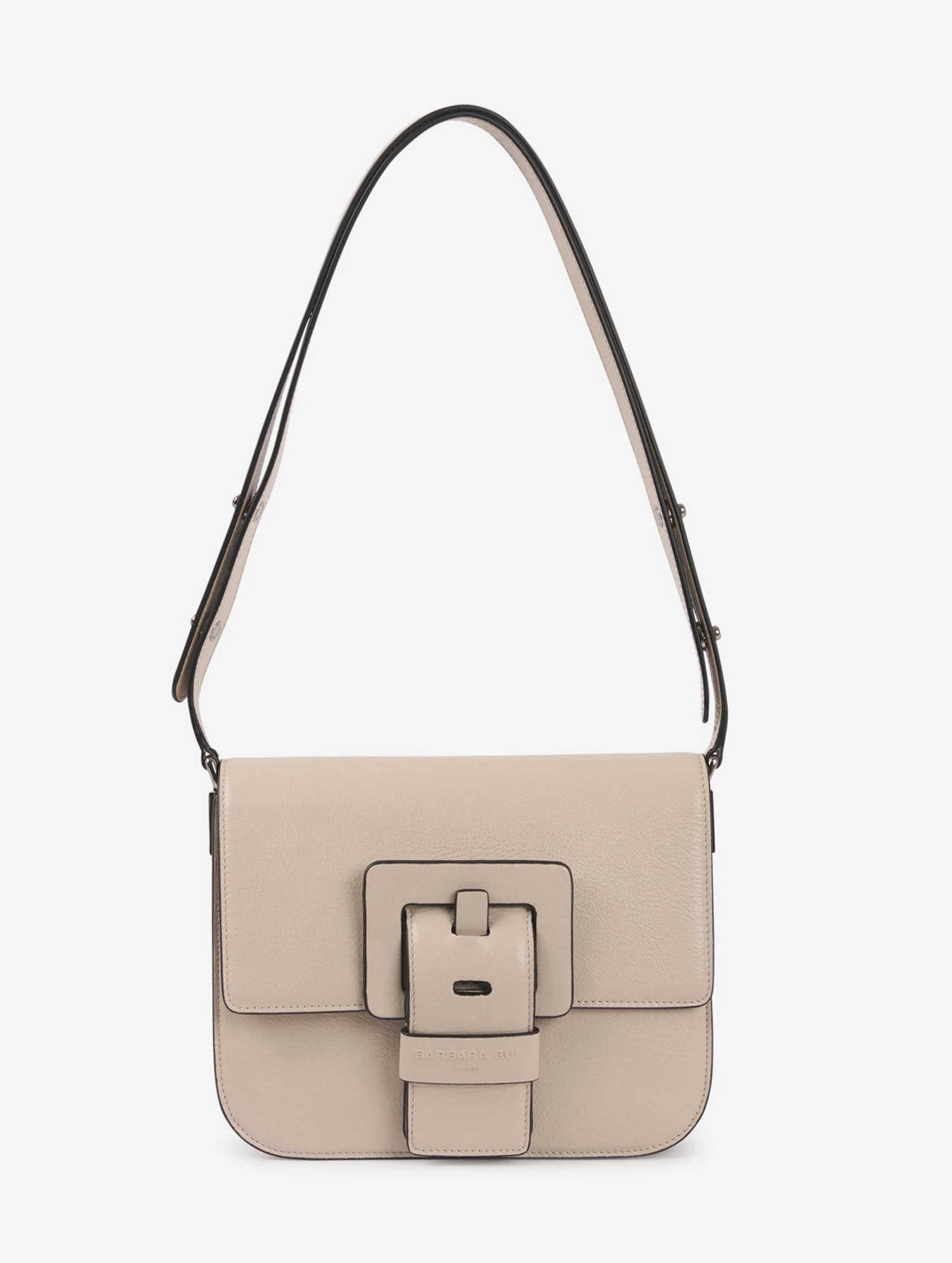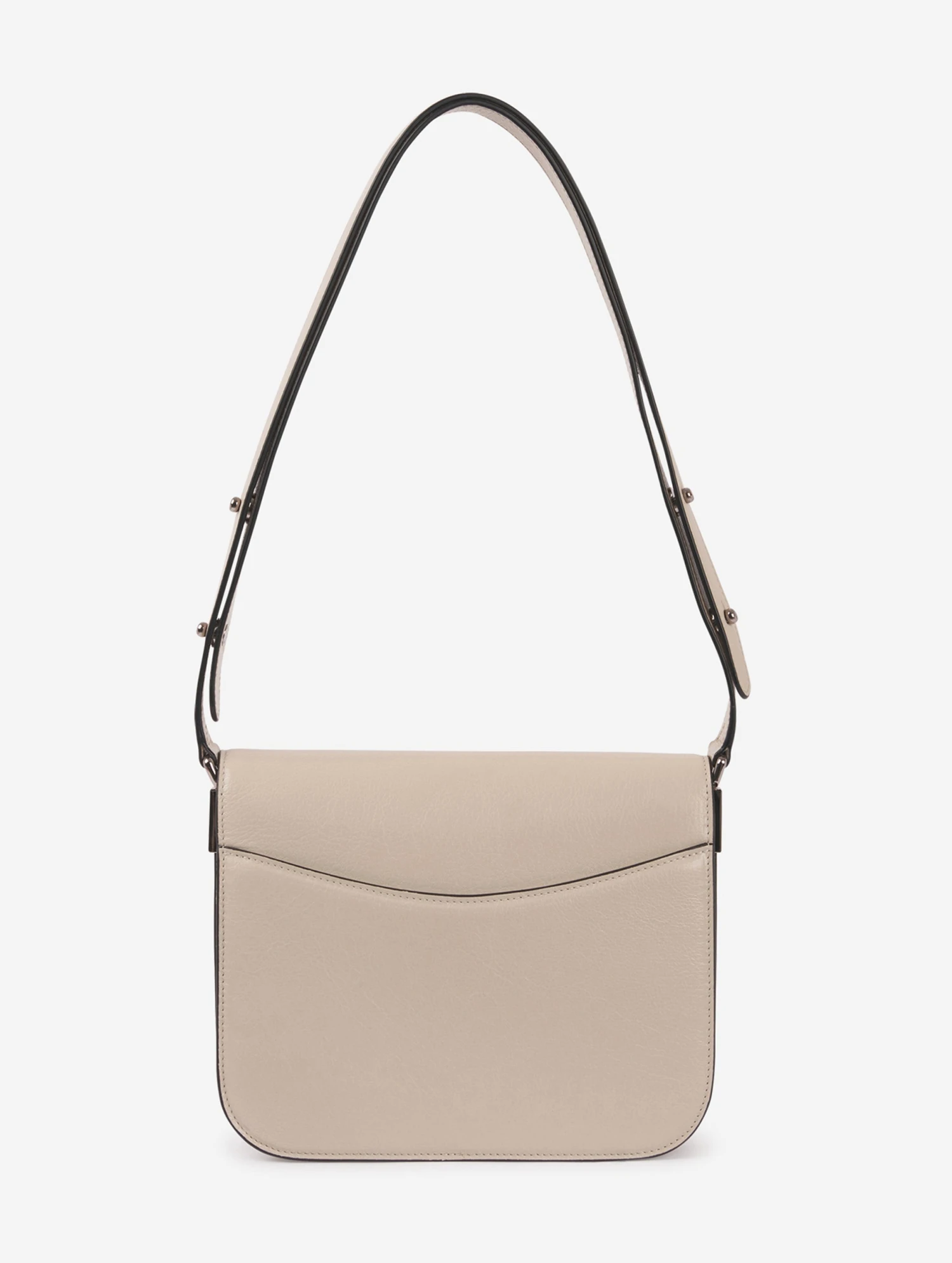 Sac « TOUCH ME » en cuir madras grainé ivoire finition glacée. Bandoulière double, déployante pour un porté plus casual. Boucle décorative en cuir renforcé sur le rabat à fermoir magnétique. Poches dos et devant, double compartiment intérieur avec poches. Hauteur : 19cm / Largeur : 22,5cm / Profondeur 7,5cm.