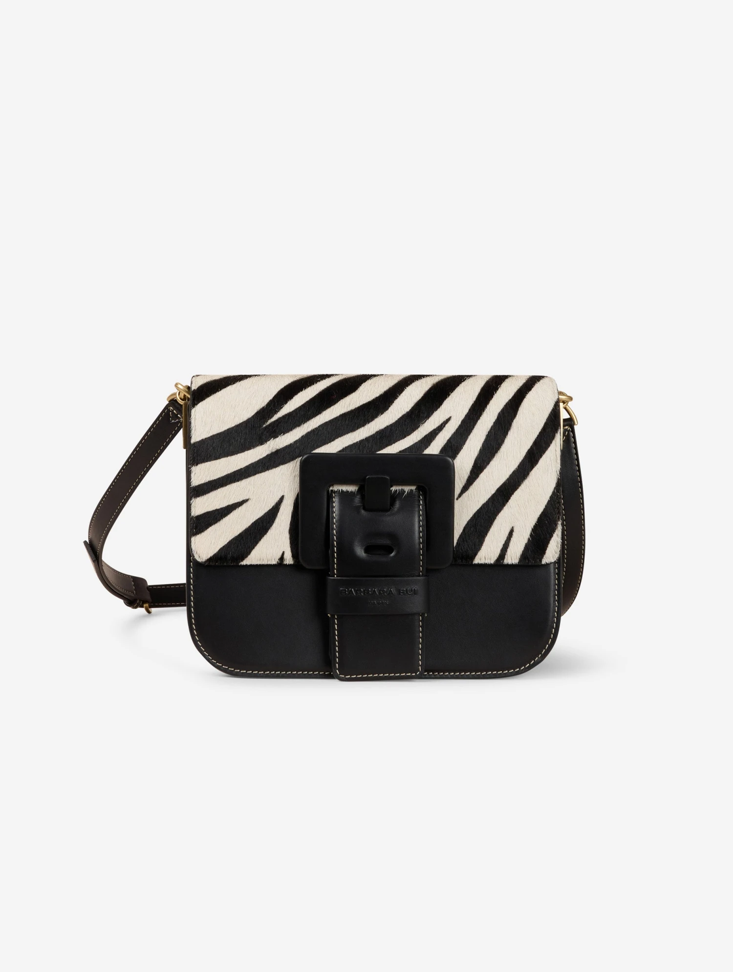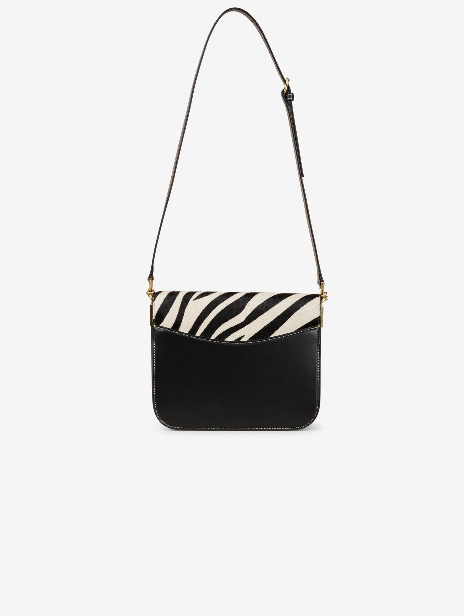 Sac « TOUCH ME » en cuir noir avec rabat en cuir façon poulain imprimé zèbre noir et blanc. Rabat à fermeture magnétique habillé de la maxi boucle en cuir renforcé, signature de notre ligne de sacs « ME ». Bandoulière réglable avec boucle pour un porté épaule ou croisé. Poche dos et devant, double compartiment intérieur avec poches. Hauteur : 19 cm / Longueur : 22,5 cm / Profondeur : 7,5 cm.