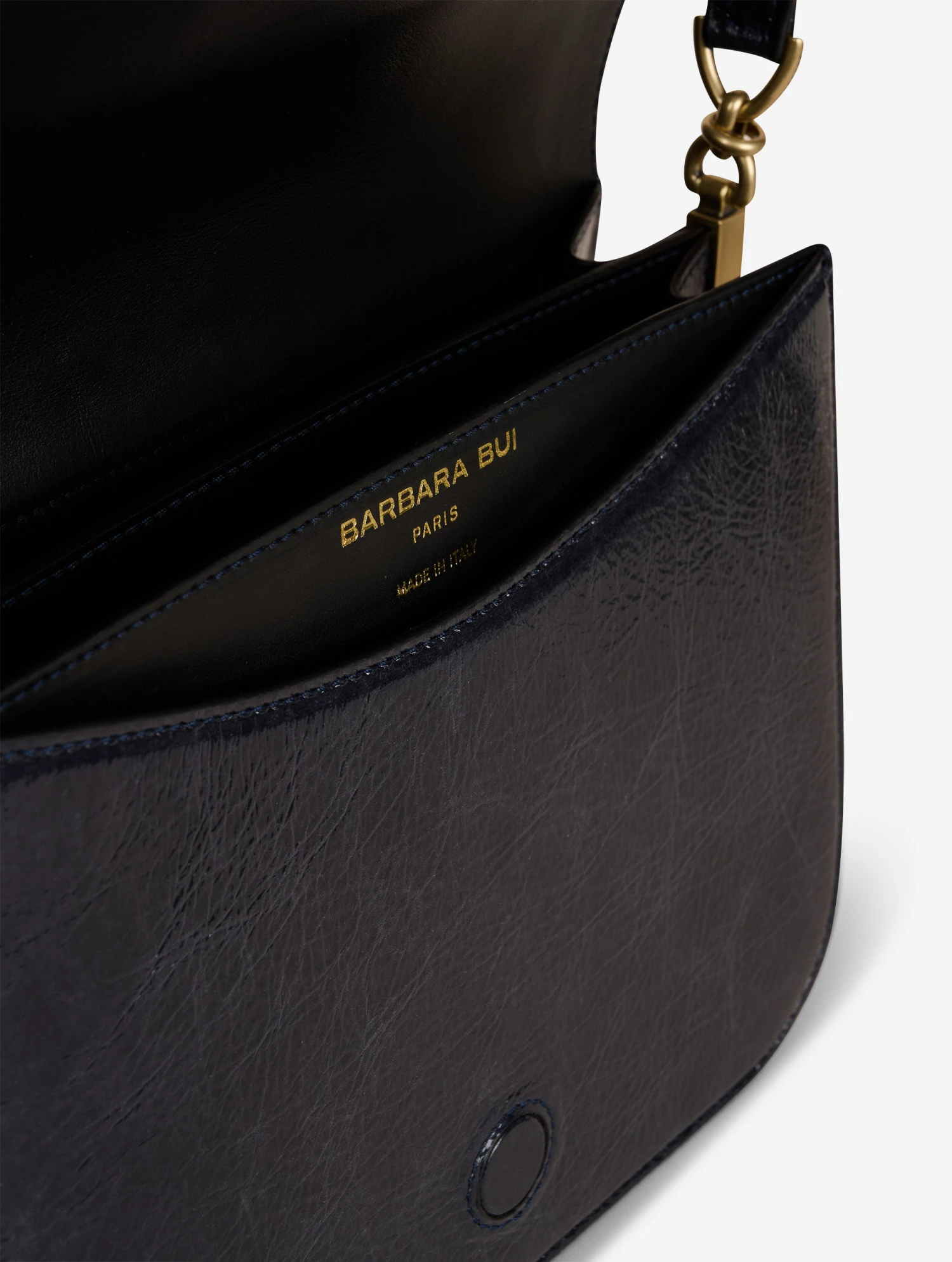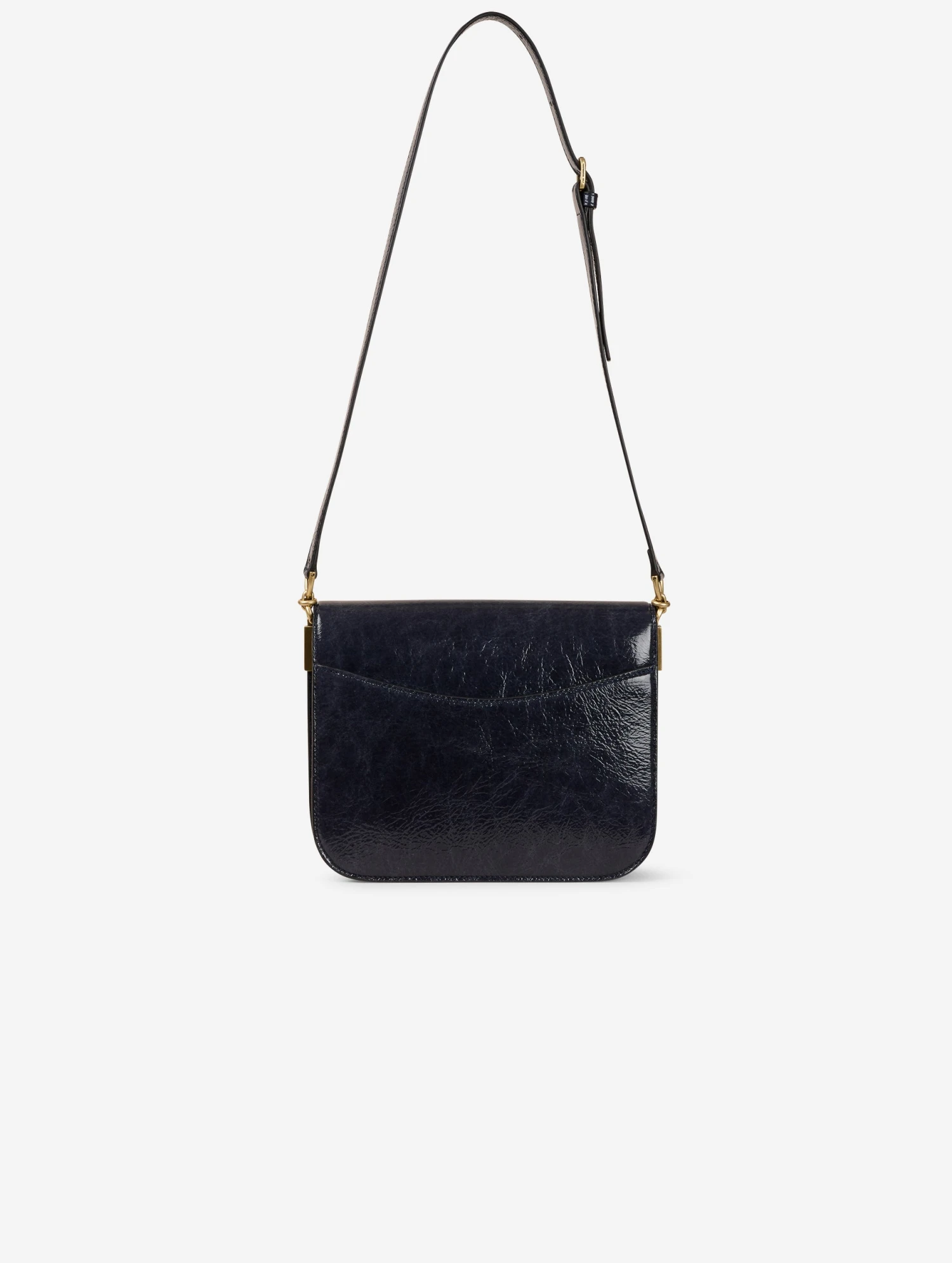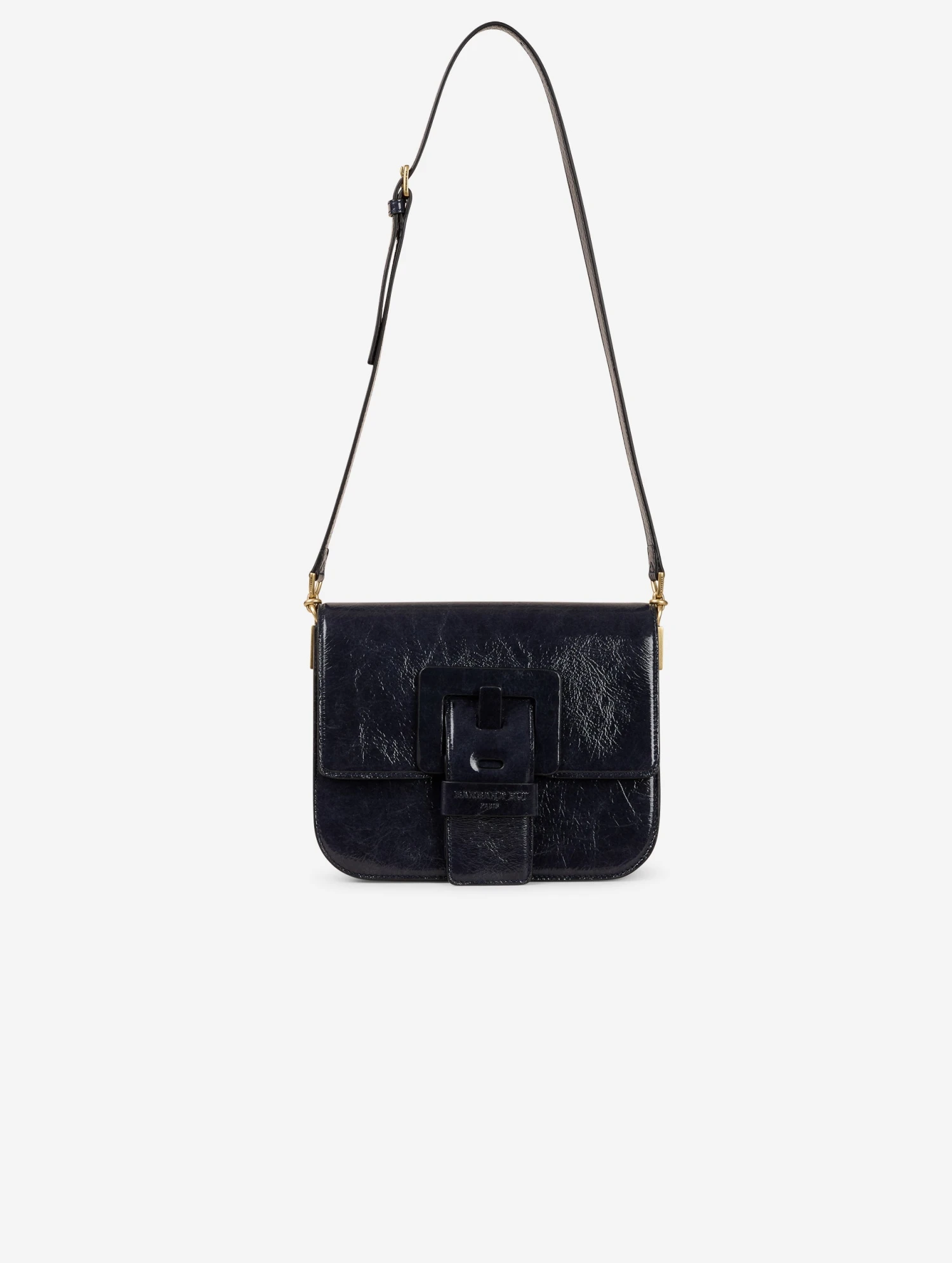 Sac « TOUCH ME » en cuir verni naplak bleu nuit. Rabat à fermeture magnétique habillé de la maxi boucle en cuir renforcé, signature de notre ligne de sacs « ME ». Bandoulière réglable avec boucle pour un porté épaule ou croisé. Poche dos et devant, double compartiment intérieur avec poches. Hauteur : 19 cm / Longueur : 22,5 cm / Profondeur : 7,5 cm.