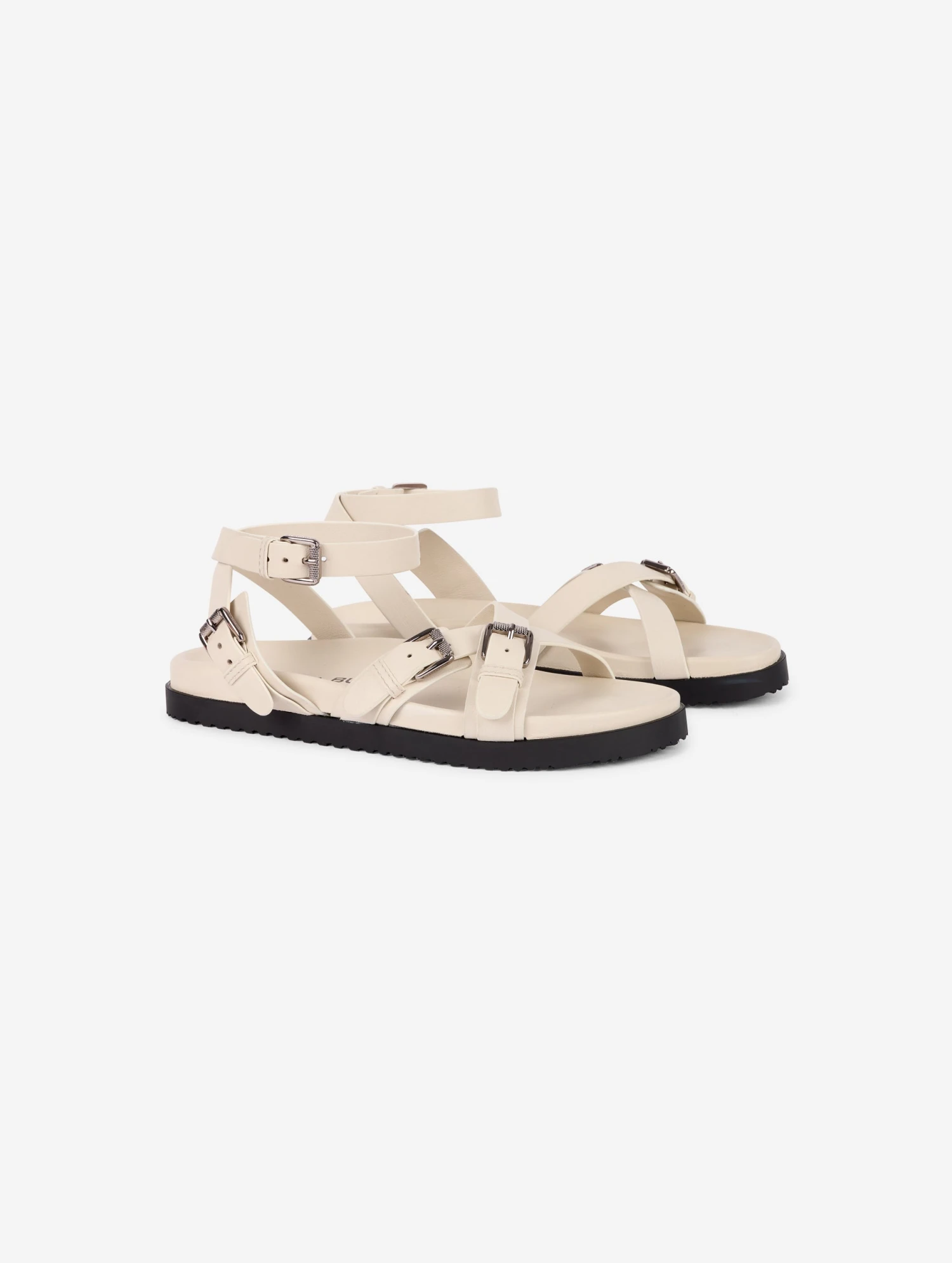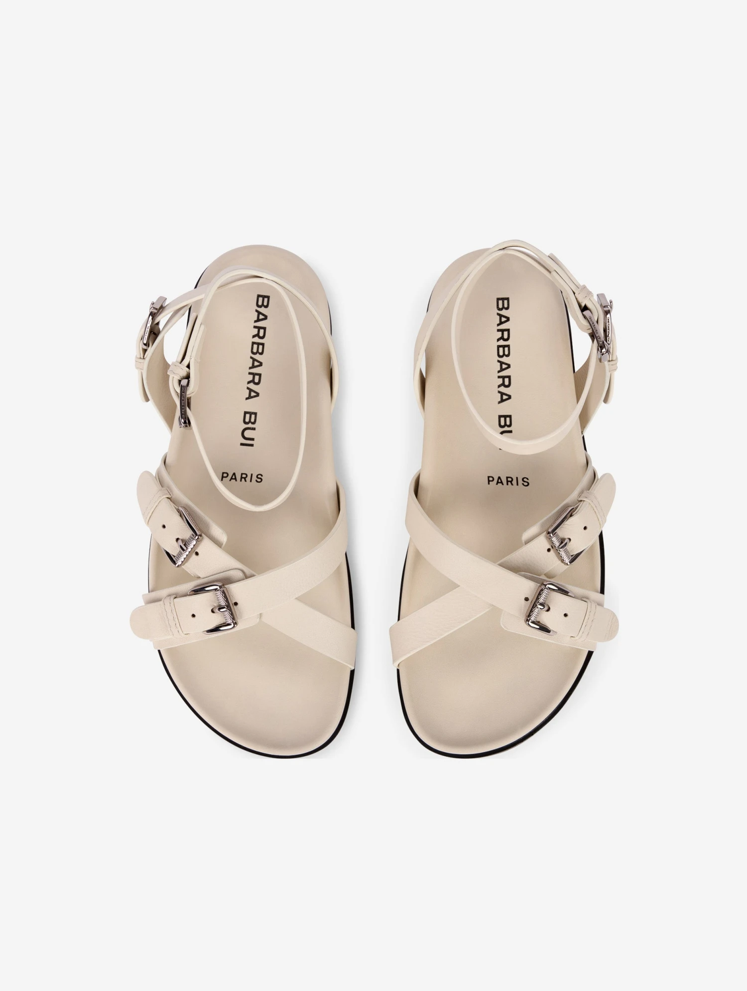 Sandales à brides croisées en nappa beige. Effet double face sans couture, finitions tranches cirées façon maroquinerie. Jeux de boucles striées finition nickel sur renforts en cuir. Semelle anatomique également recouverte de nappa beige. Semelle en gomme crantée.