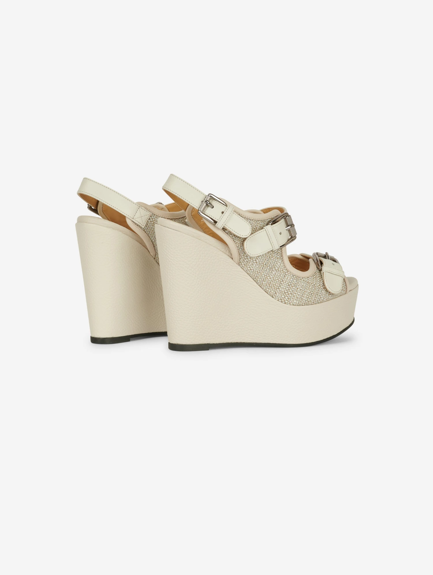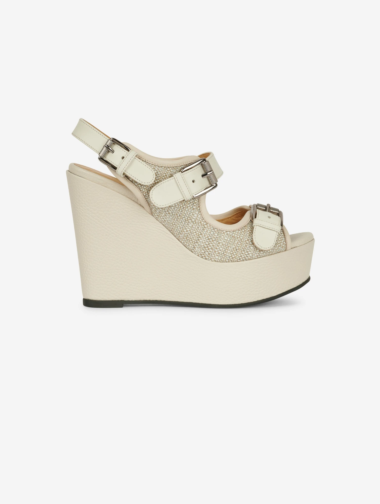 Sandales Compensées En Cuir Et Tissu Ivoire