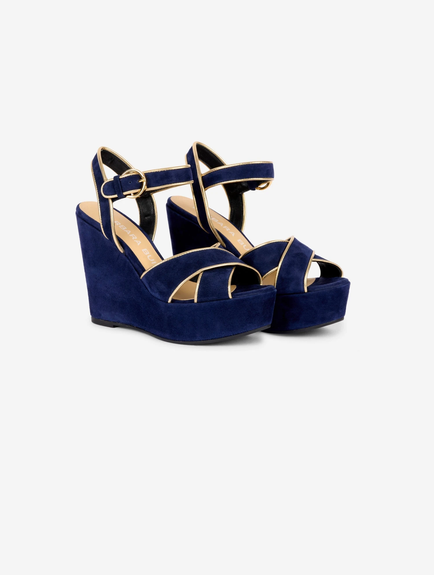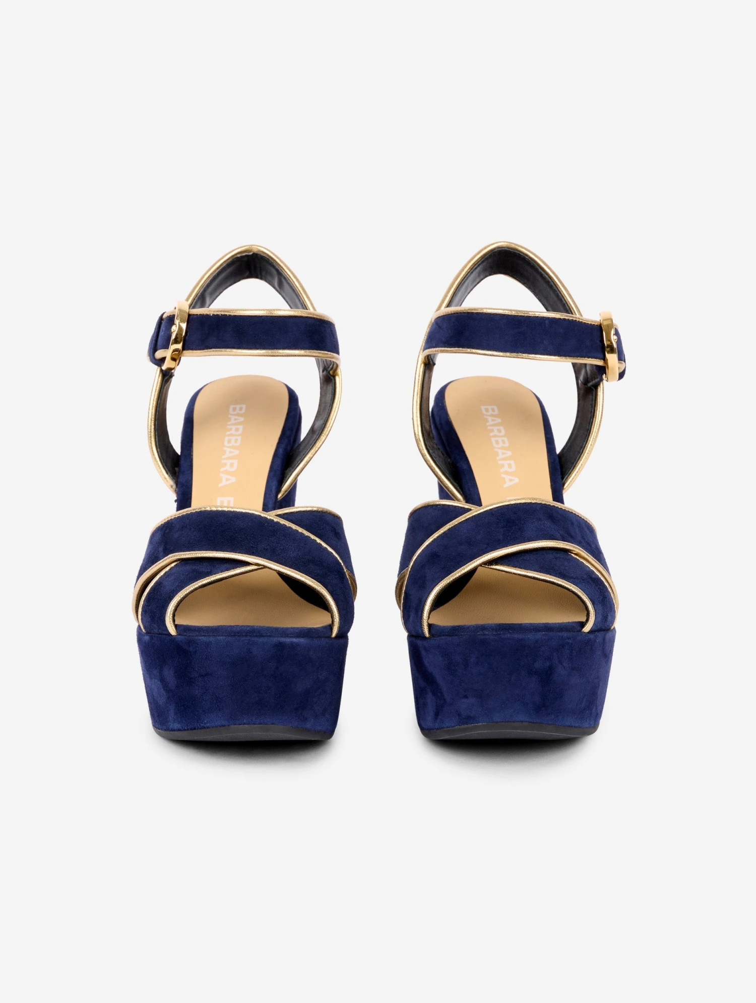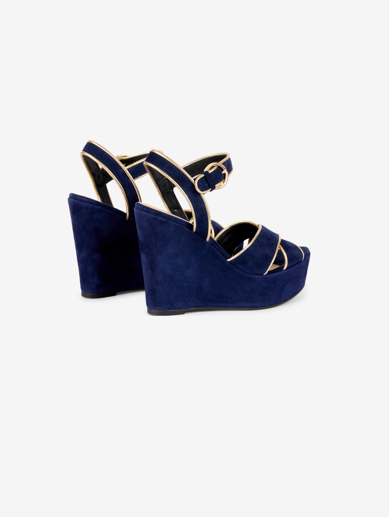 Sandales à brides croisées en daim bleu marine bordé de nappa métallisé doré. Bride cheville retenue par une boucle dorée. Compensé de 12 cm recouvert de daim assorti, patin avant de 4 cm.