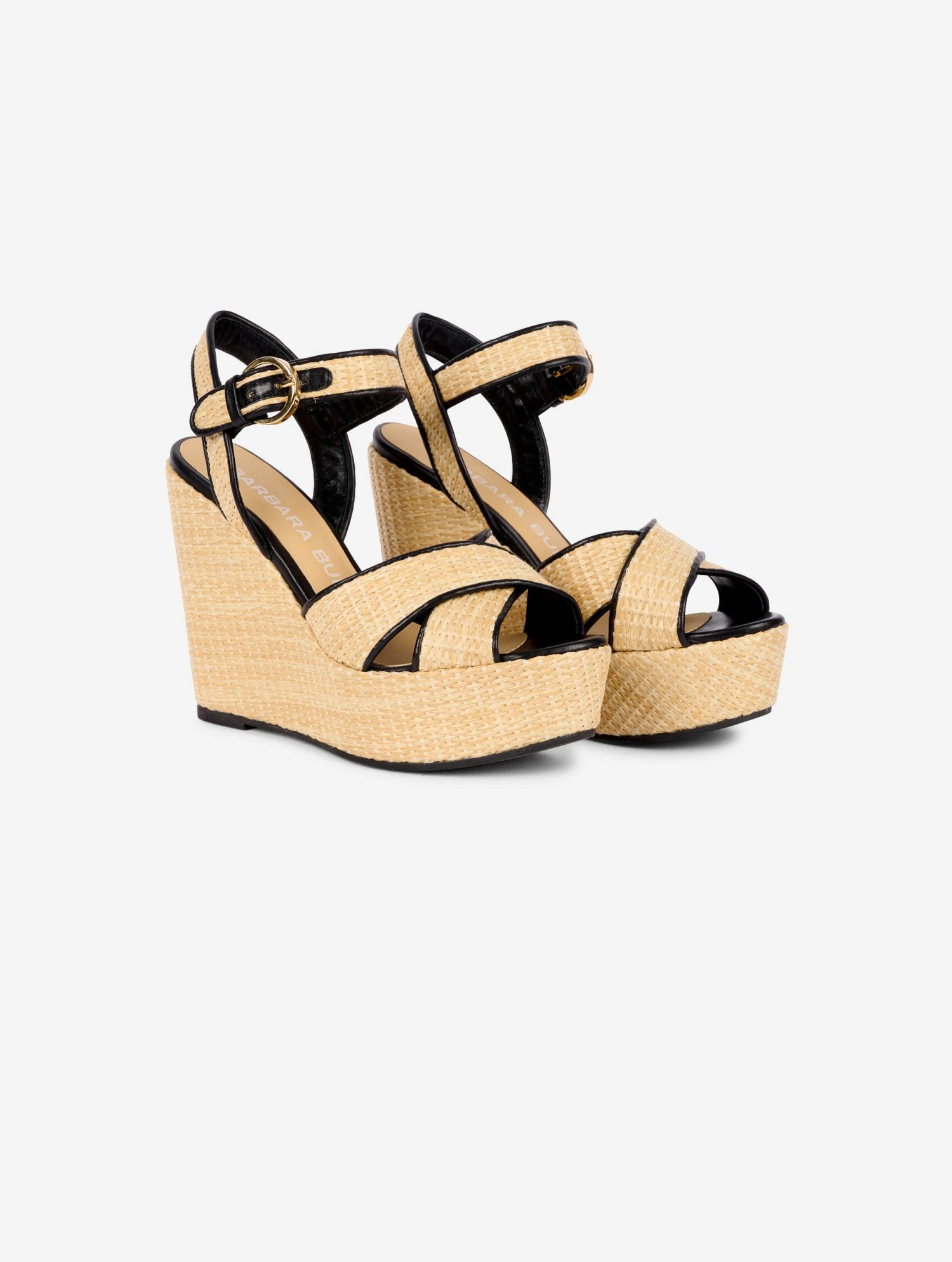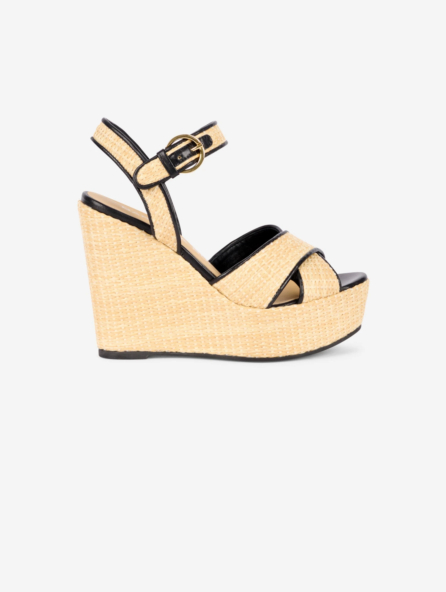 Sandales à brides croisées en tissu effet paille naturelle bordée de nappa noir. Bride cheville retenue par une boucle dorée. Compensé de 12 cm recouvert de raphia, patin avant de 4 cm.