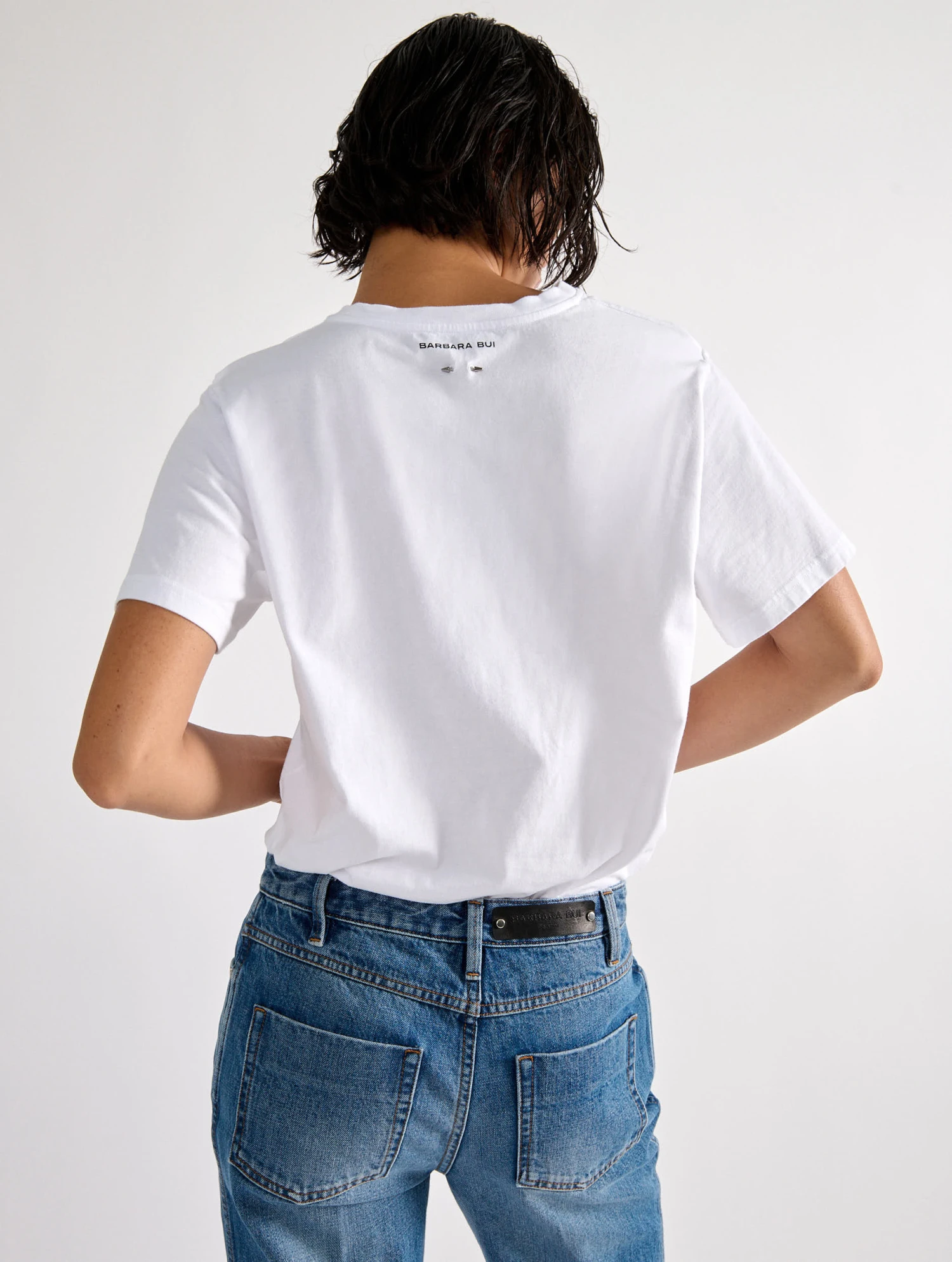 Ce tee-shirt en coton doux et confortable se distingue par son encolure drapée créant une ouverture féminine sur l’arrondi de son décolleté. Résolument contemporain, ce tee-shirt femme est proposé dans un blanc lumineux ou un noir profond à marier à un pantalon en cuir pour une silhouette rock. Au dos, l’iconique bijou piercing Barbara Bui accompagne le logo de notre Maison parisienne.