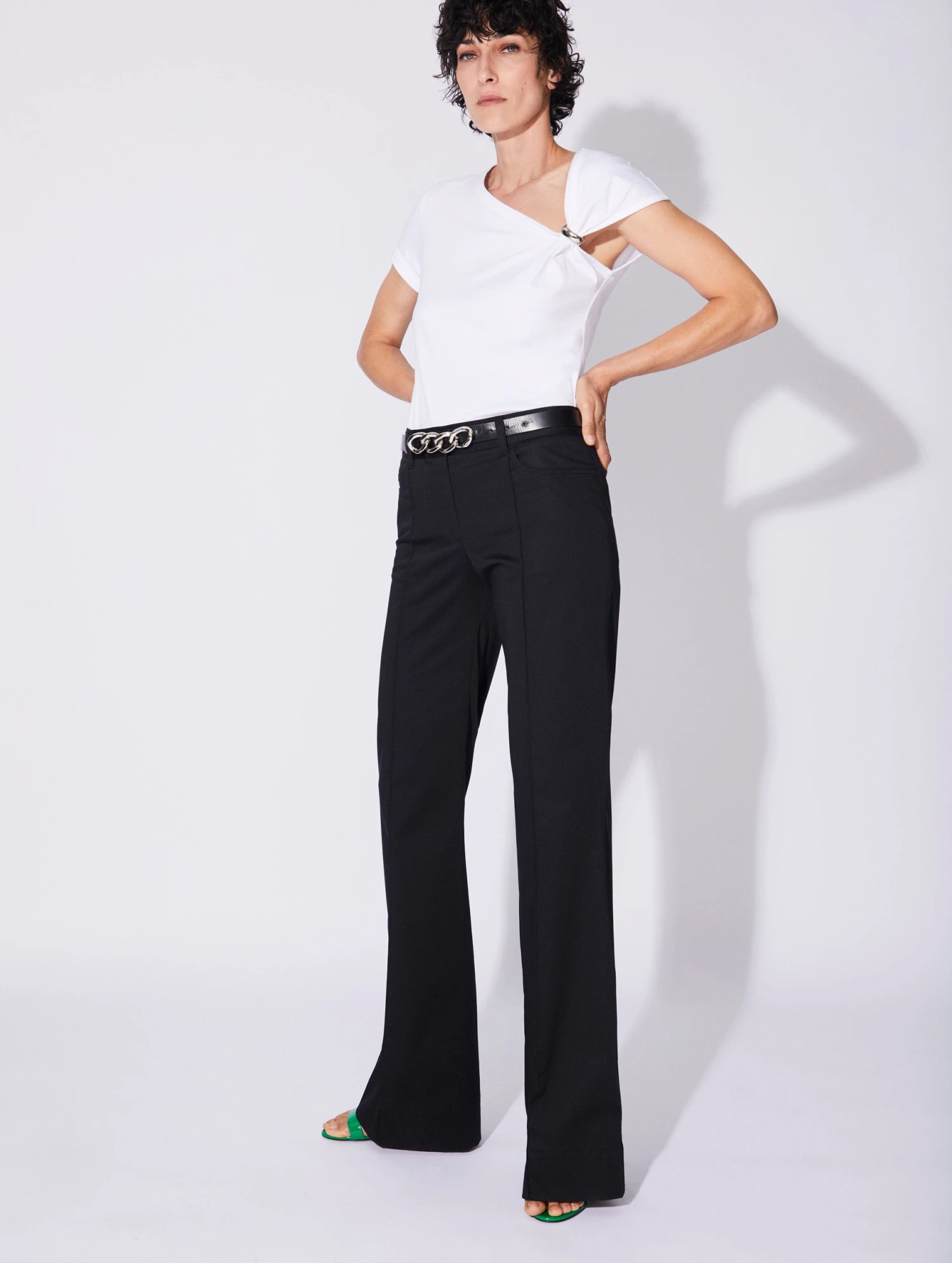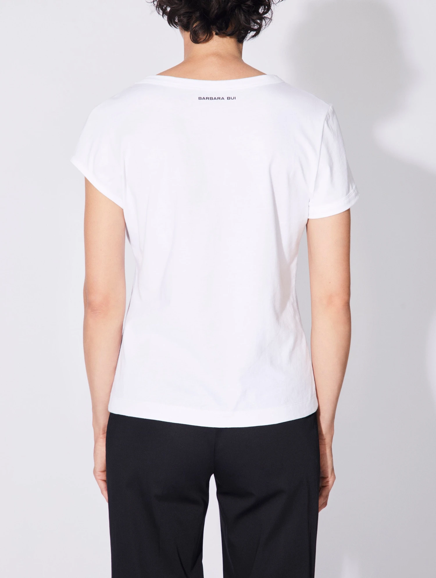 Le tee-shirt femme en jersey de coton doux et confortable acquiert chez Barbara Bui ses lettres de noblesse. Sa construction travaillée associe une emmanchure classique à un jeu de drapés pour créer un élégant effet d’asymétrie, retenu par un clip bijou en métal argenté amovible. Proposé en jersey de coton noir ou en blanc, ce tee-shirt bijou deviendra rapidement une valeur sûre de votre garde-robe.