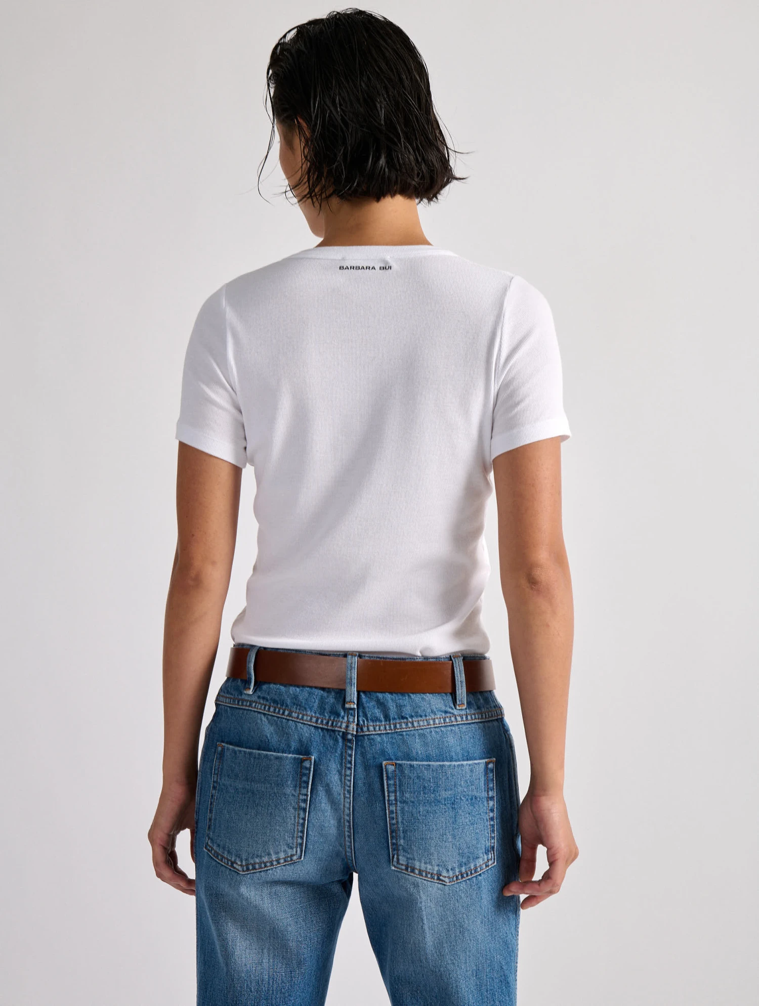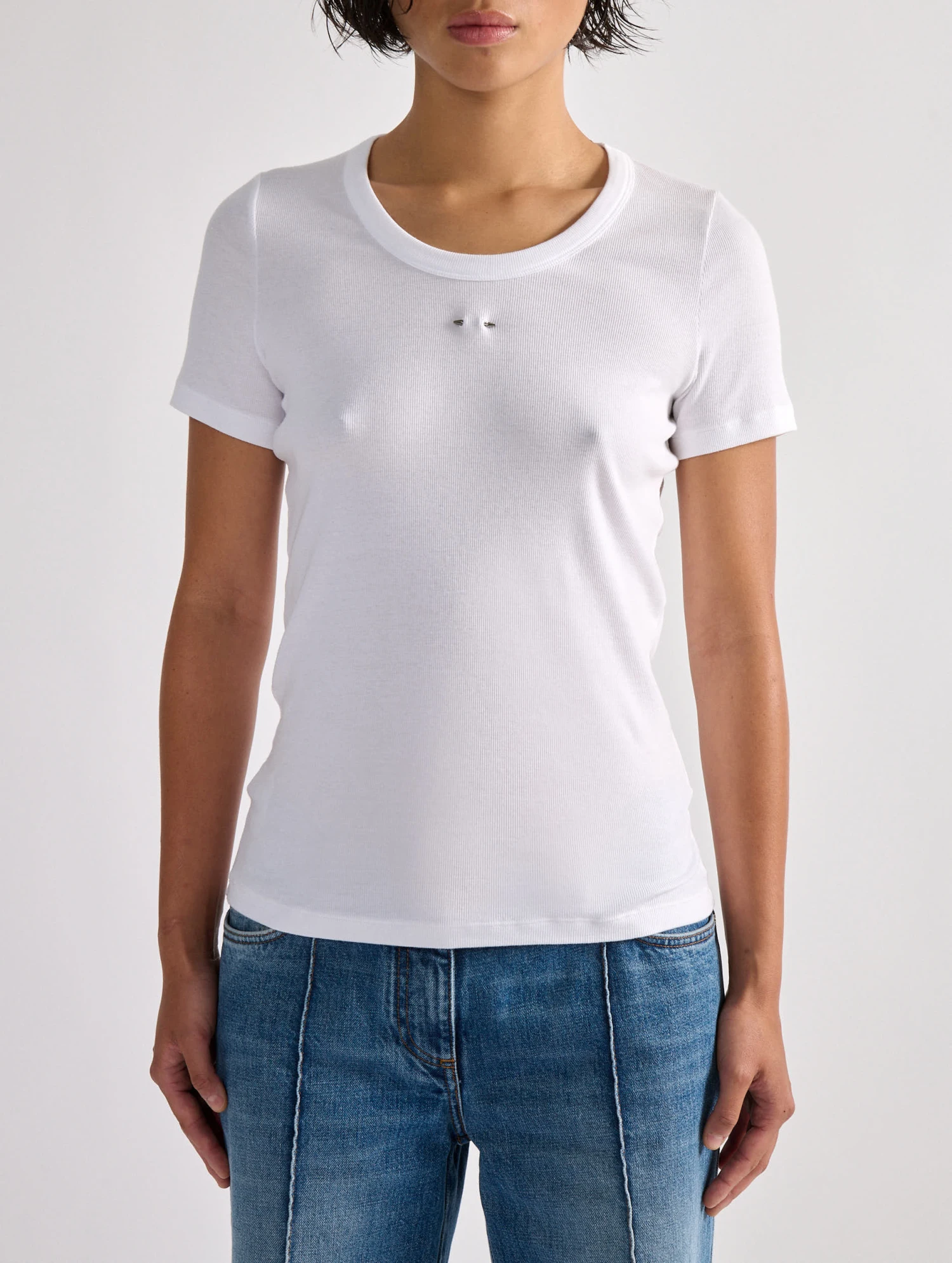 Essentiel du vestiaire féminin, quelle que soit la saison, le tee-shirt en jersey côtelé est proposé dans un coton stretch fin à la transparence maîtrisée. Son col rond seyant s’accompagne sur l’avant de notre iconique bijou piercing en métal argenté, une touche rock identitaire et amovible pour suivre vos envies.