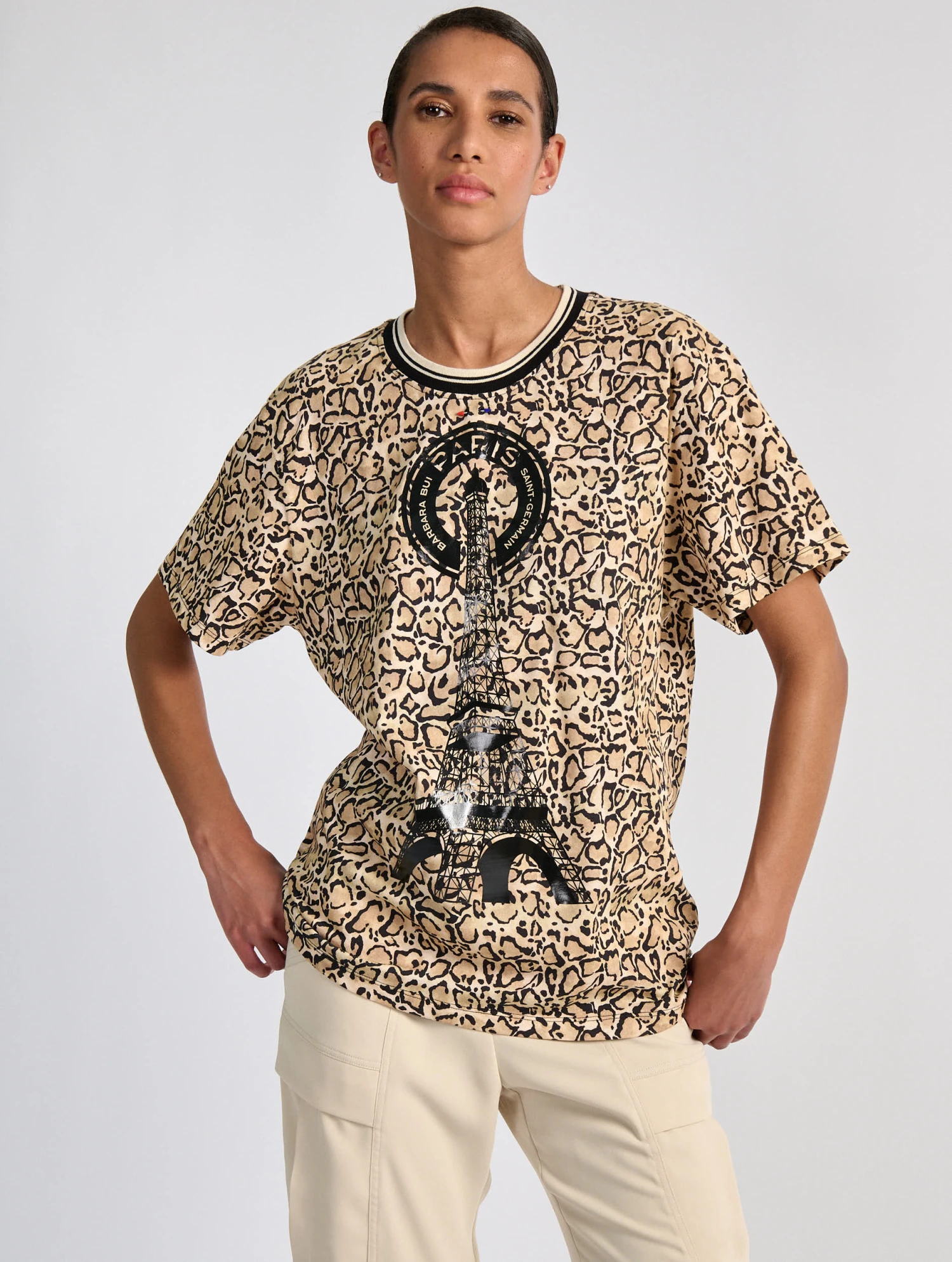 Tee-shirt manches courtes en coton imprimé bengale avec sérigraphie contrastée noire sur le devant. Sous l’encolure, piercing en métal laqué aux couleurs du PSG. Ce tee-shirt est issu de la collaboration Barbara Bui x PSG et compose la tenue officielle de l’équipe féminine du Paris Saint-Germain.