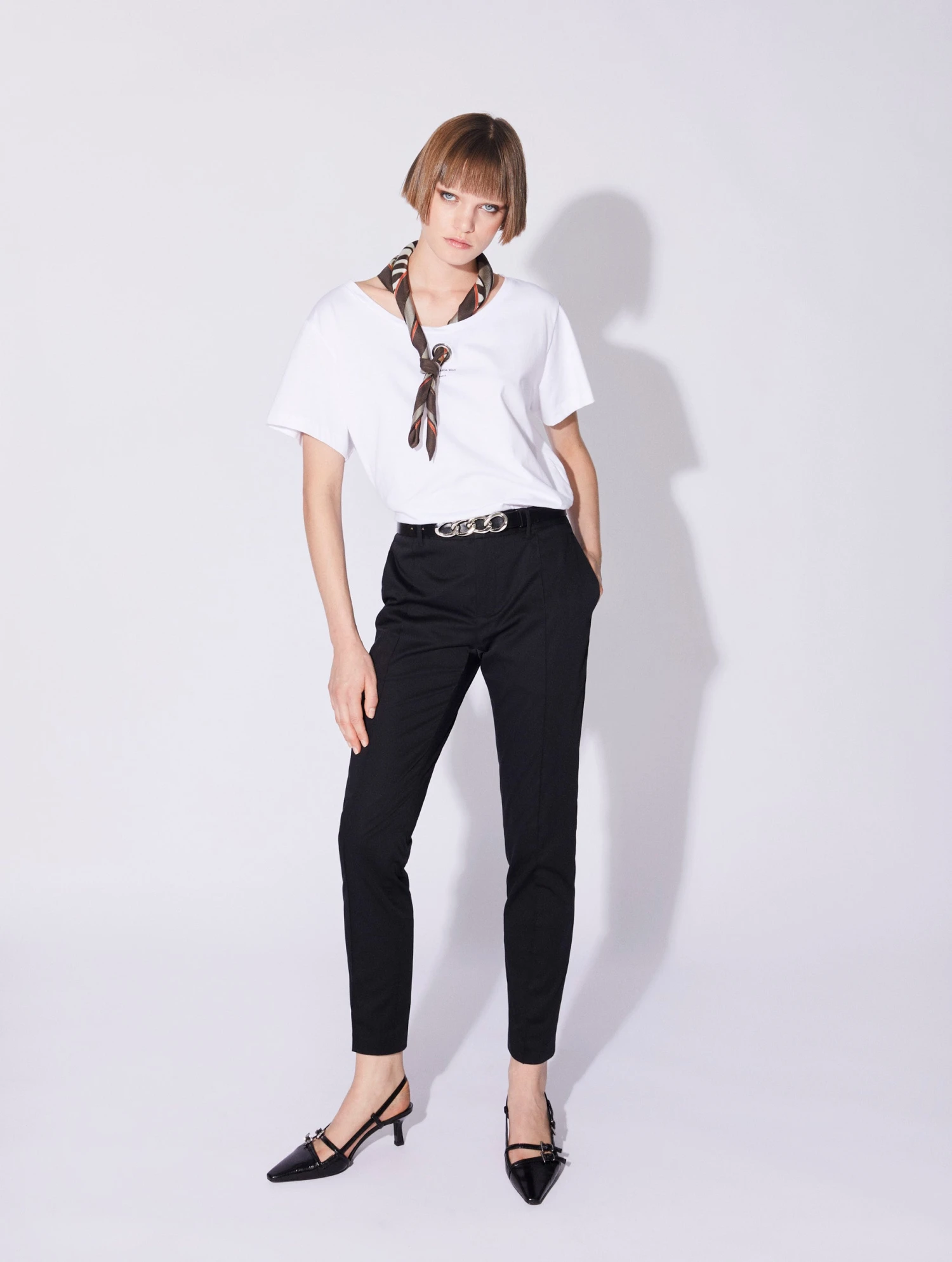 Ce tee-shirt en jersey de coton a été imaginé pour être porté avec un carré de soie. Son oeillet en métal argenté vous permet d’y glisser le foulard de votre choix pour créer un look unique en un geste. Nouez votre foulard ou votre bandana favori et vous voici immédiatement habillée et accessoirisée ! Proposé en jersey de coton blanc ou en noir, ce tee-shirt adopte une coupe légèrement ample plus confortable et une large encolure arrondie pour mieux mettre en valeur le foulard que vous aurez choisi. Accessoirisez-le au gré de vos envies ou portez-le également tel quel.