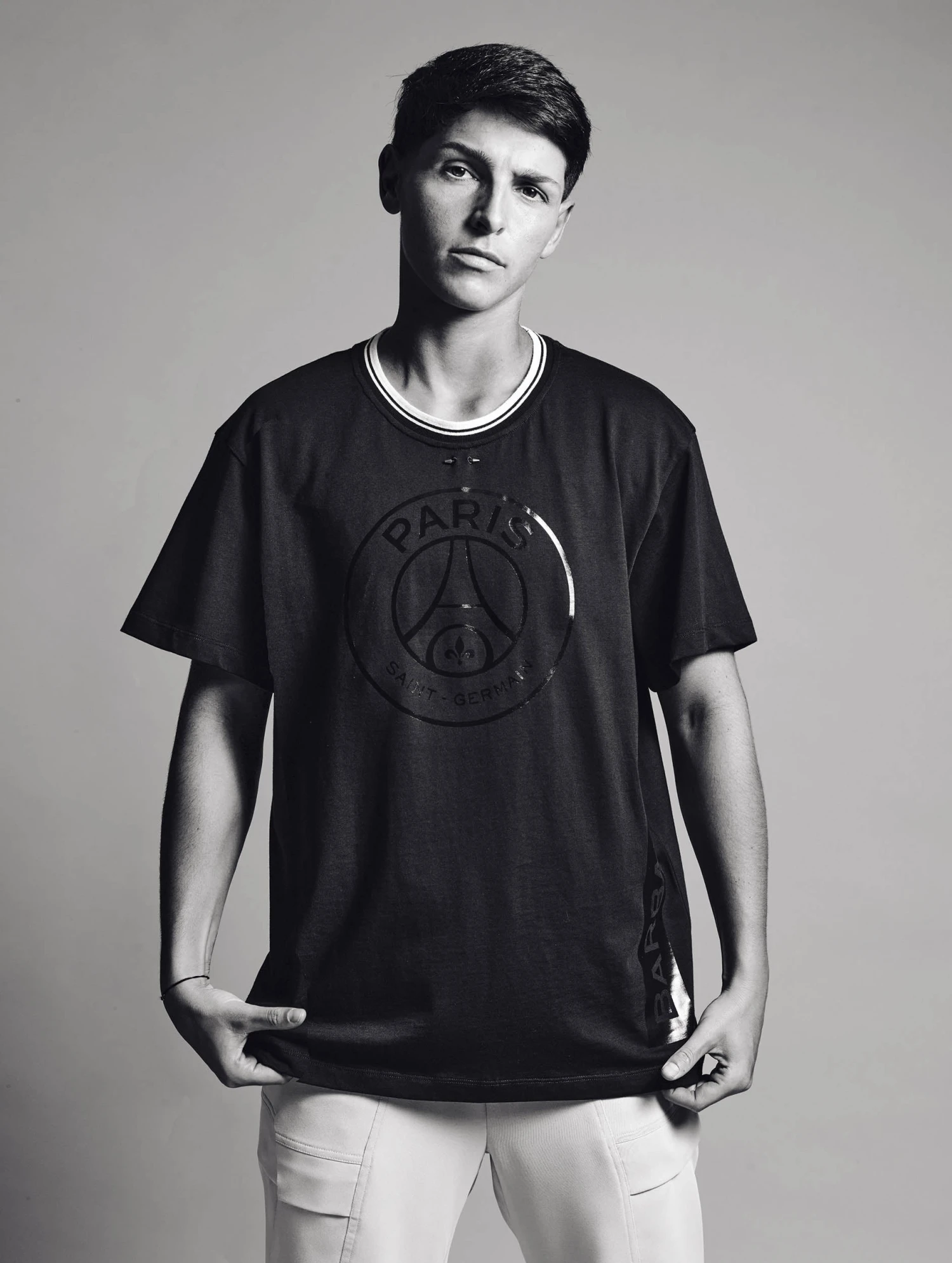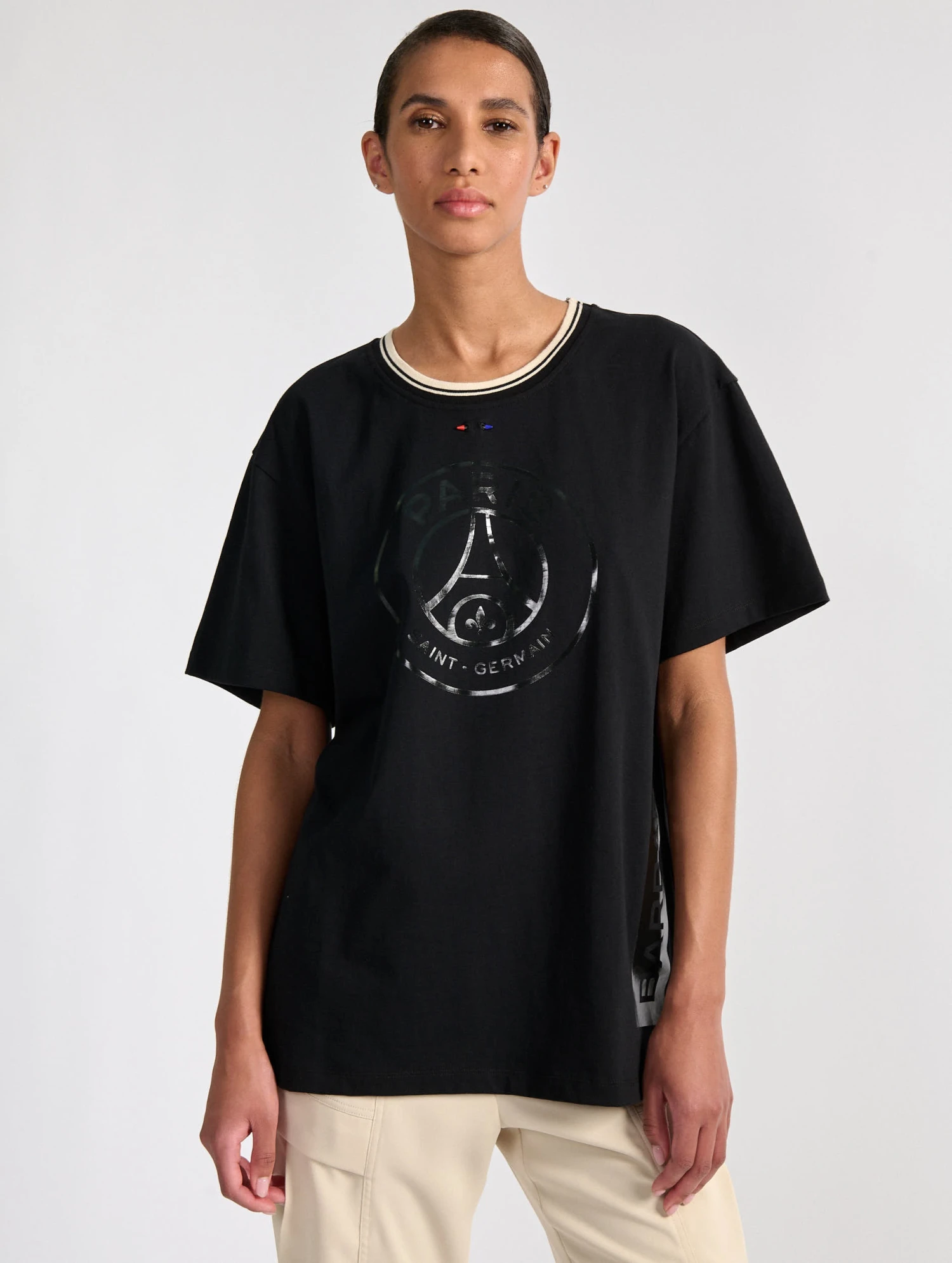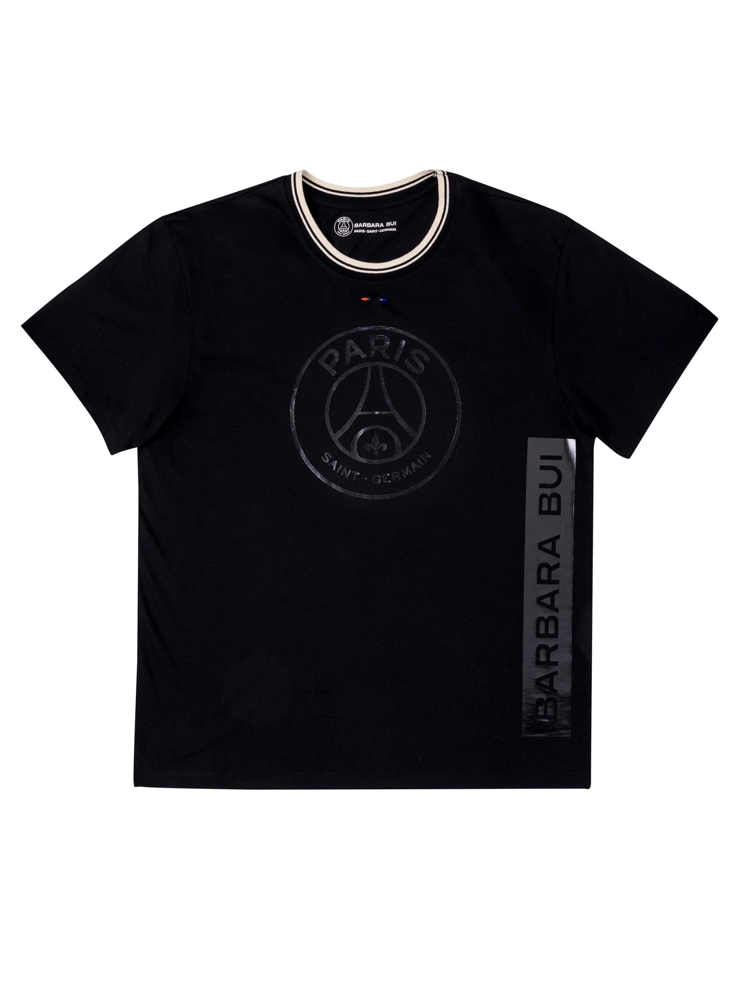 Tee-shirt manches courtes en coton noir. Sérigraphie ton sur ton sur le devant et le côté. Sous l’encolure, piercing en métal laqué aux couleurs du PSG. Ce tee-shirt est issu de la collaboration Barbara Bui x PSG et compose la tenue officielle de l’équipe féminine du Paris Saint-Germain.