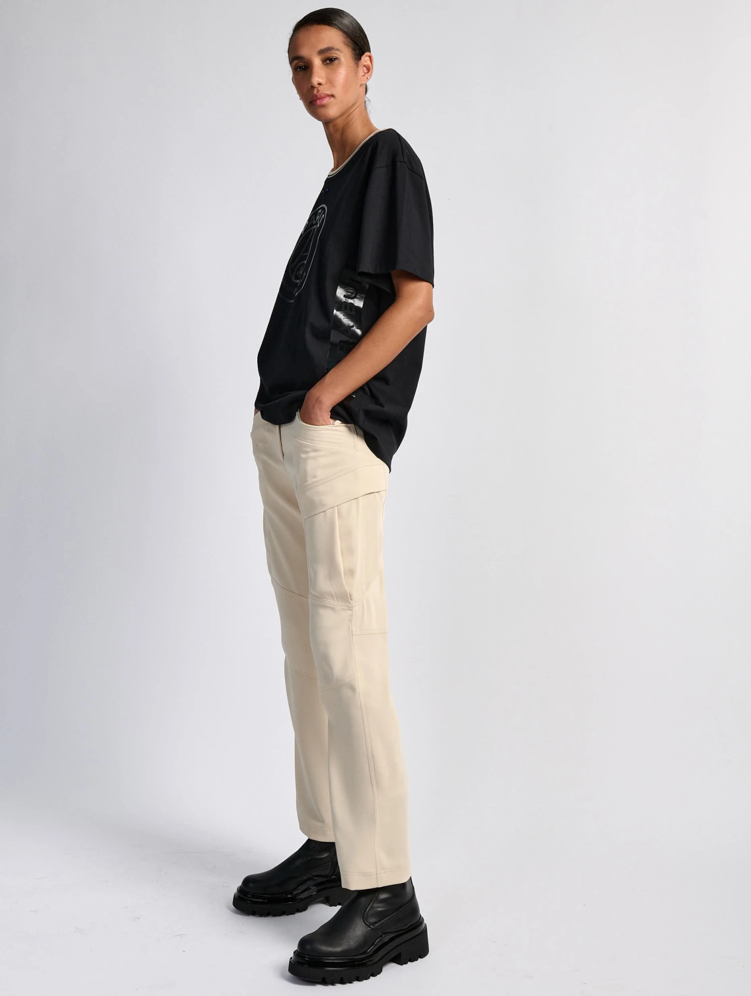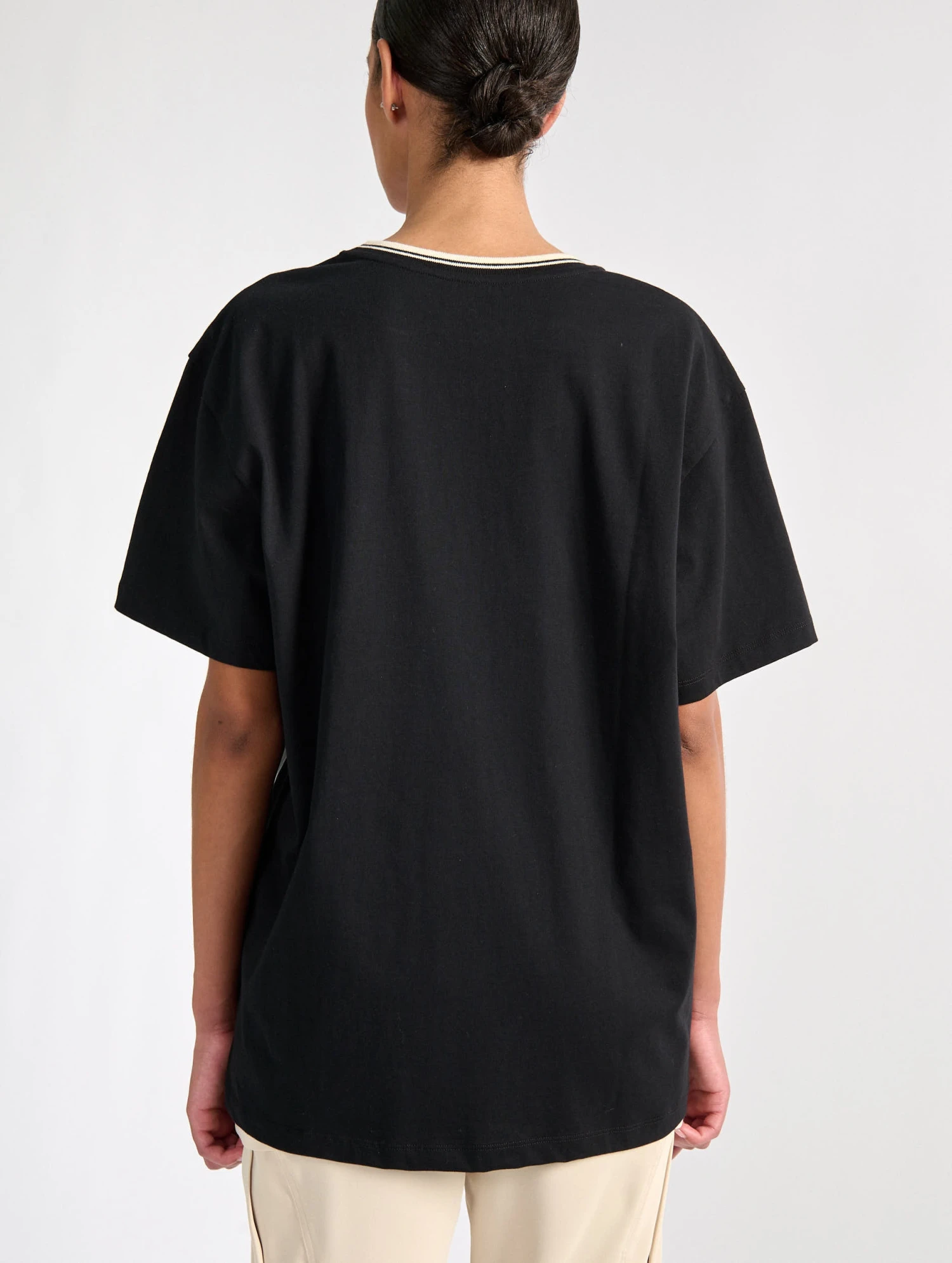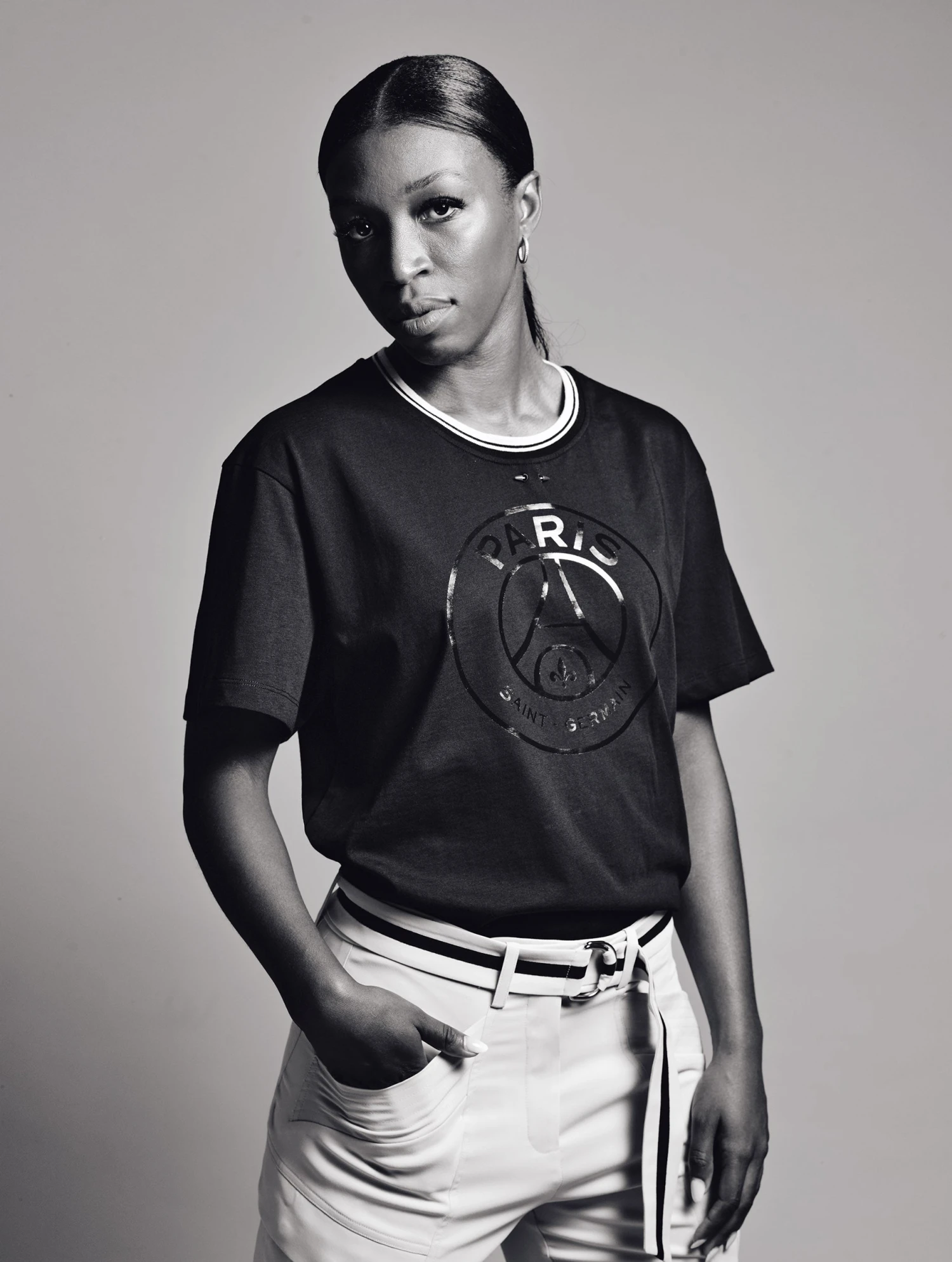 Tee-shirt manches courtes en coton noir. Sérigraphie ton sur ton sur le devant et le côté. Sous l’encolure, piercing en métal laqué aux couleurs du PSG. Ce tee-shirt est issu de la collaboration Barbara Bui x PSG et compose la tenue officielle de l’équipe féminine du Paris Saint-Germain.