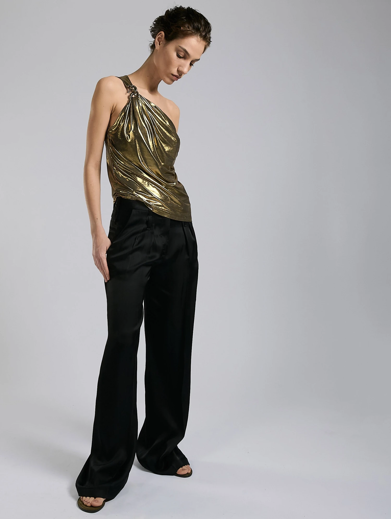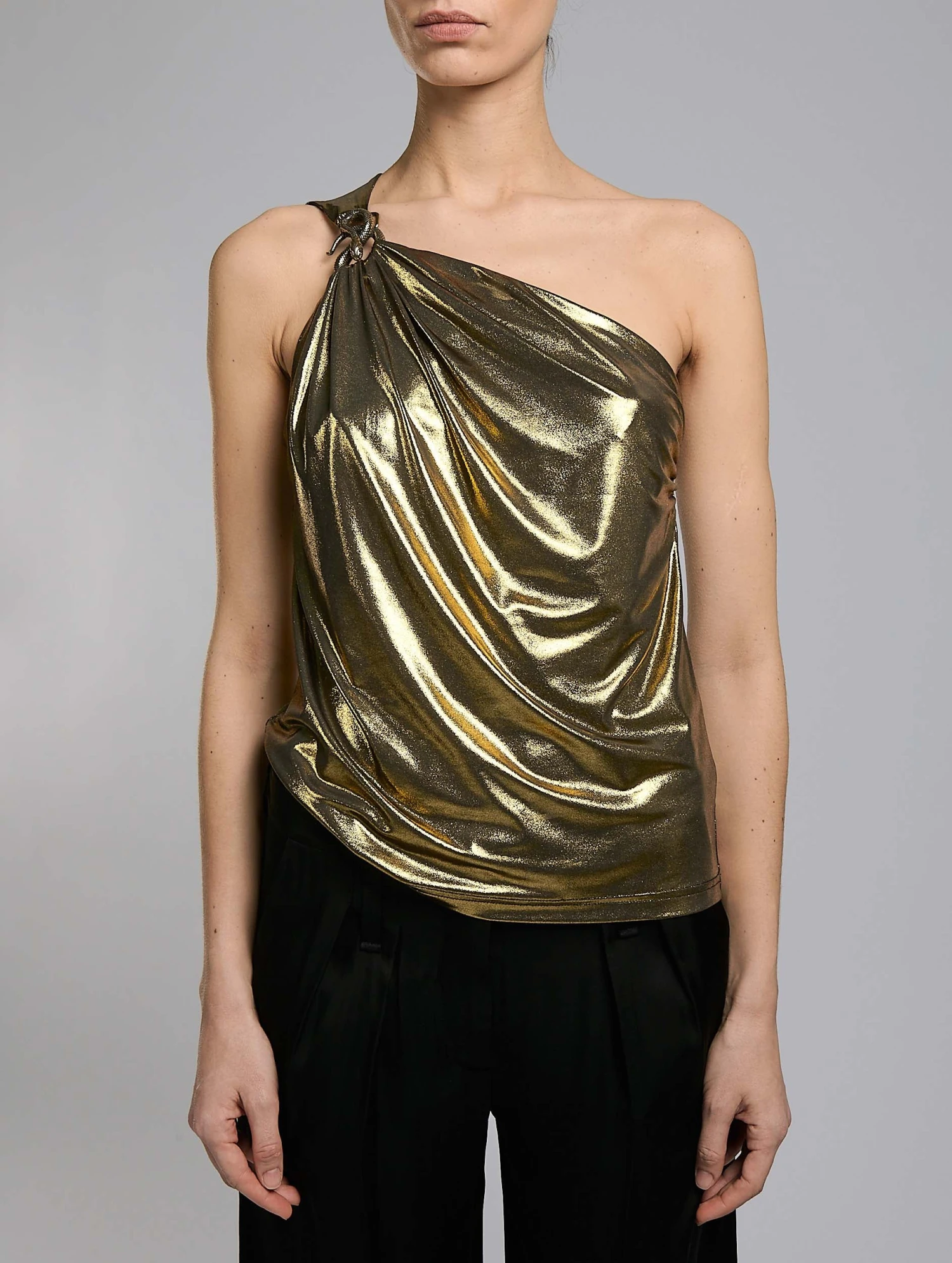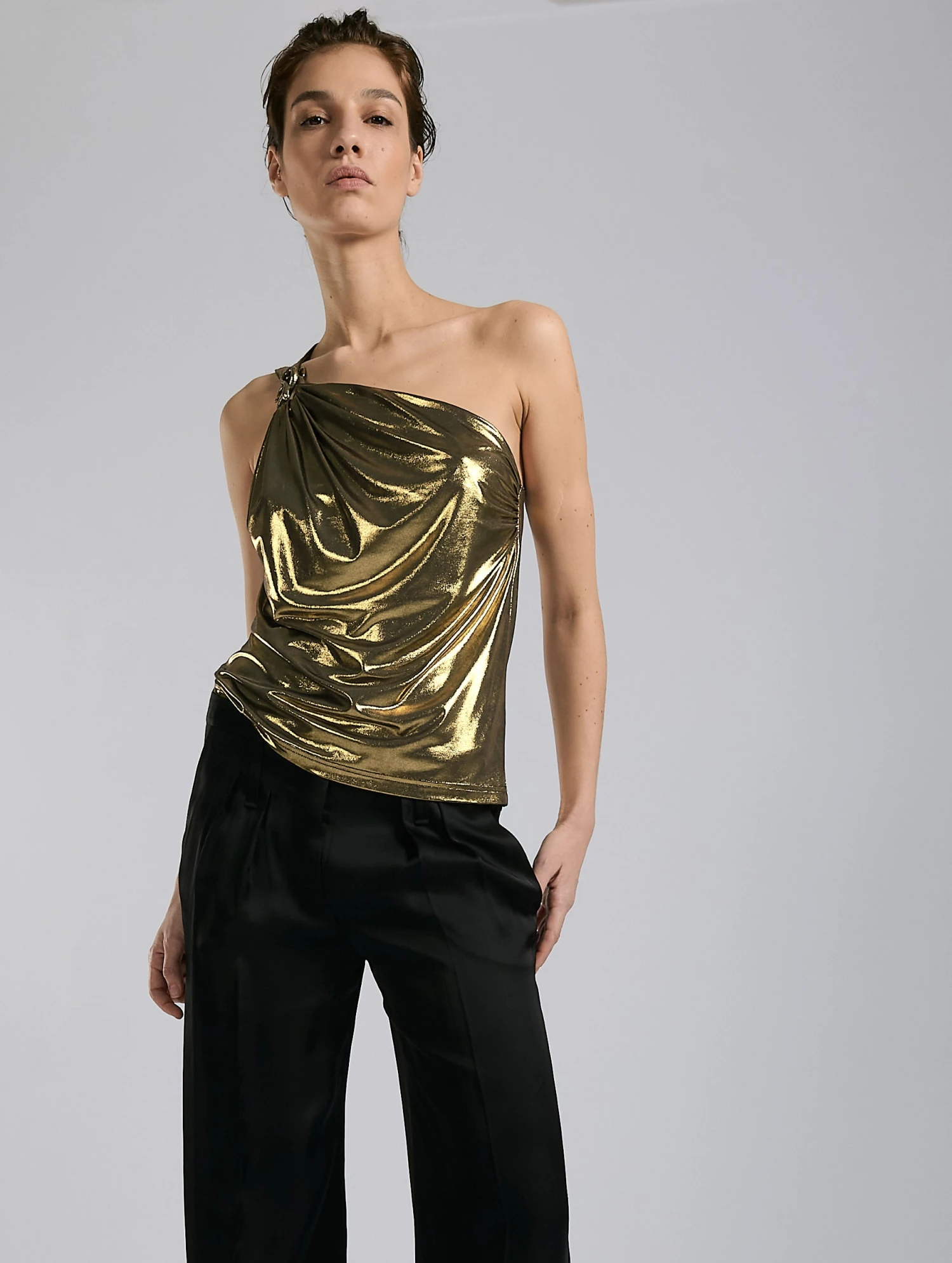 Cet élégant top asymétrique se drape sur le corps pour une silhouette nocturne sophistiquée à l’occasion d’une soirée ou d’un évènement habillé. Son emmanchure asymétrique façon amazone est mise en valeur par sa boucle bijou, un détail signature de la Maison qui revisite le motif du serpent, un symbole puissant et évocateur cher à Barbara Bui. Coupé dans un jersey métallisé couleur d’or, ce top vous assure de prendre toute la lumière.