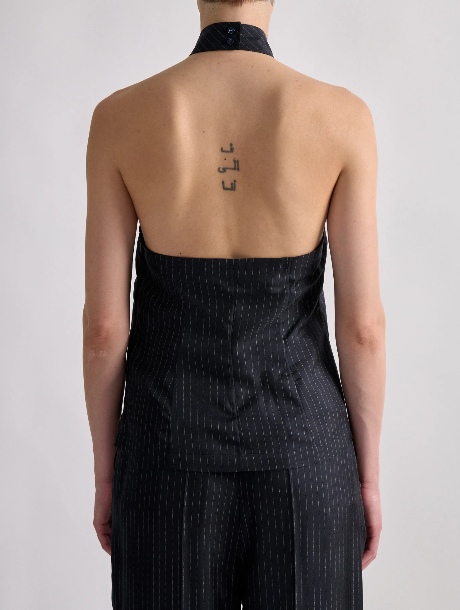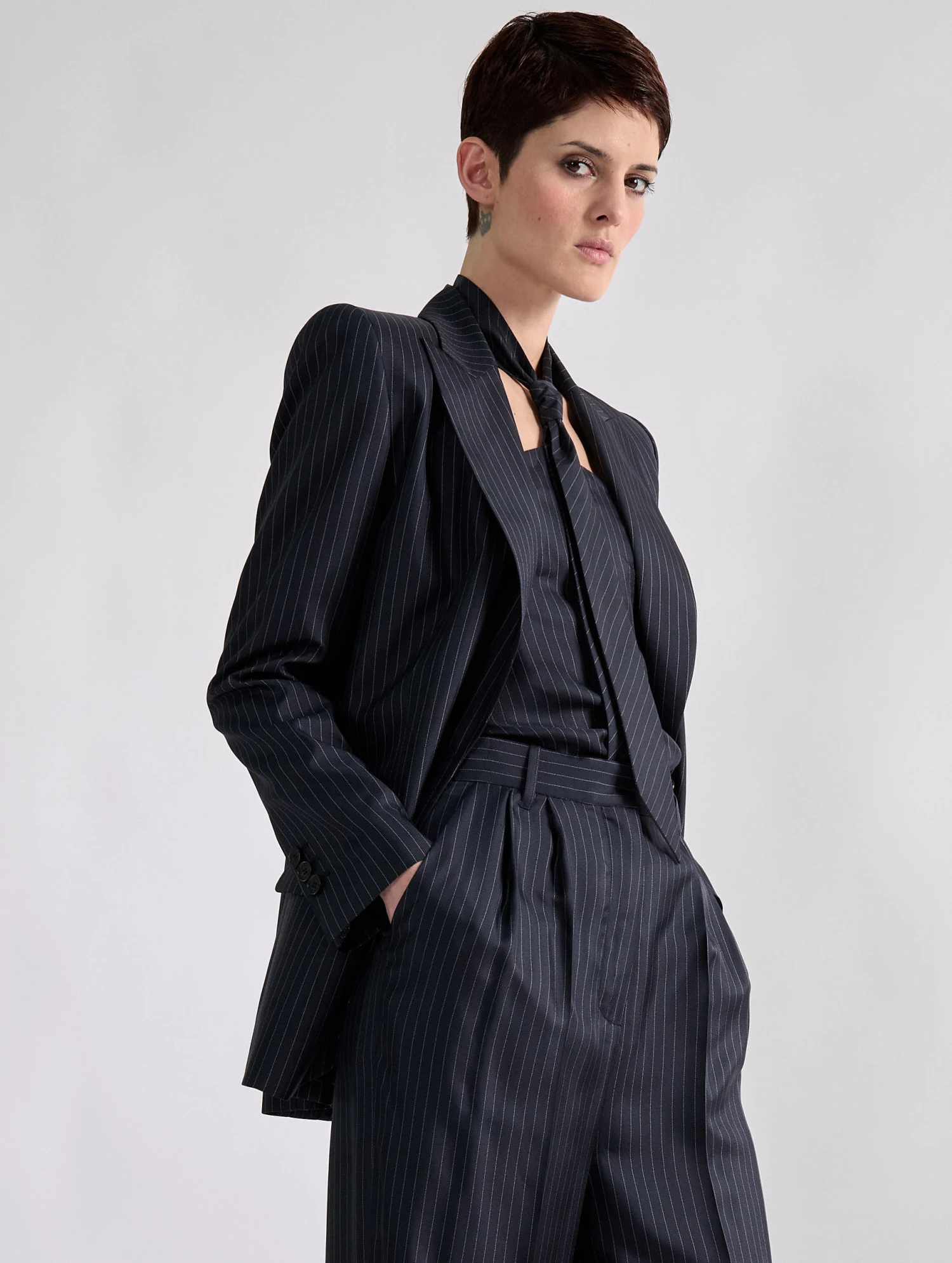 Incarnation du mélange des genres cher à Barbara Bui, ce top en soie comporte une cravate intégrée pour une allure androgyne qui ne manque pas de féminité. Retenue par un petit col doté de 2 boutons, ce top révèle un dos nu à la sensualité affirmée. La soie marine rayée s’inspire des costumes italiens auxquels elle prête sa douceur et sa fluidité. Porté en total look avec le pantalon et la veste de costume assortis, ce top cravate signe une allure « sharp and cut », du jour au soir.