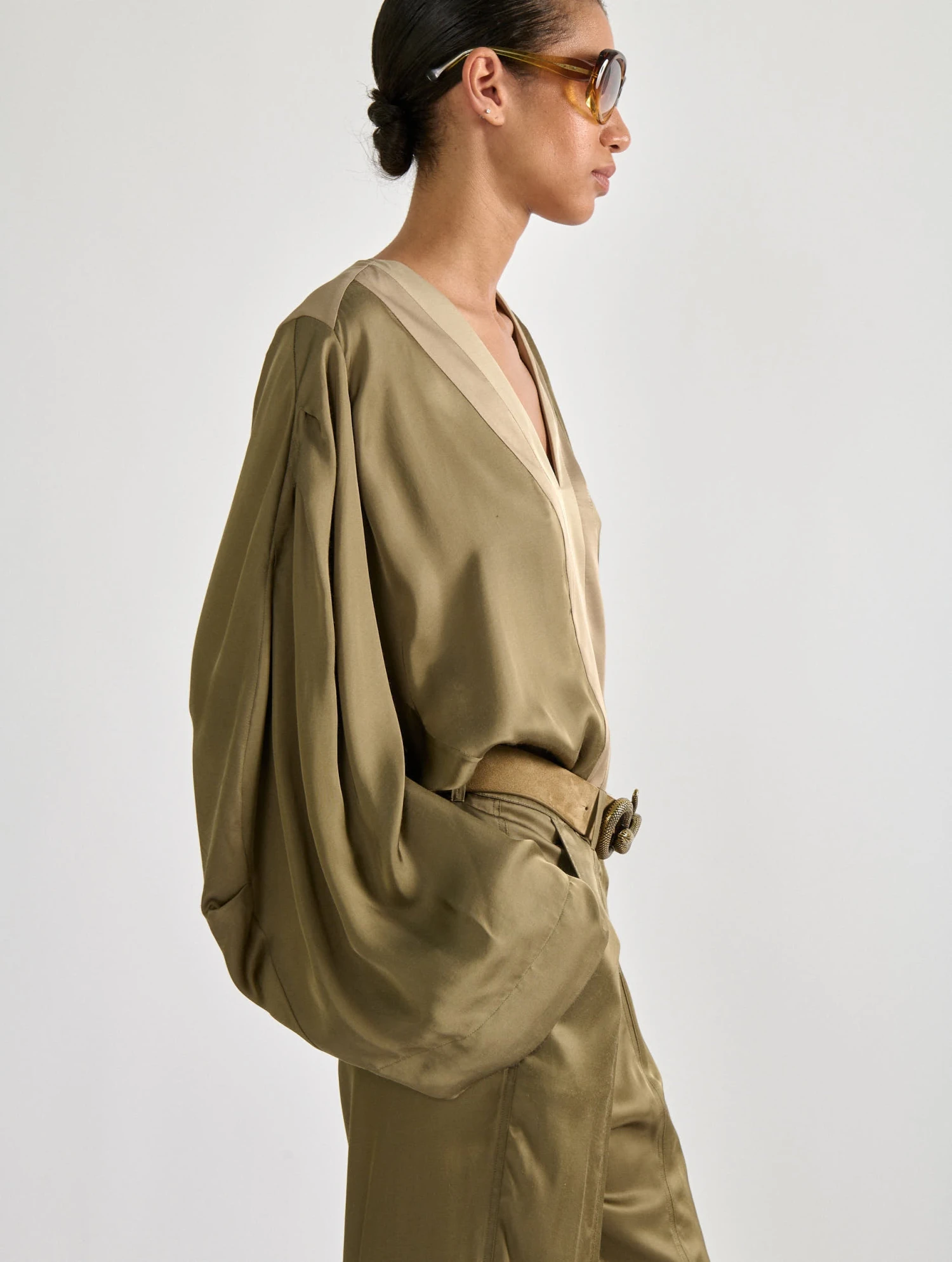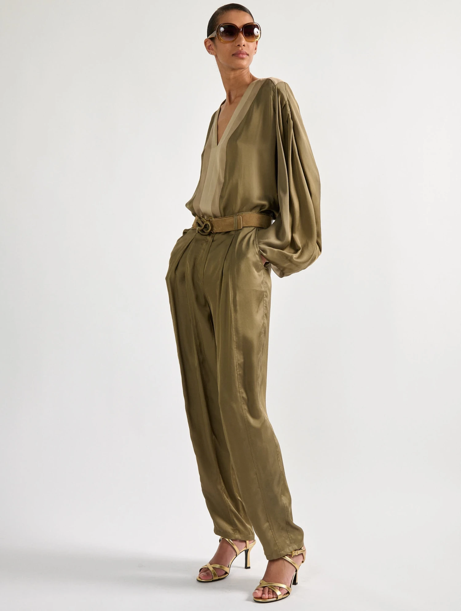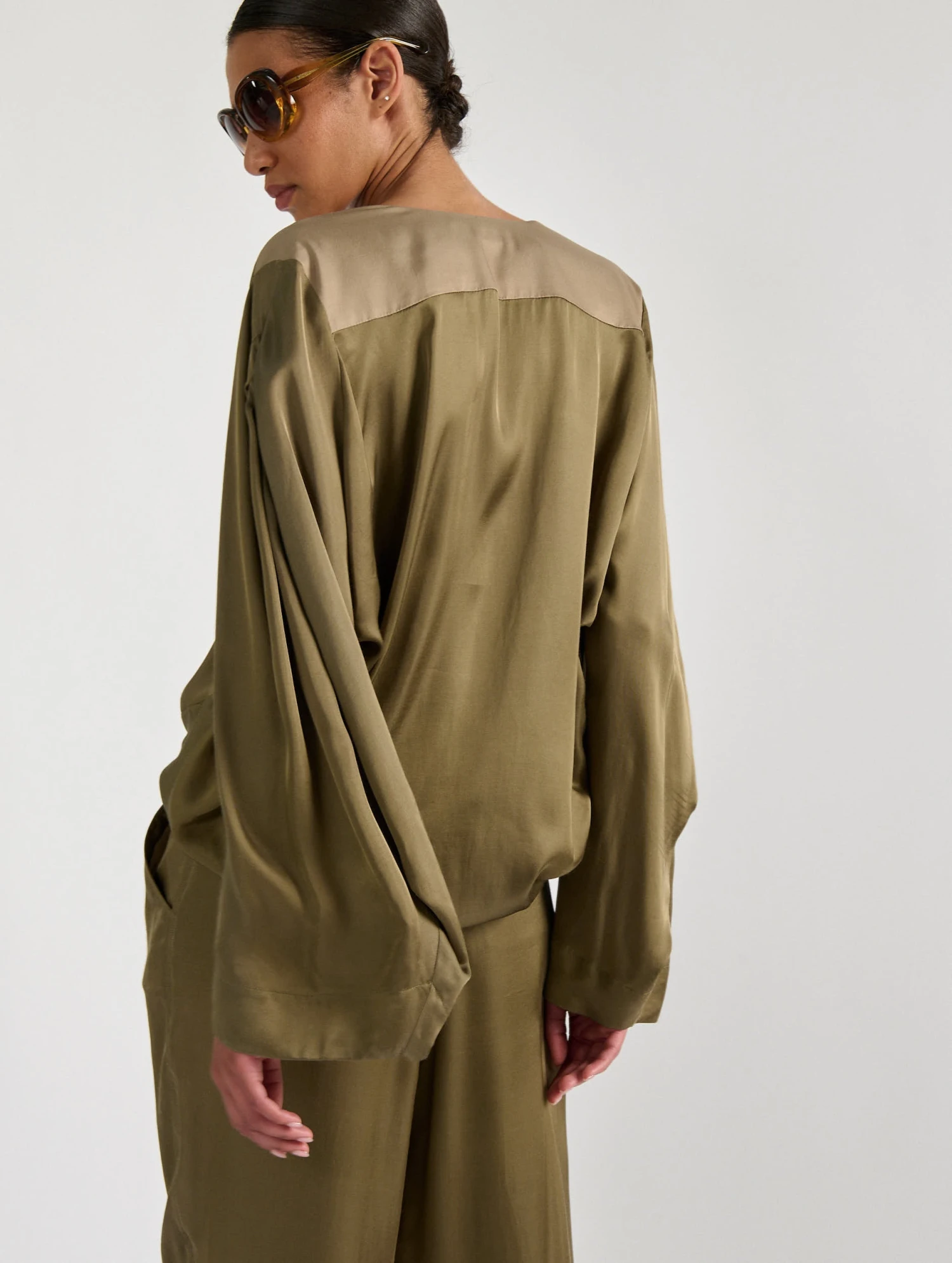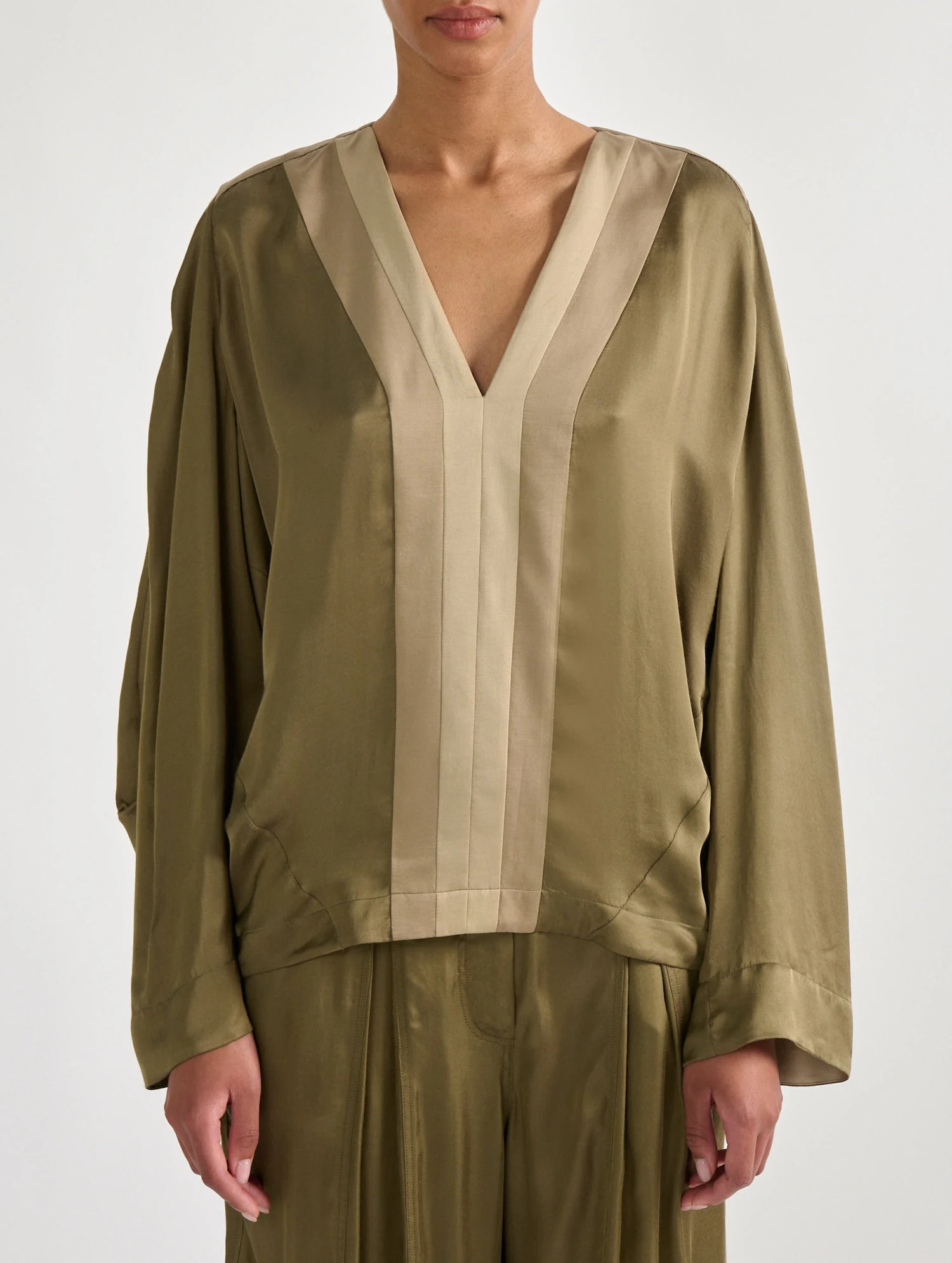 Ce top fluide au toucher soyeux présente une encolure travaillée bi-colore qui apportera une touche de contraste et de fantaisie aux looks de la saison. Dans son coloris kaki ponctué de touches crème et or, ce top à manches larges façon kimono se marie à la perfection aux accessoires en cuir suédé ou sandales en cuir gold. Portez ce haut avec le pantalon à plis assorti pour un effet combinaison confortable pantalon éminemment féminin.