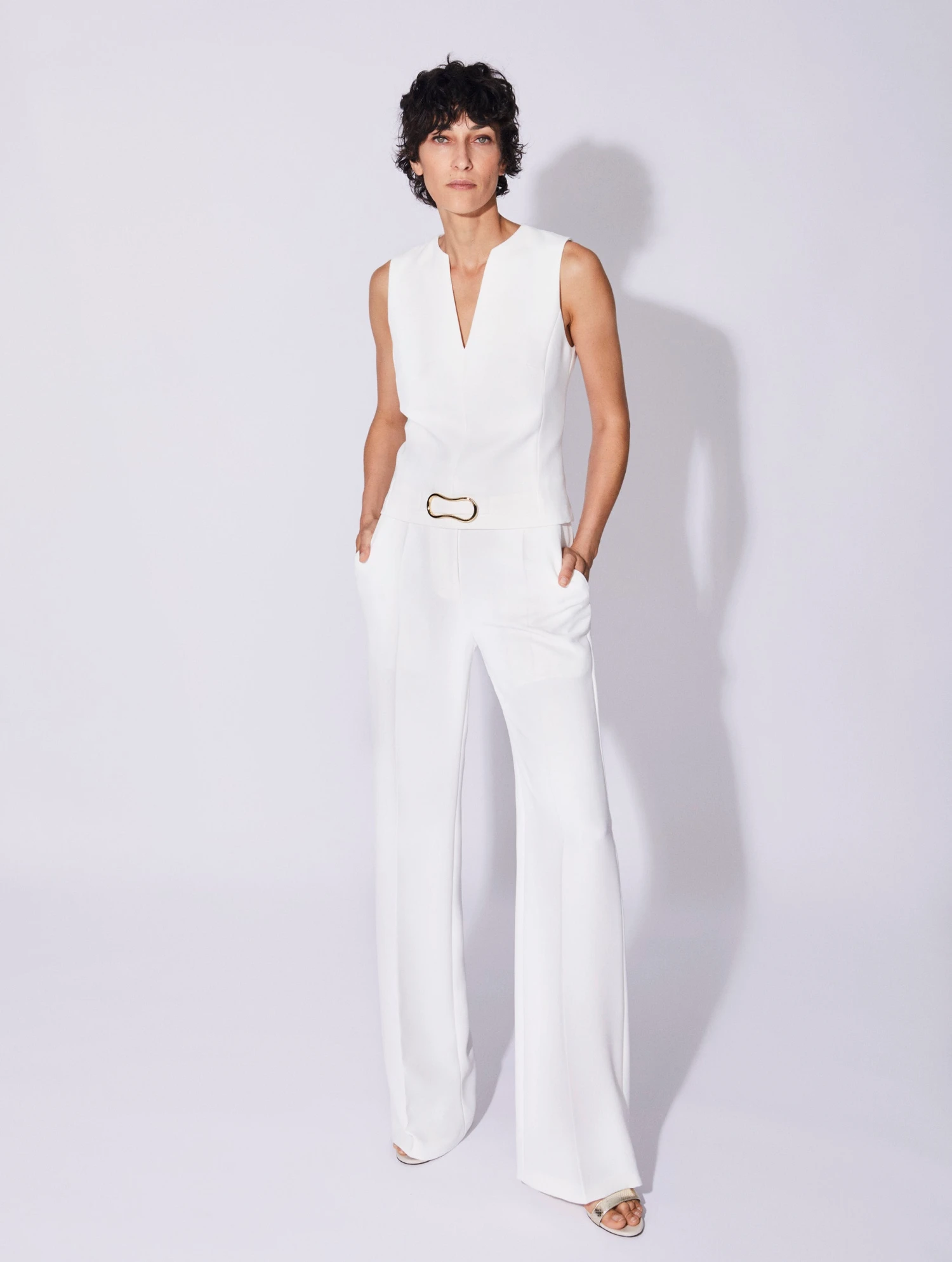 Ce top sans manches décliné dans un blanc immaculé ou un doux coloris tilleul est un allié essentiel de nos looks favoris du printemps-été. Son crêpe fluide et confortable en fait une pièce idéale pour passer aisément du bureau à une soirée. Une boucle bijou en métal doré souligne le raffinement de ce haut femme. Au dos, en bas de pièce, un zip invisible permet d’enfiler ce top sans manches aisément mais aussi d’en ajuster le style en le portant légèrement entrouvert si le coeur vous en dit.