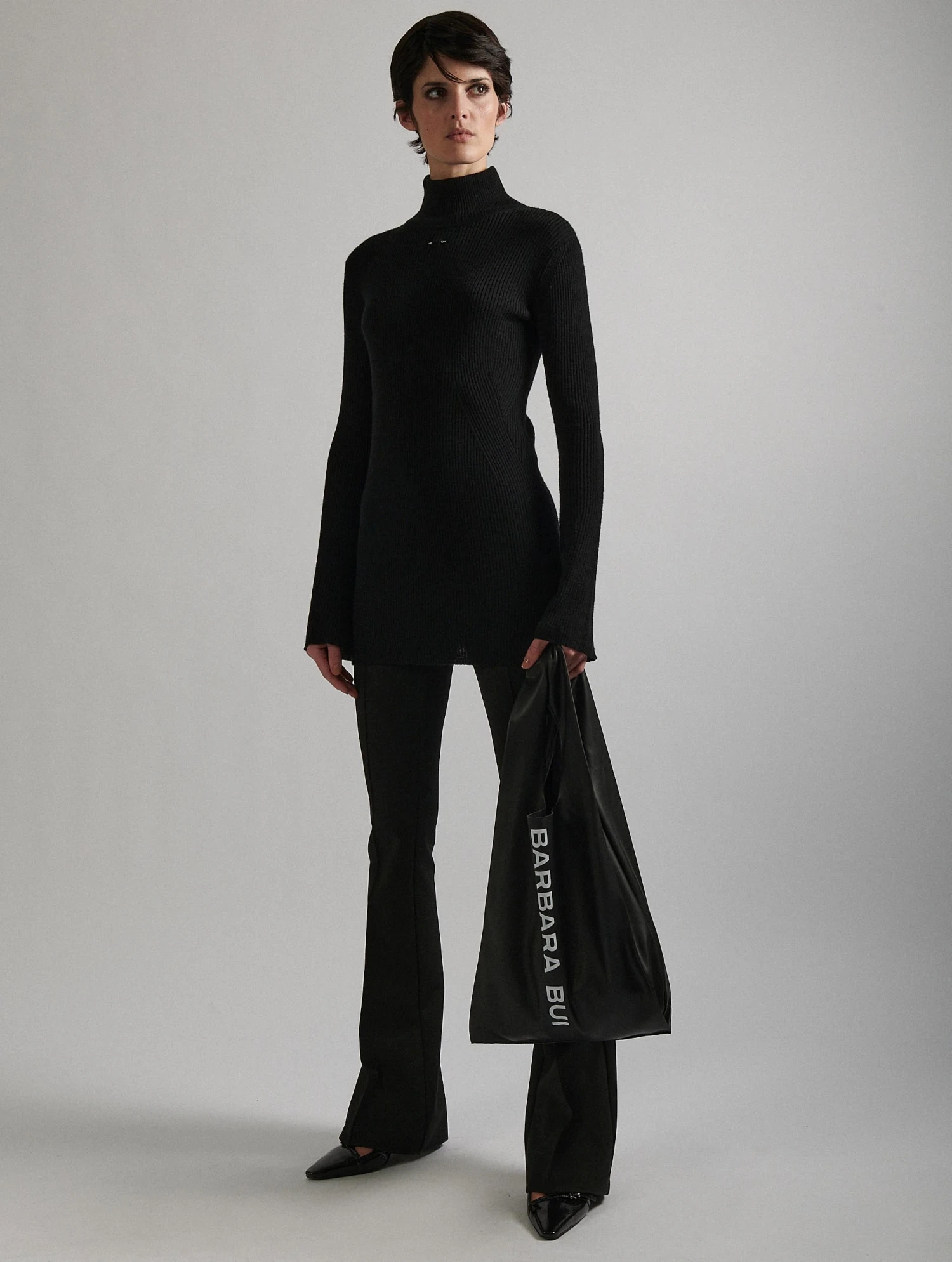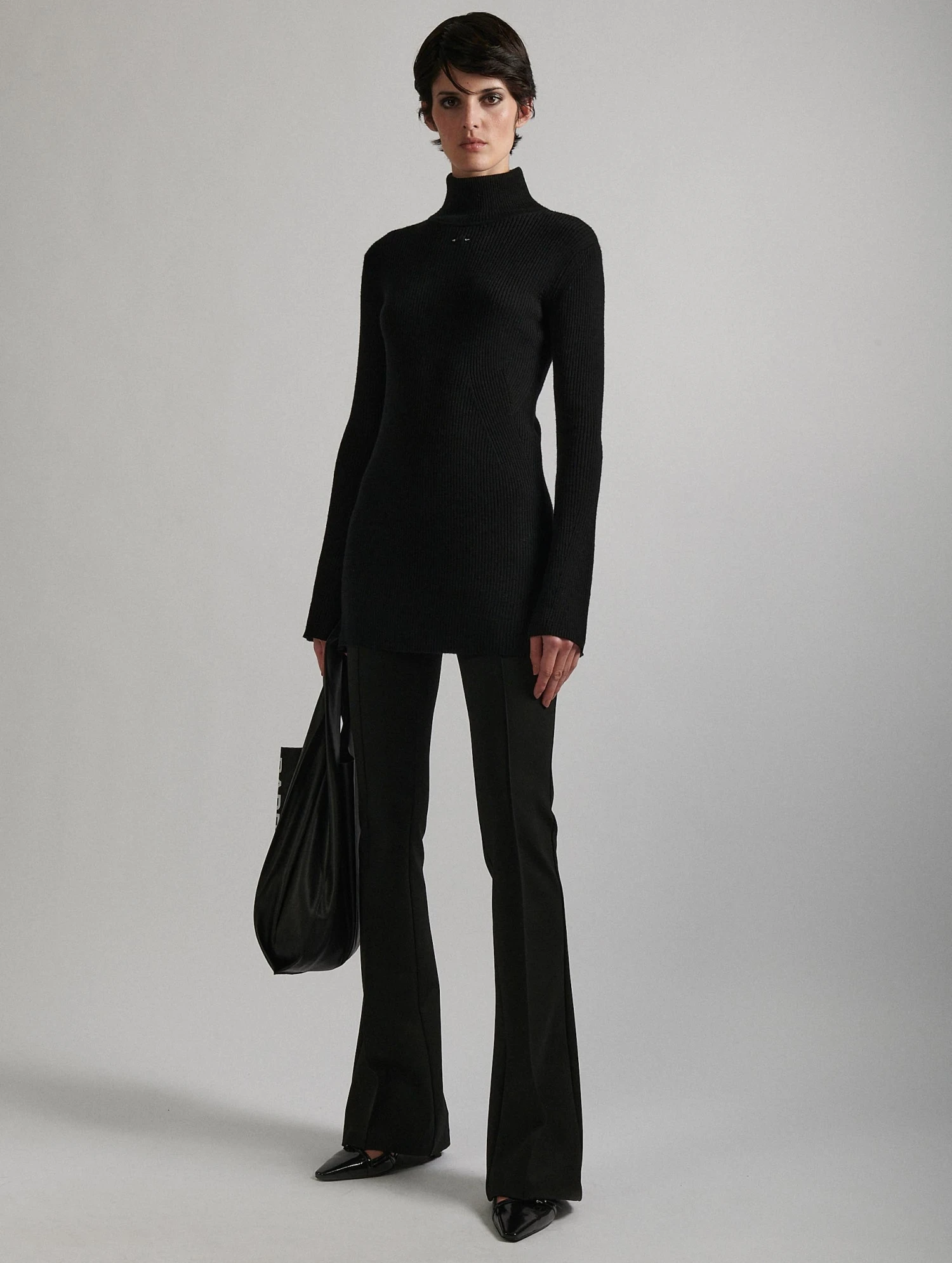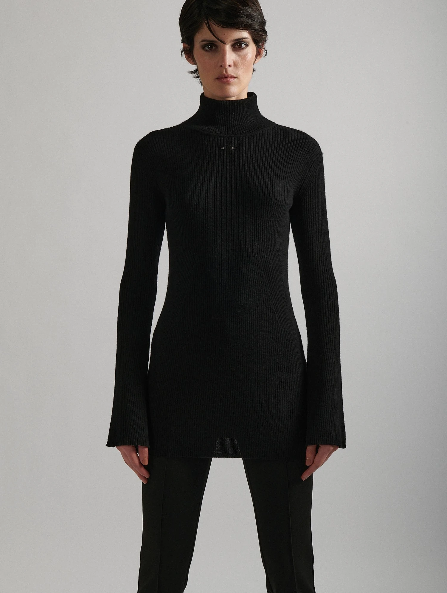 Ce pull tunique en laine mérinos garantit un tombé seyant grâce à son porté près du corps, sa maille côtelée et son col roulé. Proposé en gris ou en noir, il arbore notre iconique piercing en métal argenté, un détail amovible avec lequel jouer à l’envie. Détail féminin, ses poignets rallongés sont délicatement fendus. Il est notamment parfait porté avec nos caleçons bootleg en jersey milano, pour une allure rétro.
