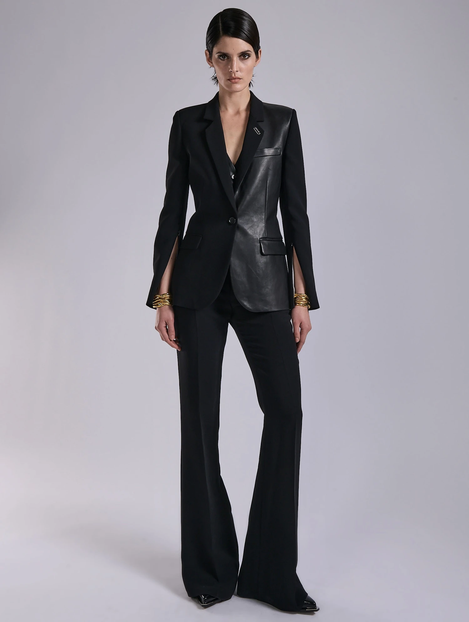 Cette veste cintrée joue la carte du contraste dans un duo intense de crêpe noir et de cuir lisse, témoignage du savoir-faire tailleur de nos ateliers. Sa coupe « sharp and cut » ajustée souligne la silhouette, tandis que le mix de matières apporte une profondeur visuelle et un supplément d’audace. Portée à même la peau ou sur le gilet de costume assorti, cette veste cintrée incarne une féminité affûtée et audacieuse. Ses poignets zippés, ponctués de discrètes boutonnières offrent une liberté de porté totale. Notre ornement piercing et un passant milainaise en métal argenté parachèvent cette pièce singulière, emblématique du vestiaire rock et affranchi de la maison.