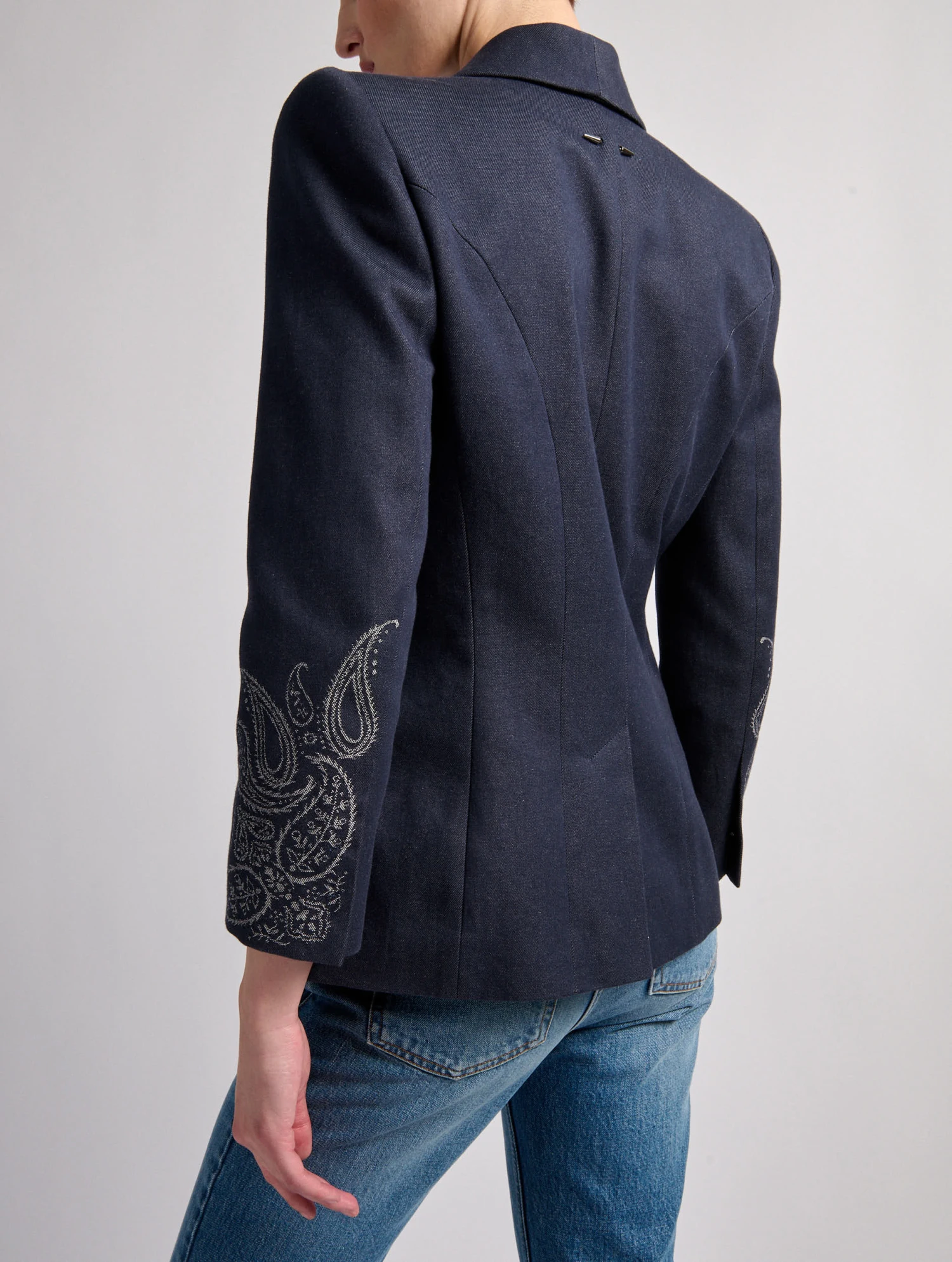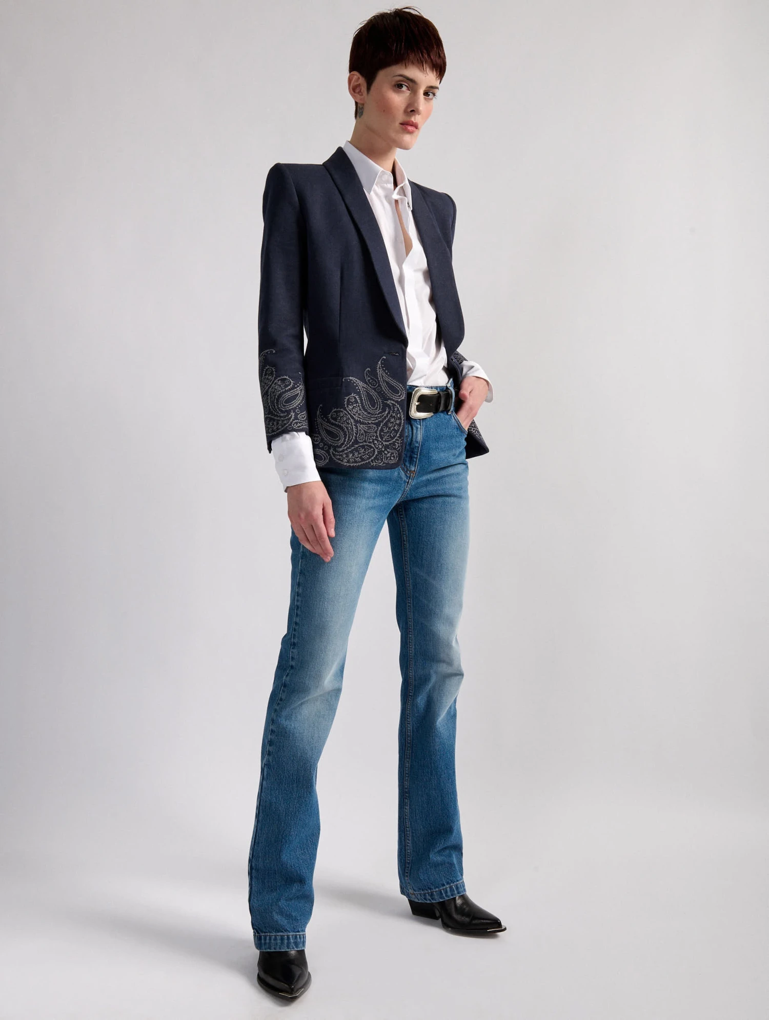 Réalisée dans une étoffe de coton effet denim, cette veste cintrée se distingue par ses motifs bandana en bordures de manches et bas de pièce. Portée avec un jean ou avec un pantalon de costume, cette veste à col châle signe une allure tendance à l’élégance subtilement décontractée.