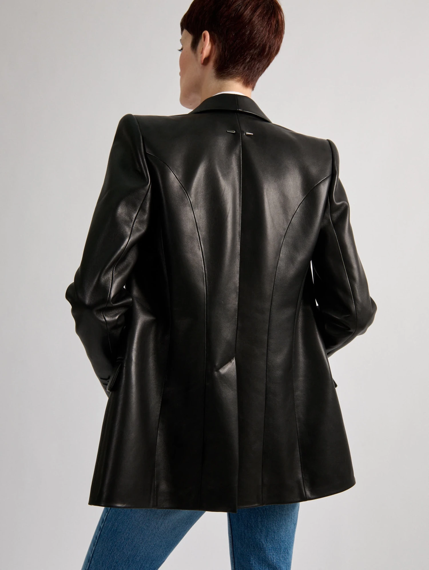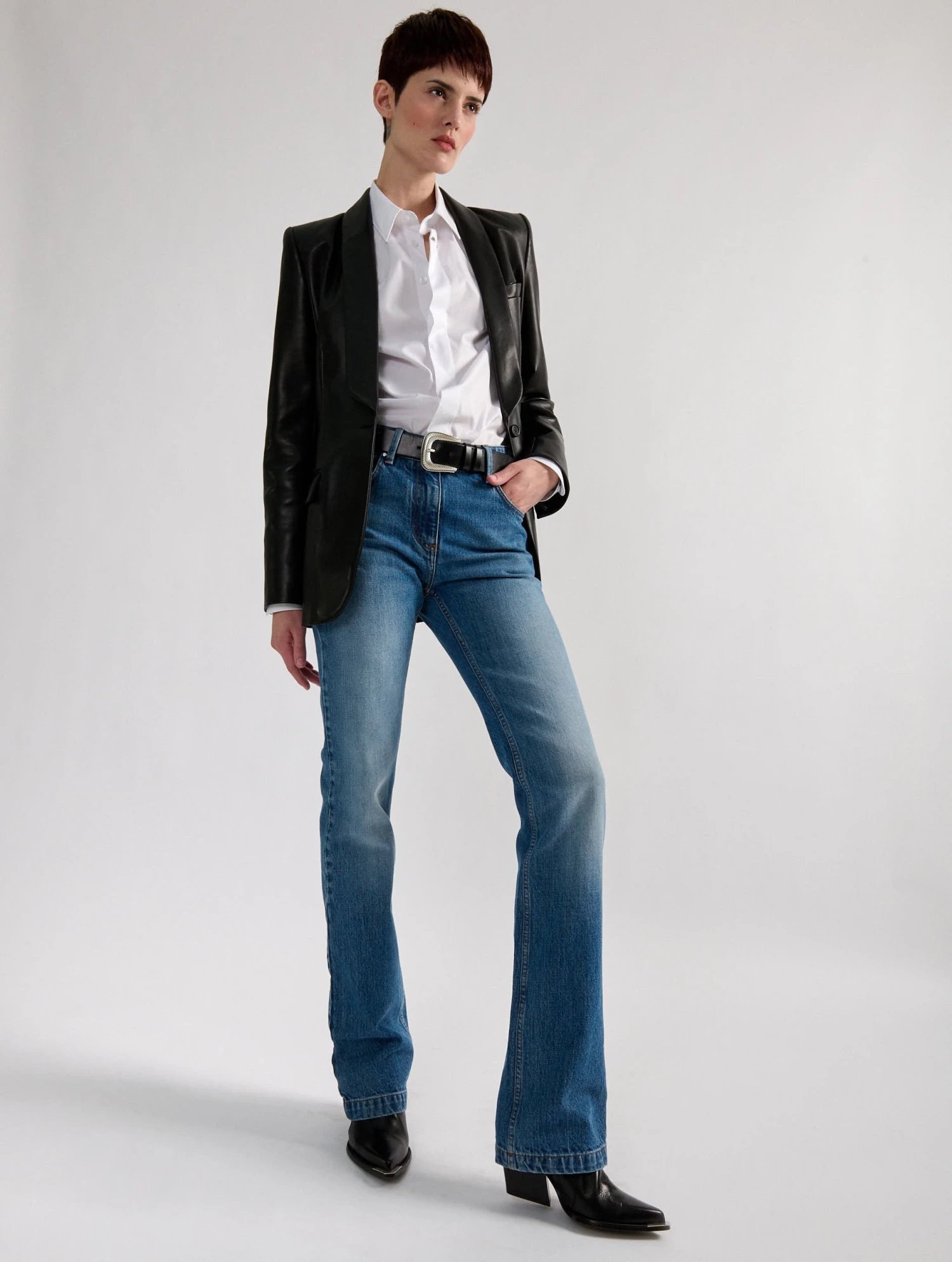 Avec cette veste blazer, Barbara Bui affirme une nouvelle fois son amour pour le cuir, matière noble oscillant entre attitude rock et sophistication. Confectionnée dans un cuir d’agneau plongé noir, cette veste cintrée met en valeur la silhouette grâce à ses coutures savamment placées. Son col châle minimaliste ajoute à l’élégance épurée de cette pièce à porter avec un pantalon de costume noire pour un look monochrome ou un jean et une chemise en popeline au quotidien.