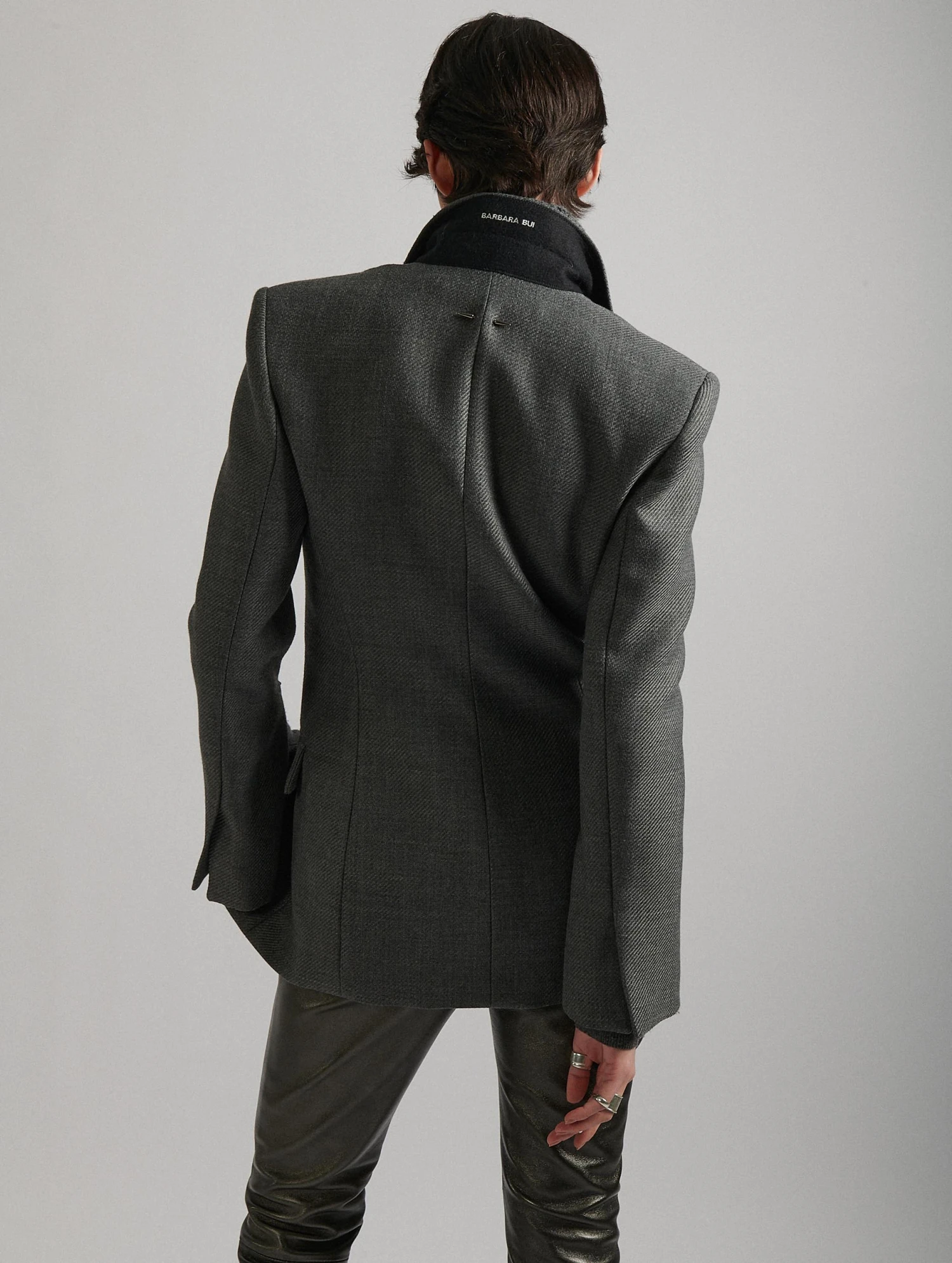 Pièce forte de la collection, cette veste femme se distingue par sa carrure prononcée et sa coupe cintrée pour un tombé structuré des plus seyants. Confectionnée en whipcord, une laine mélangée dotée d’une belle tenue, elle se ferme par un bouton caché. Ses manches longues sont dotées d’un zip invisible permettant de porter cette veste les manches ouvertes, à la manière d’une cape retravaillée. Ses poches passepoilées, son col cranté et sa doublure turquoise soulignée d’un passepoil safran soulignent le savoir-faire sartorial de la Maison. Au dos, notre piercing amovible signature en métal argenté.